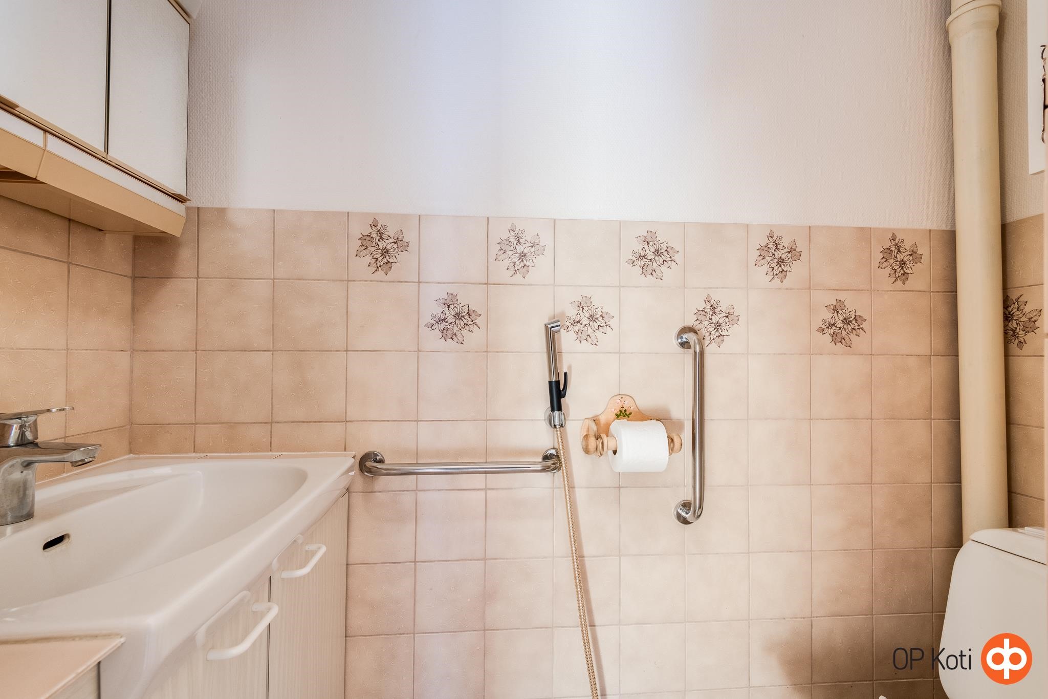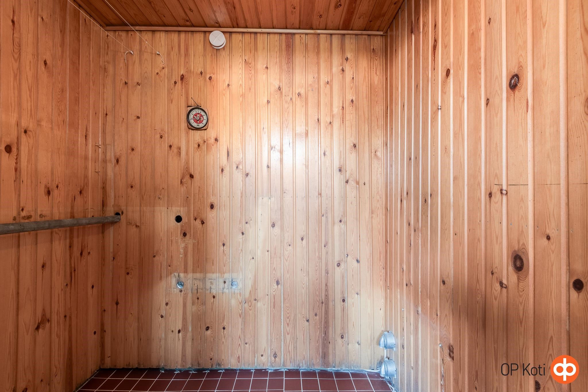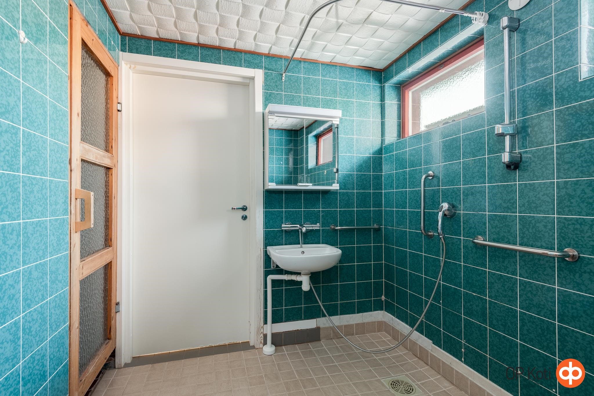 - Sauna Ei kiuasta, eikä lauteita, kylpyhuone, erillinen wc, suihku, peilikaappi, kaapit, allaskaappi, pesukoneliitäntä, lattialämmitys, kiinteät valaisimet.