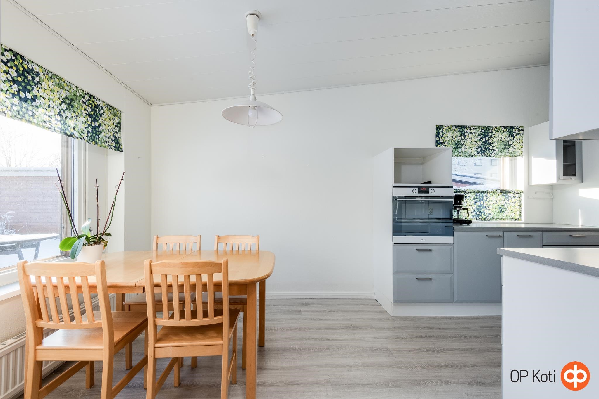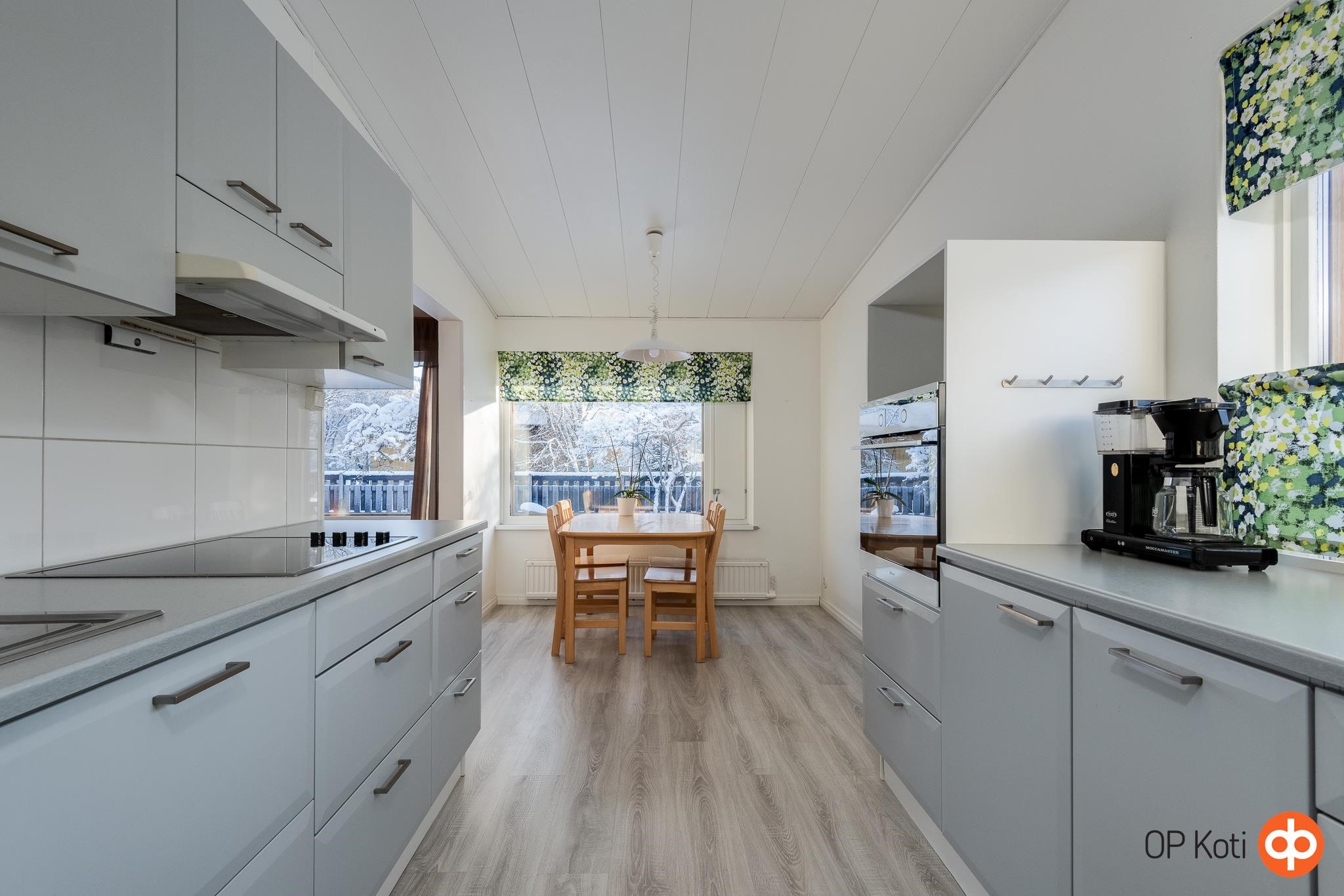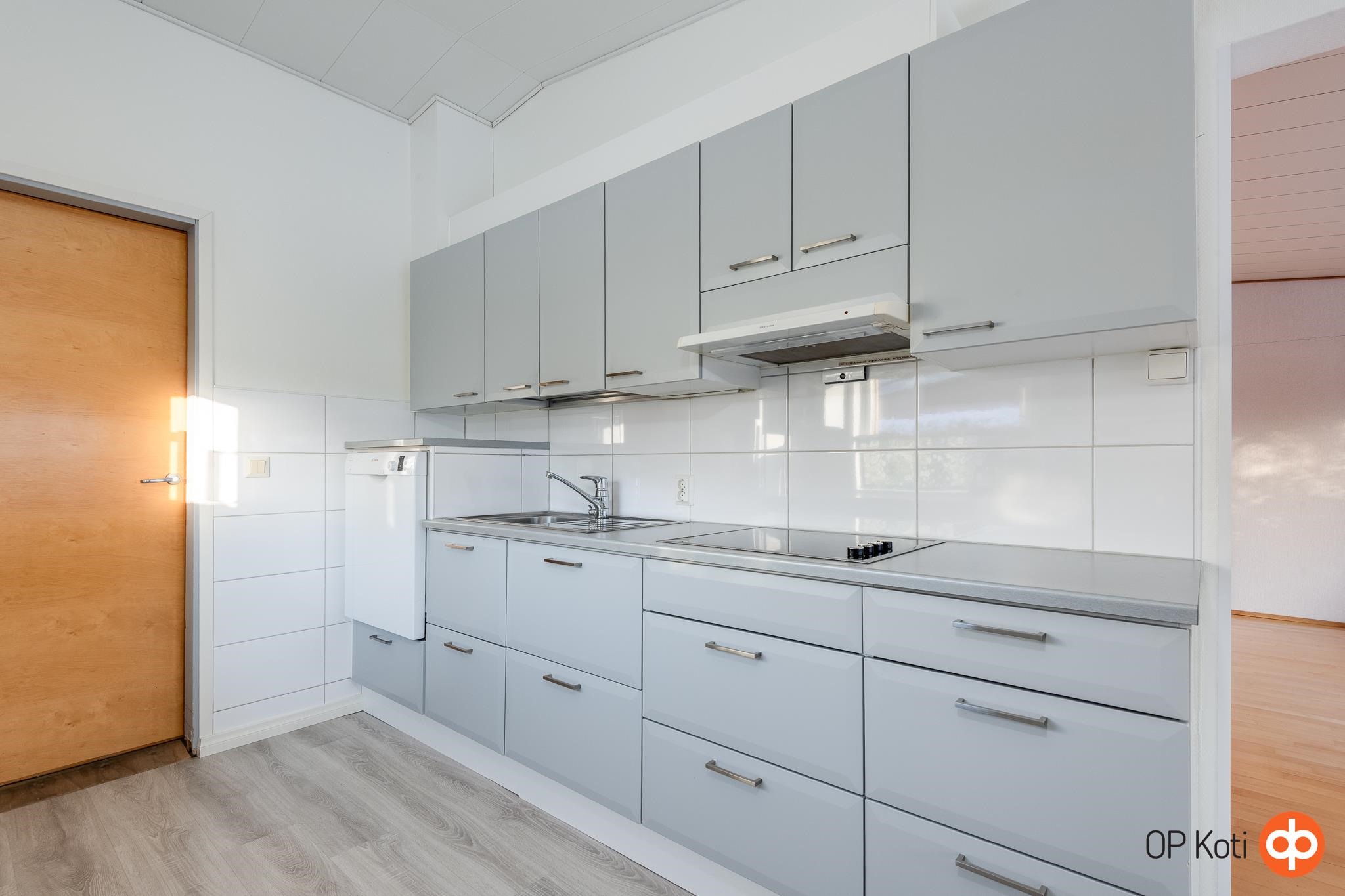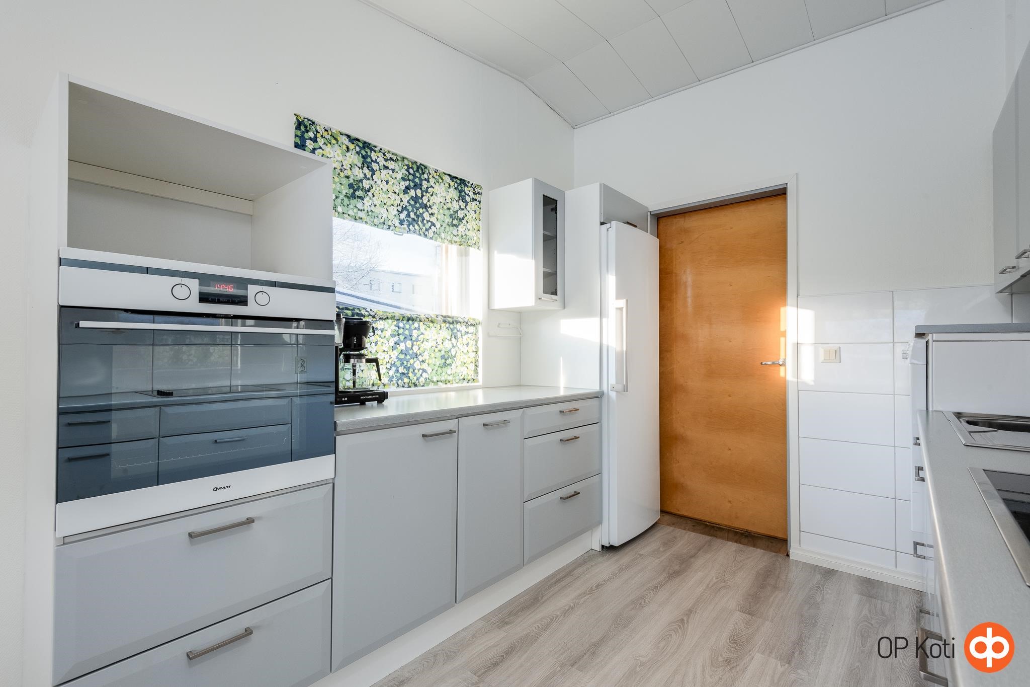 - Jääkaappi, pakastekaappi Takkahuoneessa, erillisuuni, keraaminen liesi (taso), liesituuletin, astianpesukone, kaapistot, kiinteät valaisimet, pöytätasojen materiaali Laminaatti.