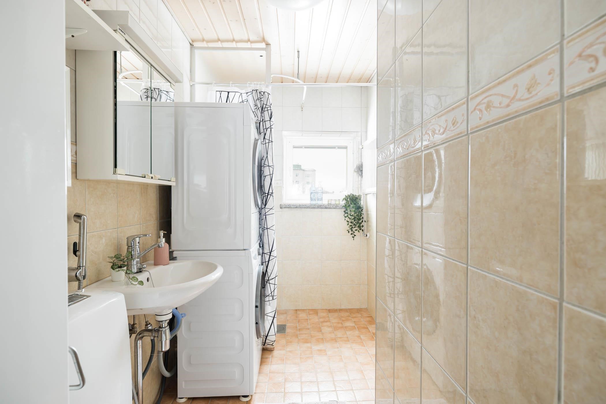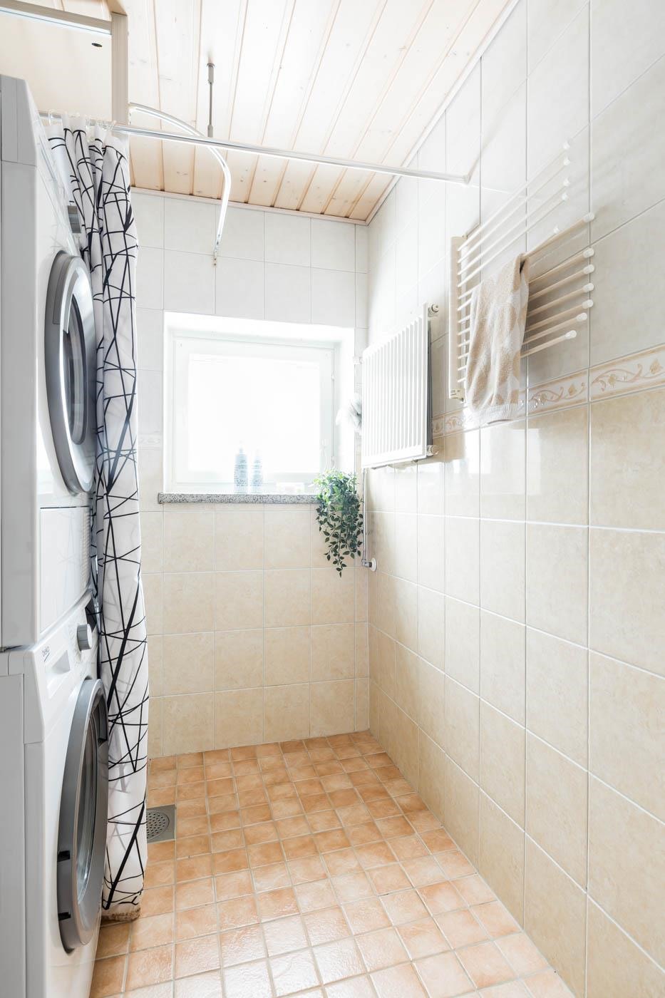 - Kylpyhuoneessa : WC, suihku ja suihkuseinä, peilikaappi, pesukoneliitäntä, lattialämmitys ja kiinteät valaisimet.