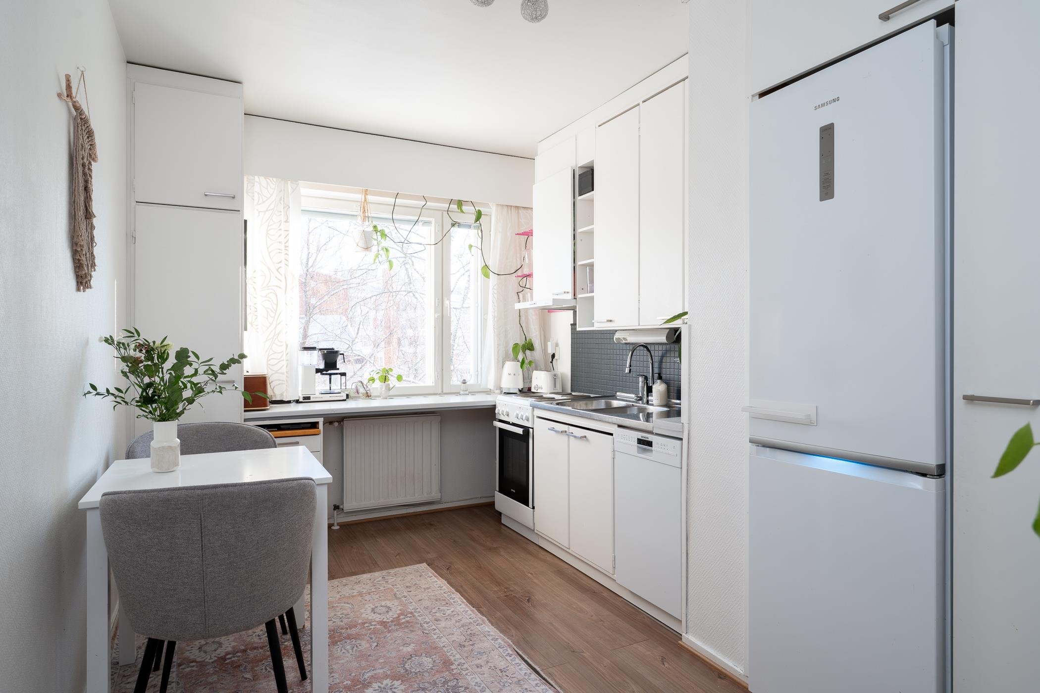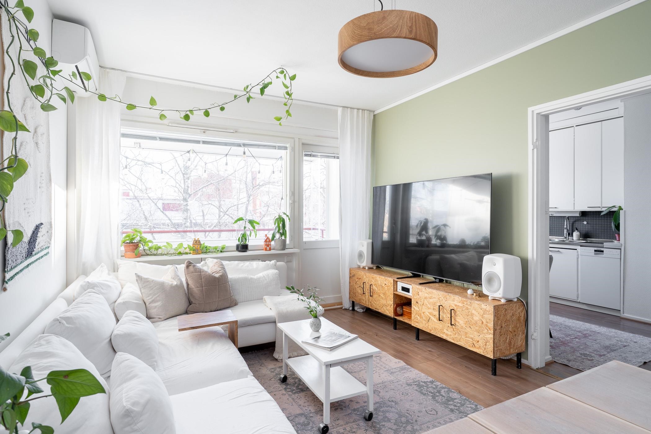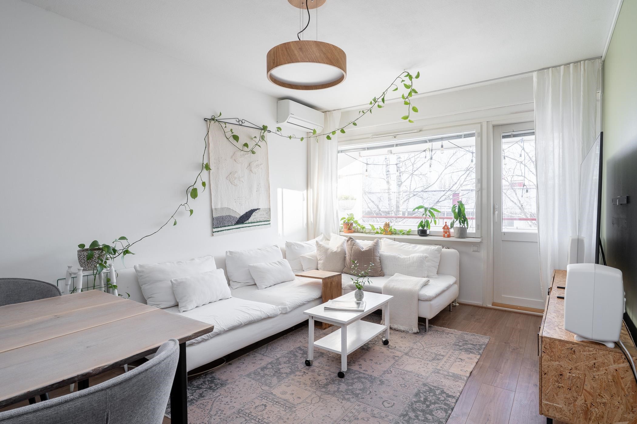 Asunnon 54 neliötä on suunniteltu tehokkaasti, ja huoneistoa on päivitetty vastaamaan tämän päivän vaatimuksia. Keittiössä on käytännölliset säilytystilat sekä jääkaappipakastin, astianpesukone ja lattialiesi. Olohuone ja makuuhuone ovat tilavia ja saavat runsaasti luonnonvaloa. Kauniit laminaattilattiat ja vaaleat seinäpinnat luovat pohjan monenlaisille sisustusratkaisuille. Kylpyhuoneessa on moderni sadesuihku ja suihkuseinä, sekä tilavaraus pesukoneelle. Ilmalämpöpumppu lisää asumismukavuutta ympäri vuoden. Säilytystiloina toimivat vaatehuone ja kellarikomero.