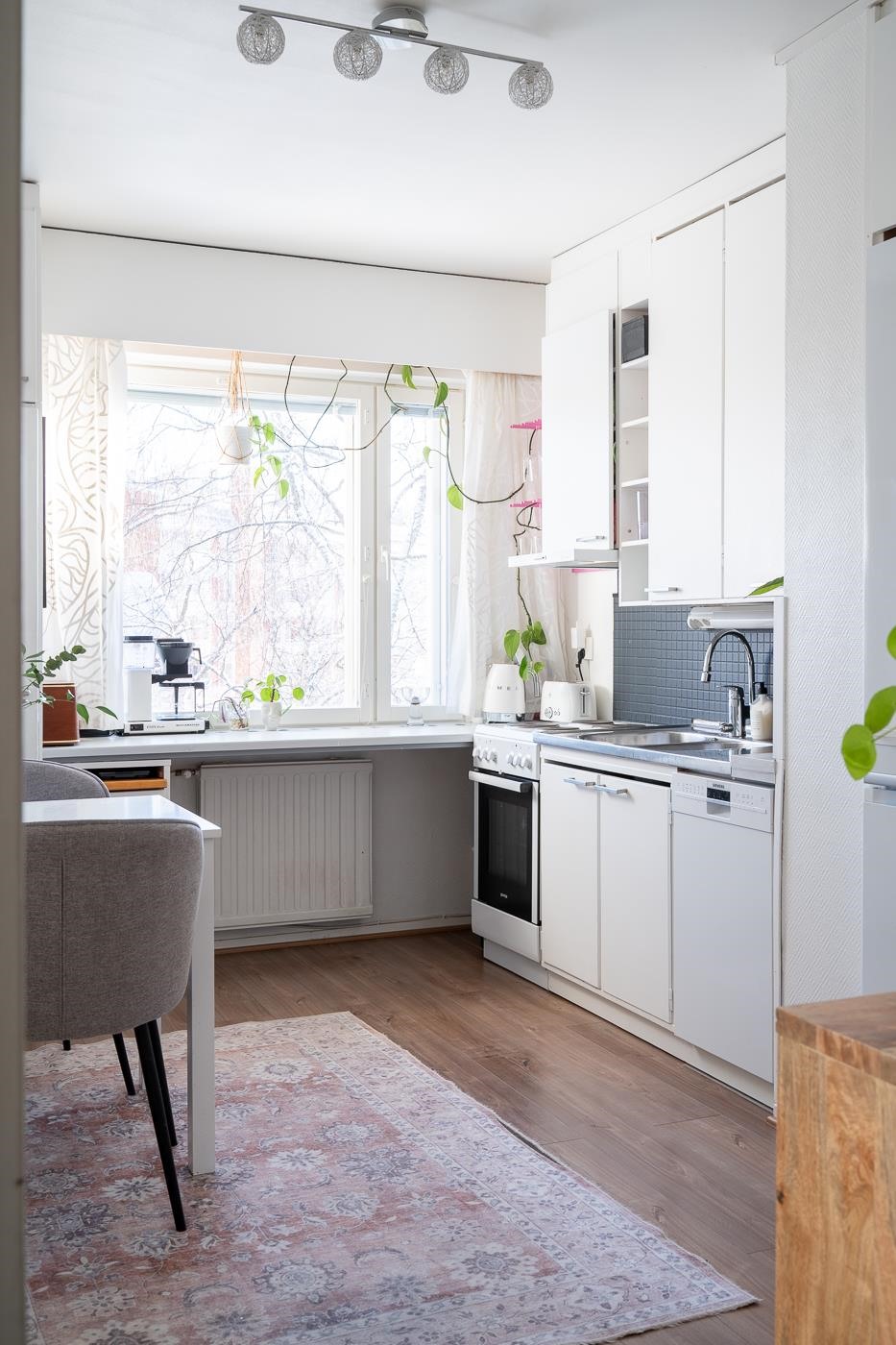 - Keittiön varusteina ovat jääkaappipakastin, lattialiesi, liesituuletin, astianpesukone ja kiinteät valaisimet.