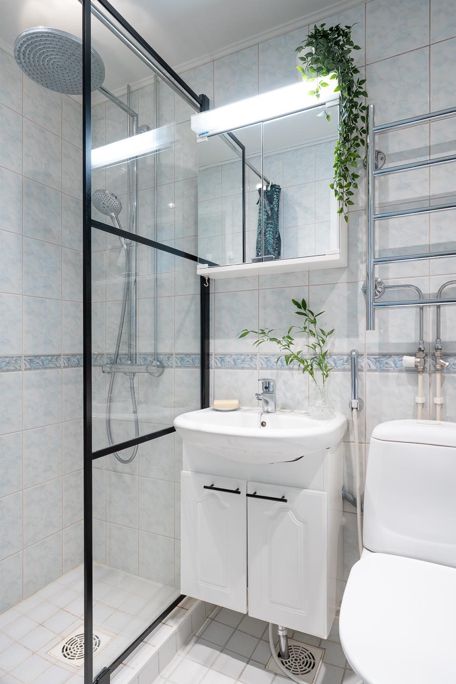 - Kylpyhuoneesta löytyy sadesuihku, peilikaappi, allaskaappi, pesukoneliitäntä ja kiinteät valaisimet.