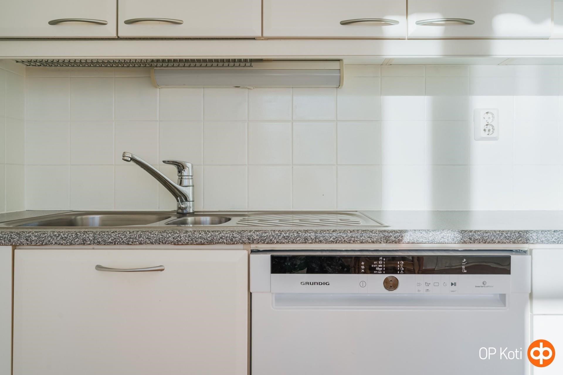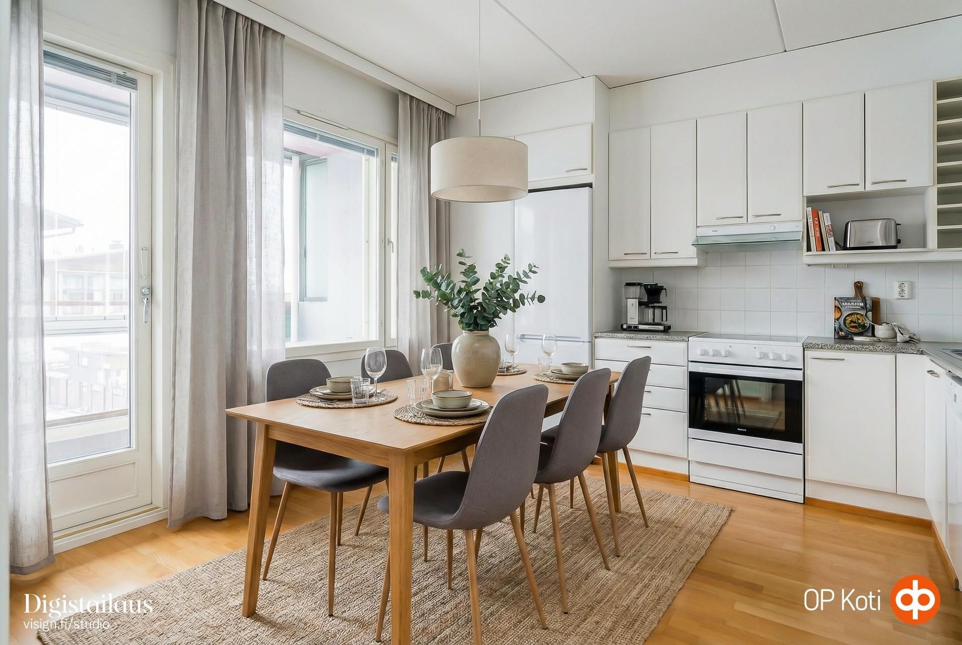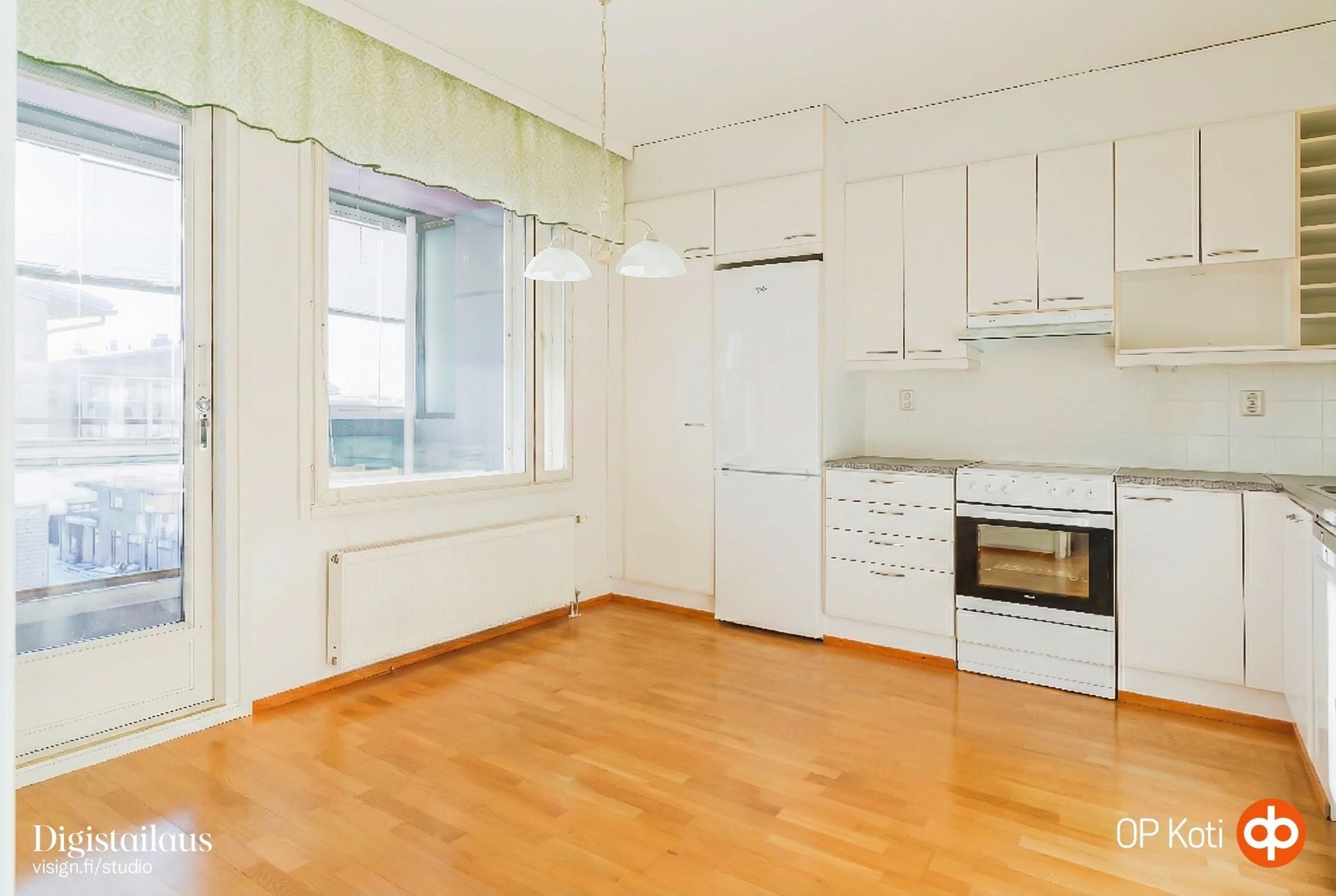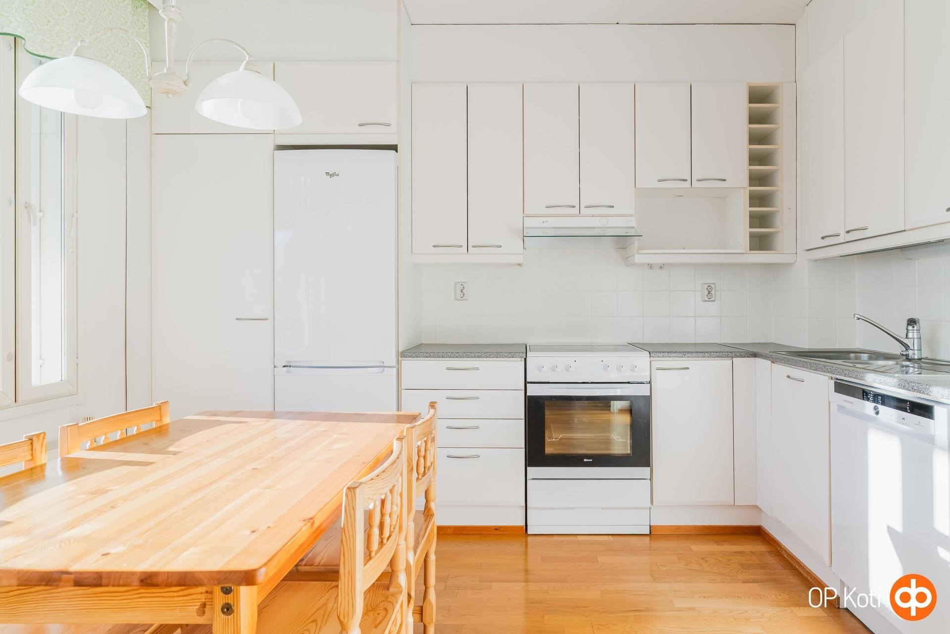 - Jääkaappipakastin, keraaminen liesi 2021 - kiertoilmauuni, liesituuletin 2023, astianpesukone 2023, kaapistot, kiinteät valaisimet. Keittiössä on erityisen paljon kaappeja ja työtilaa.