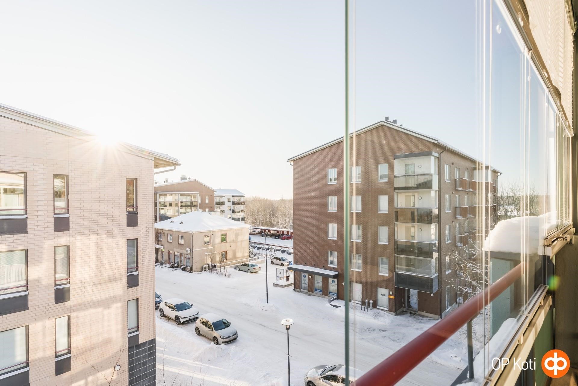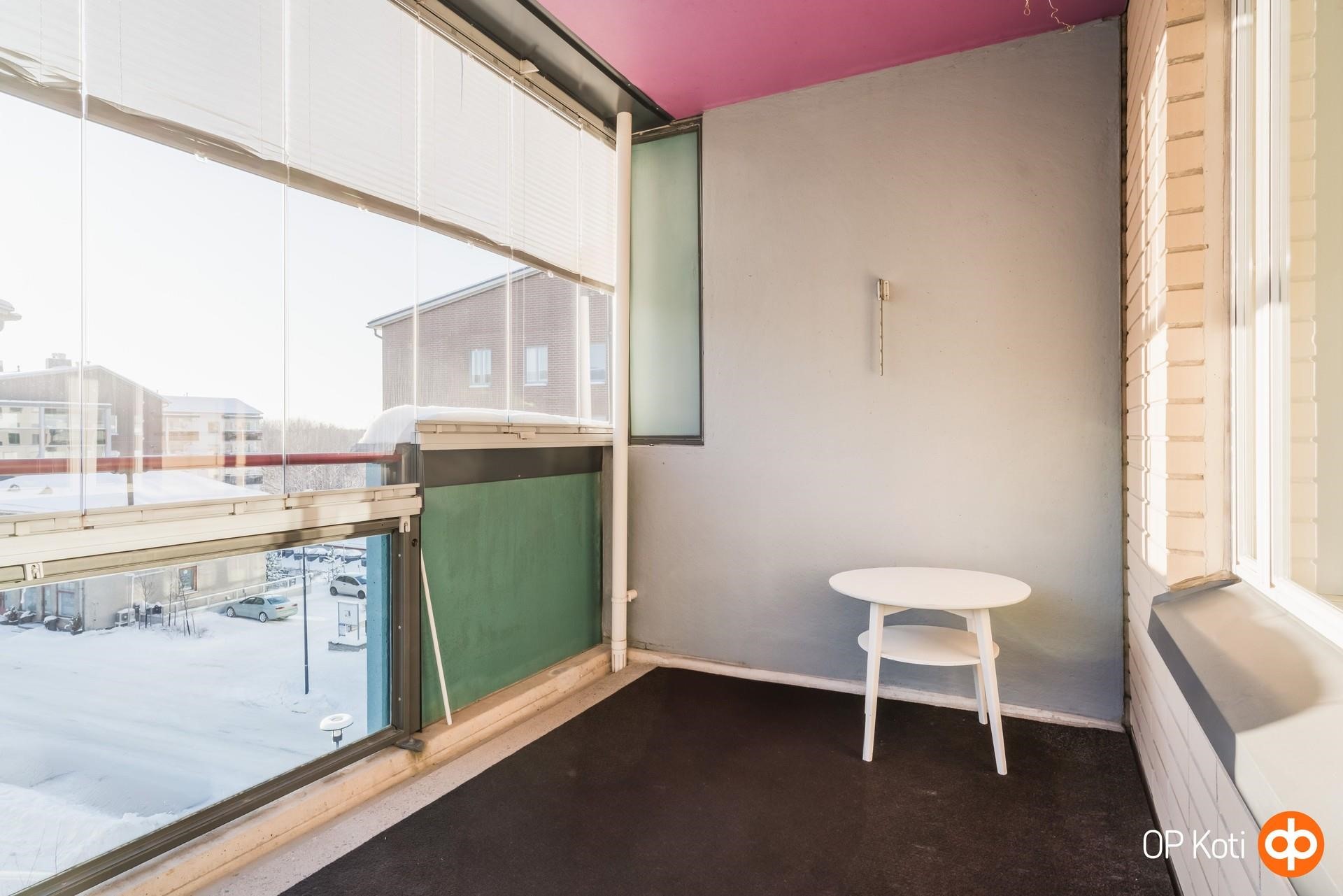 Keittiössä on poikkeuksellisen paljon kaappeja ja työtilaa. Keittiöstä avautuu käynti lasitetulle parvekkeelle, joka suuntautuu rauhalliselle sisäpihalle, itään päin. Parveke toimii loistavana lisähuoneena pitkälle syksyyn.