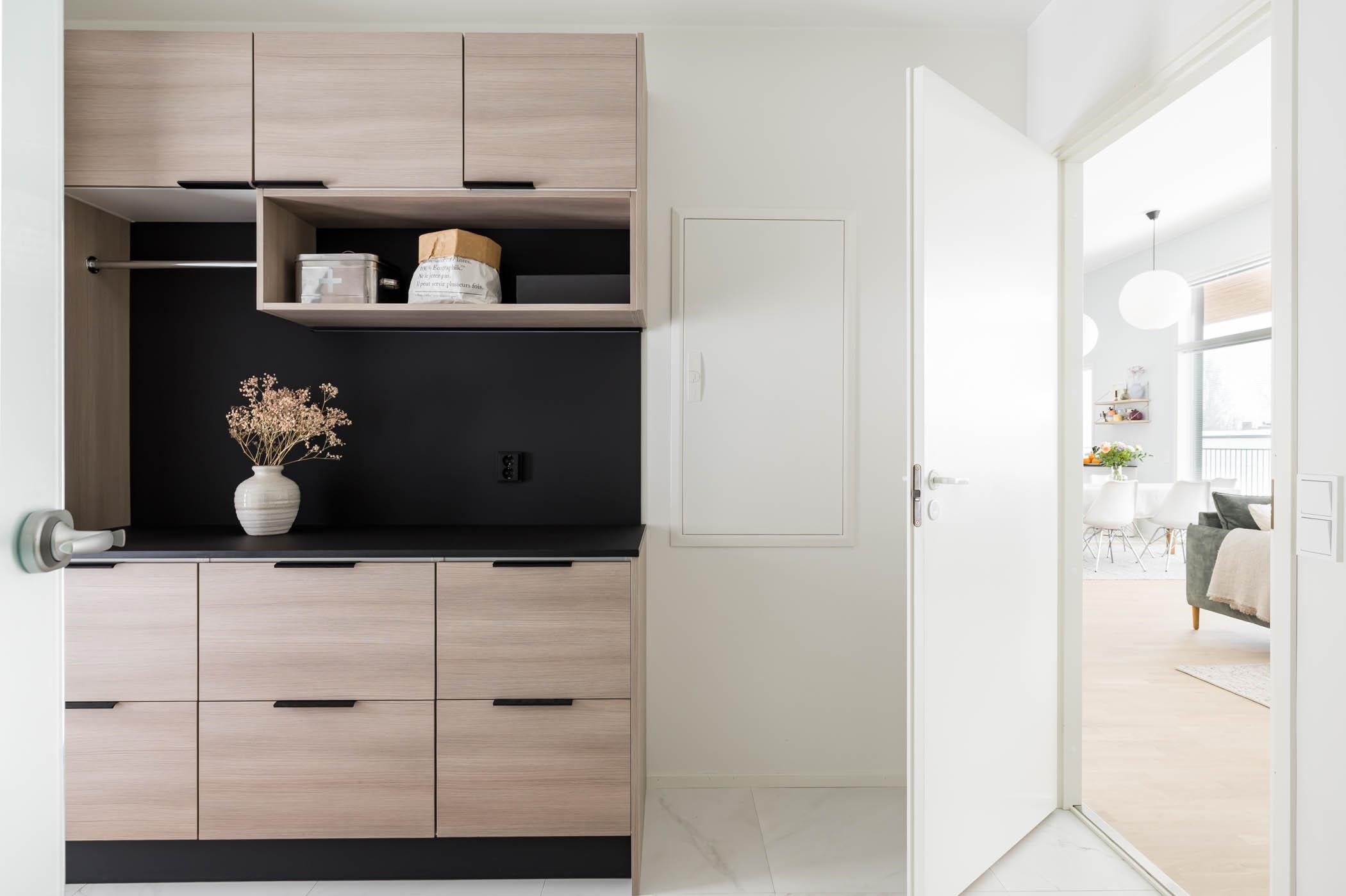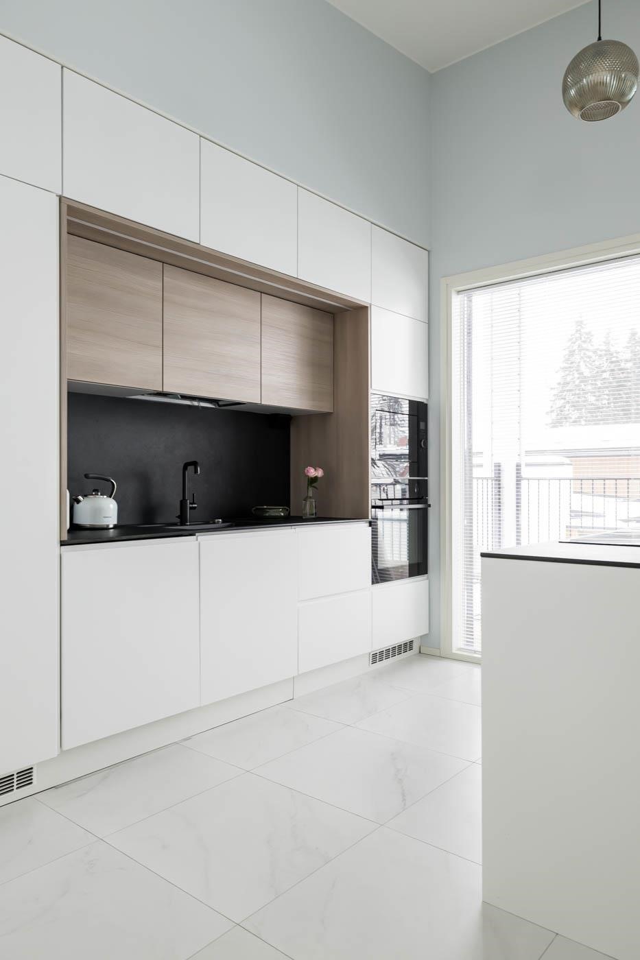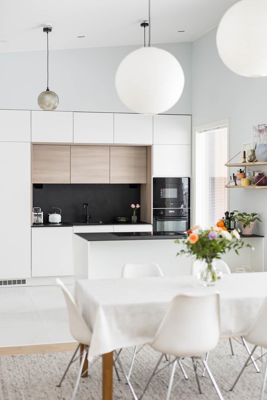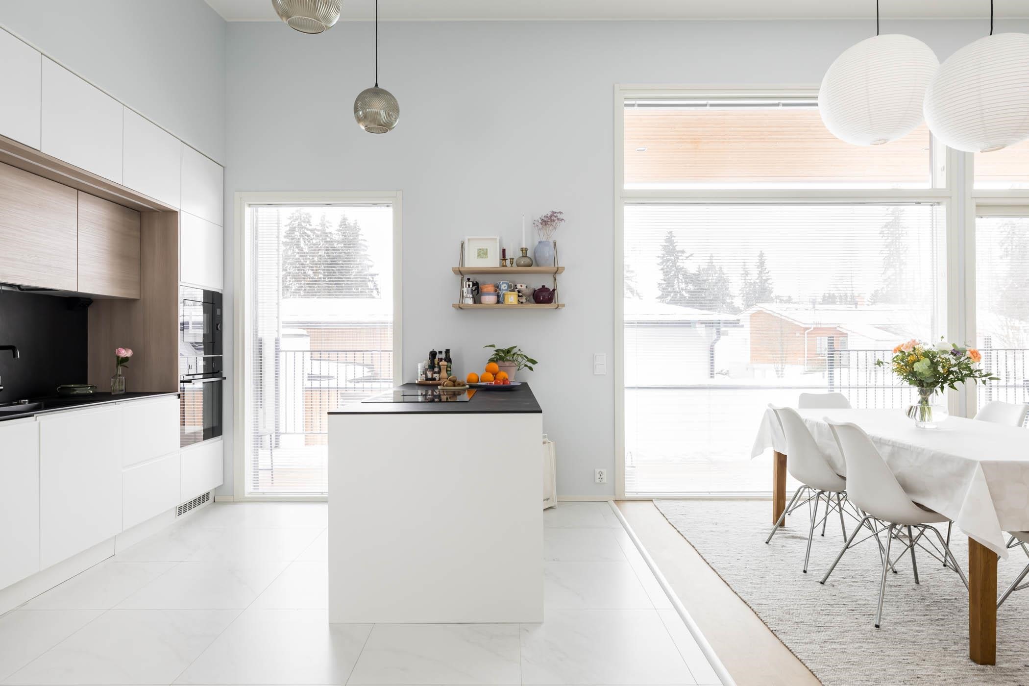 - Saarekkeellisen avokeittiön varusteisiin kuuluvat laadukkaat Integroidut kodinkoneet: jääkaappi, pakastekaappi, erillisuuni, mikroaaltouuni ja astianpesukone. Saarekkeessa on induktioliesitaso huomaamattoman tyylikkäällä integroidulla liesituulettimella.