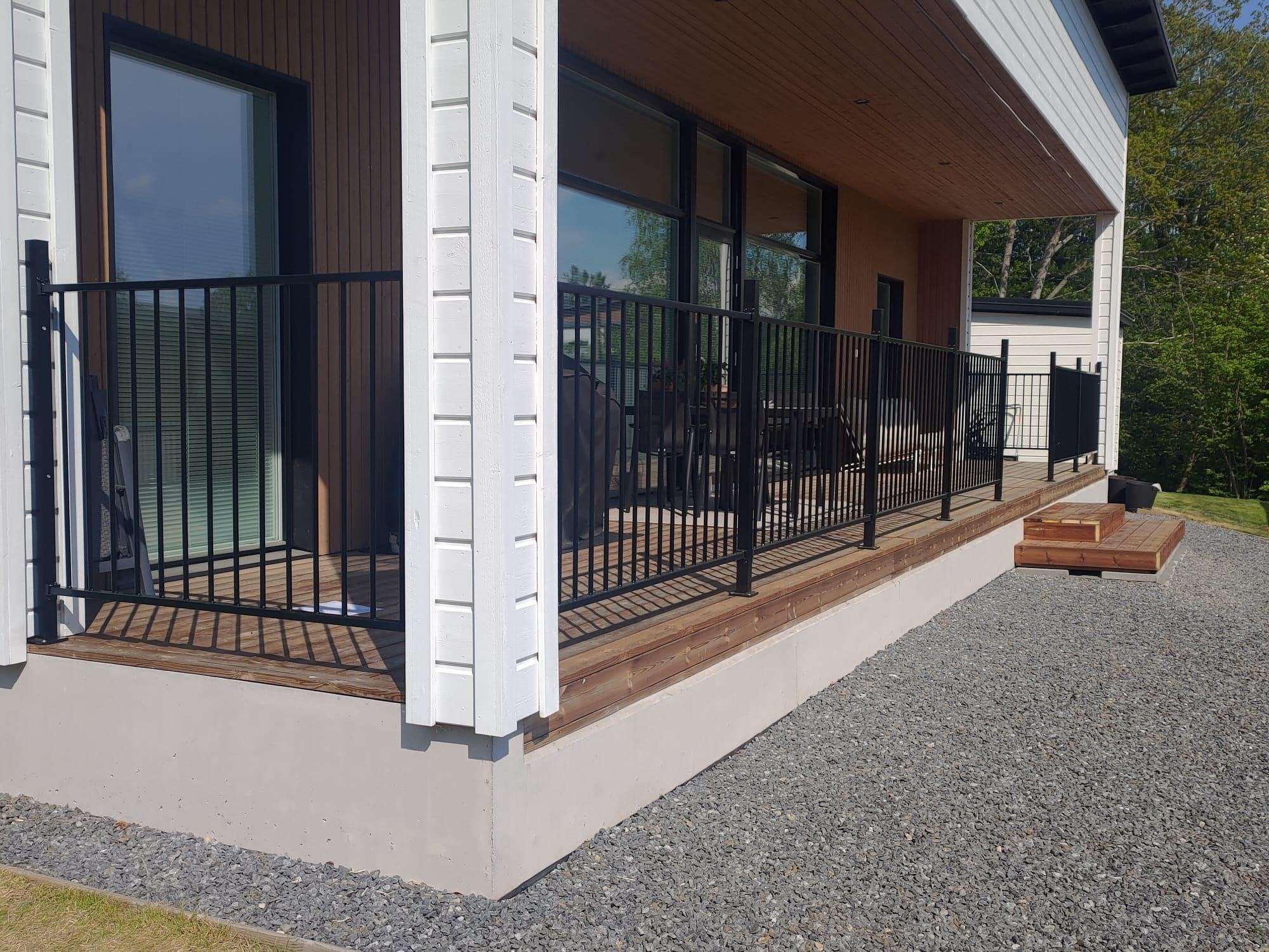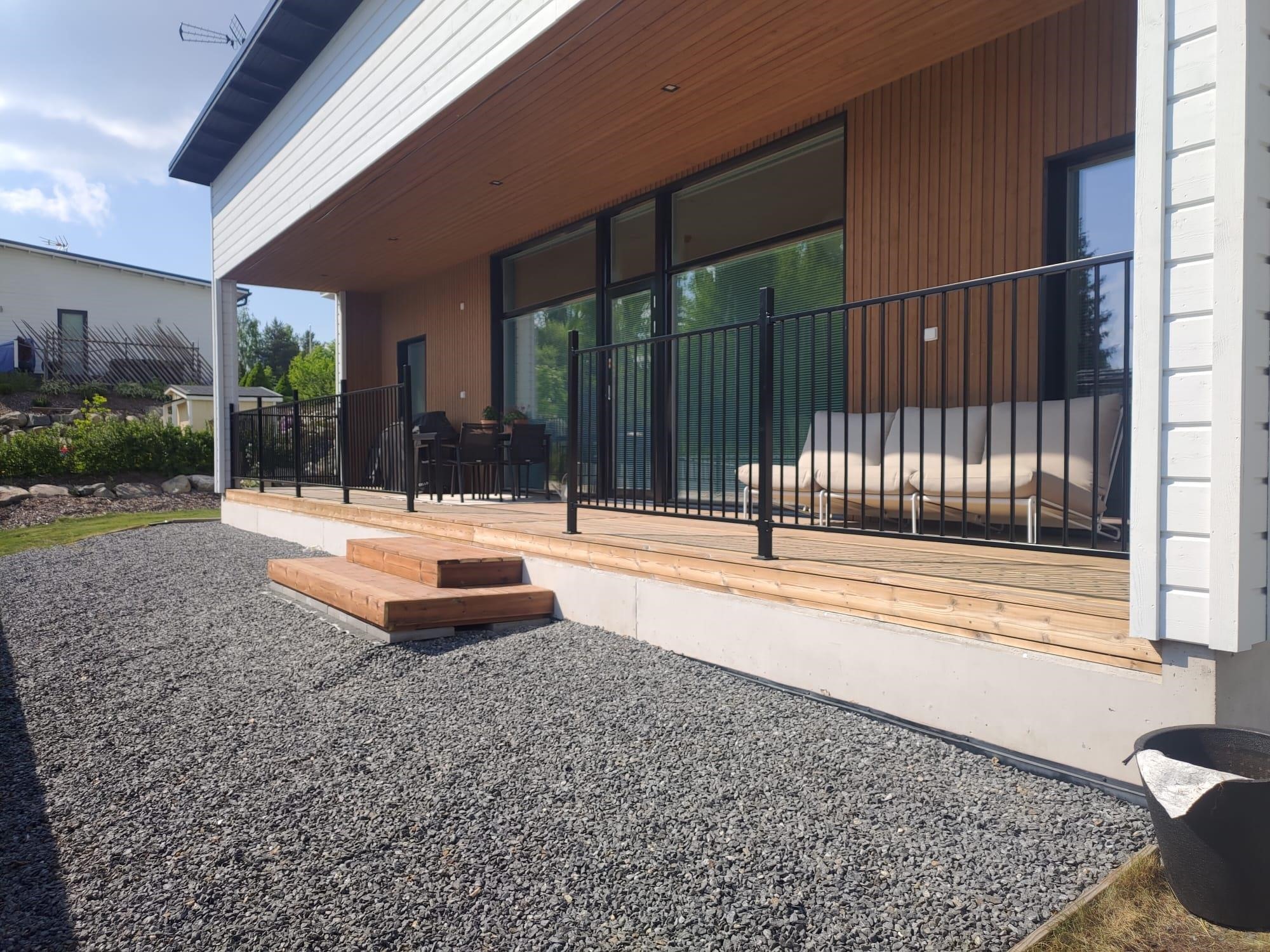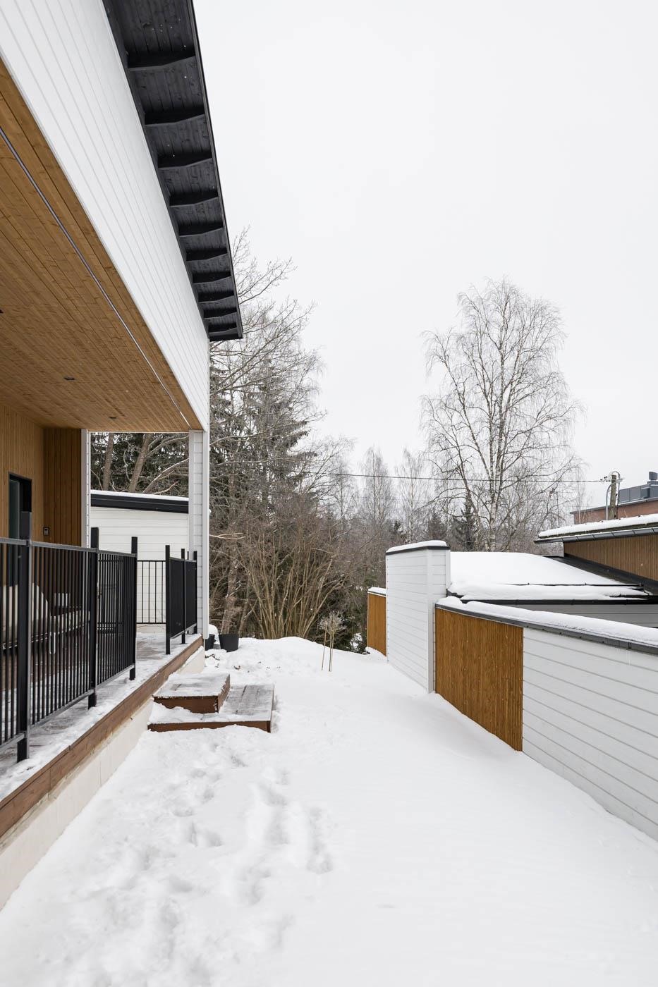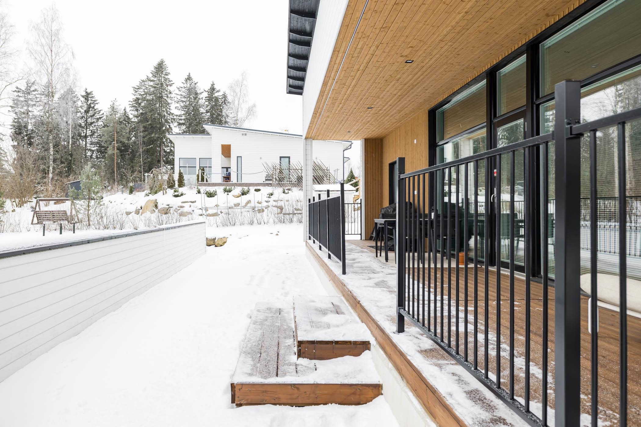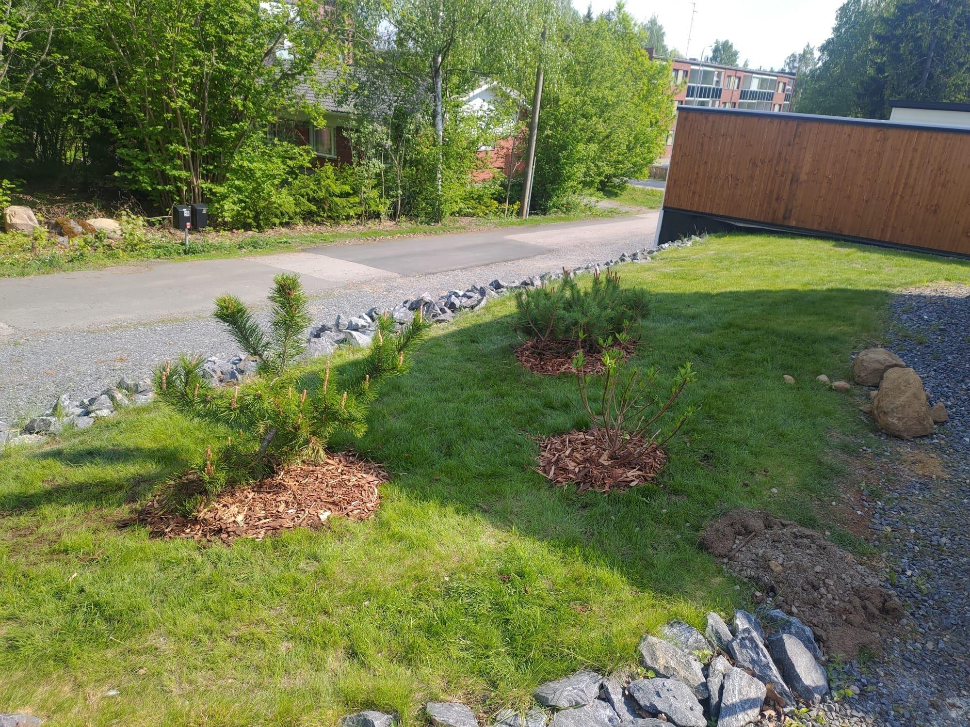 - Tontti hieman ylempänä naapurustoon nähden. Istutuksia, nurmikkoa. Iso terassi.