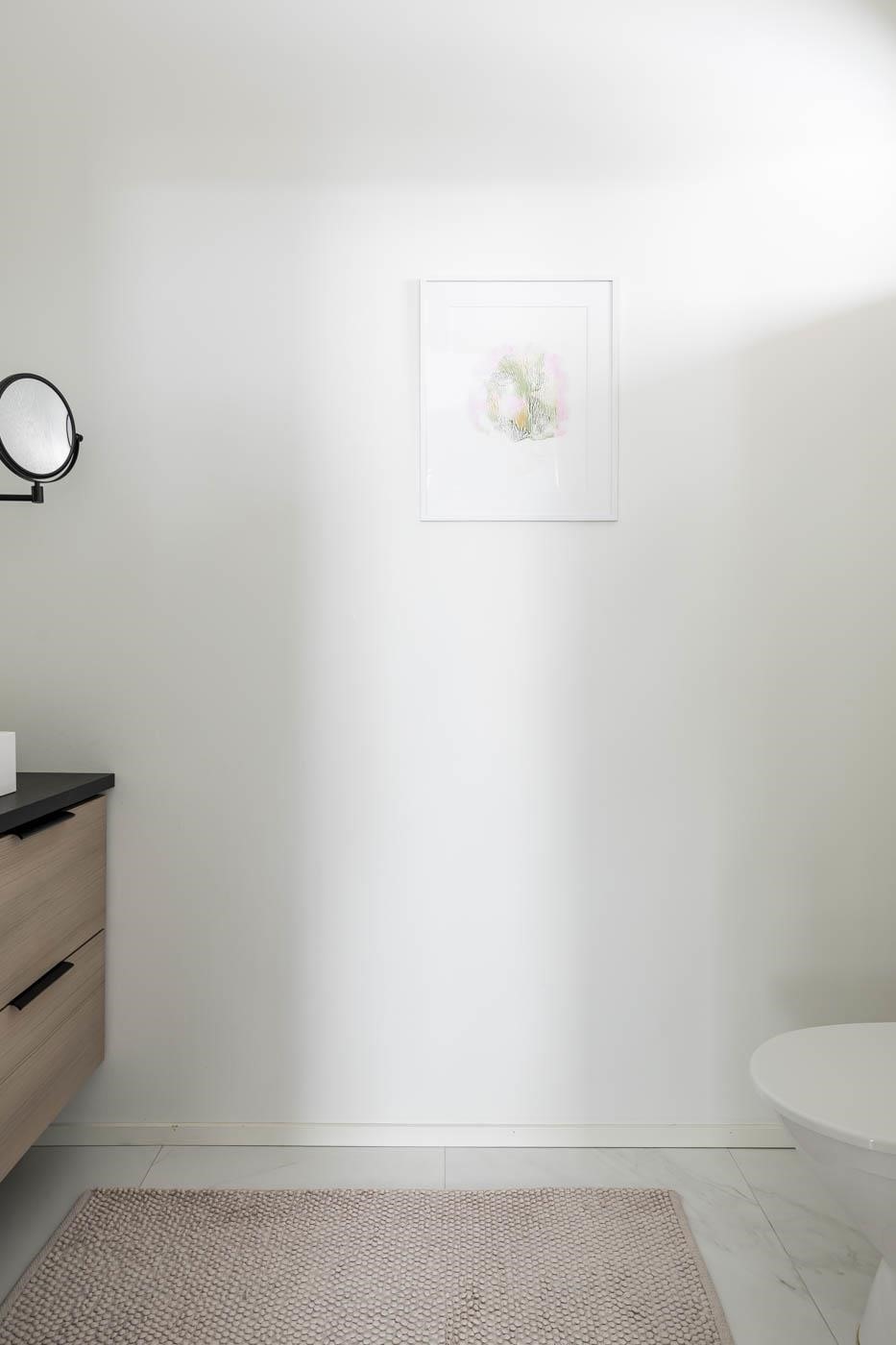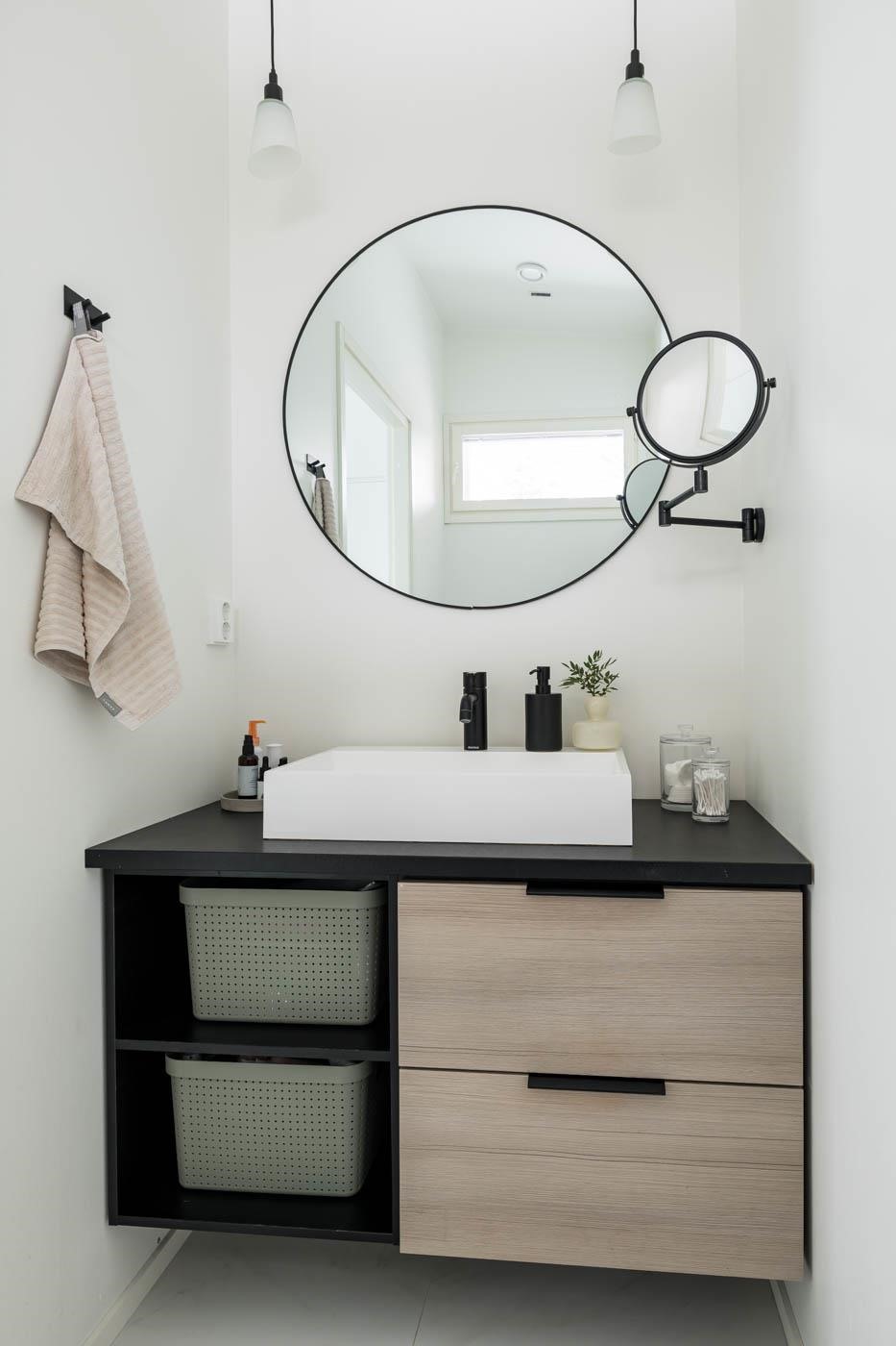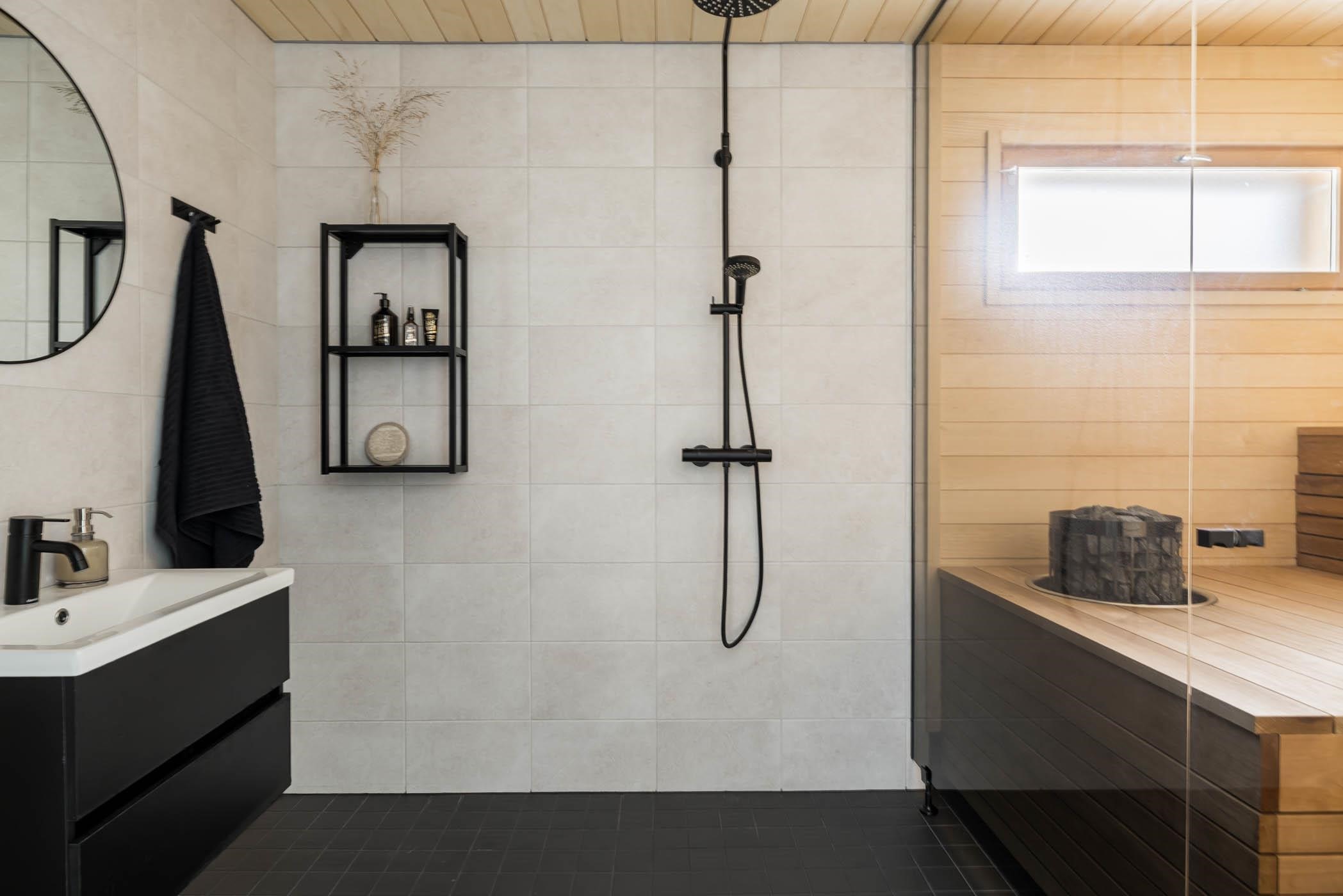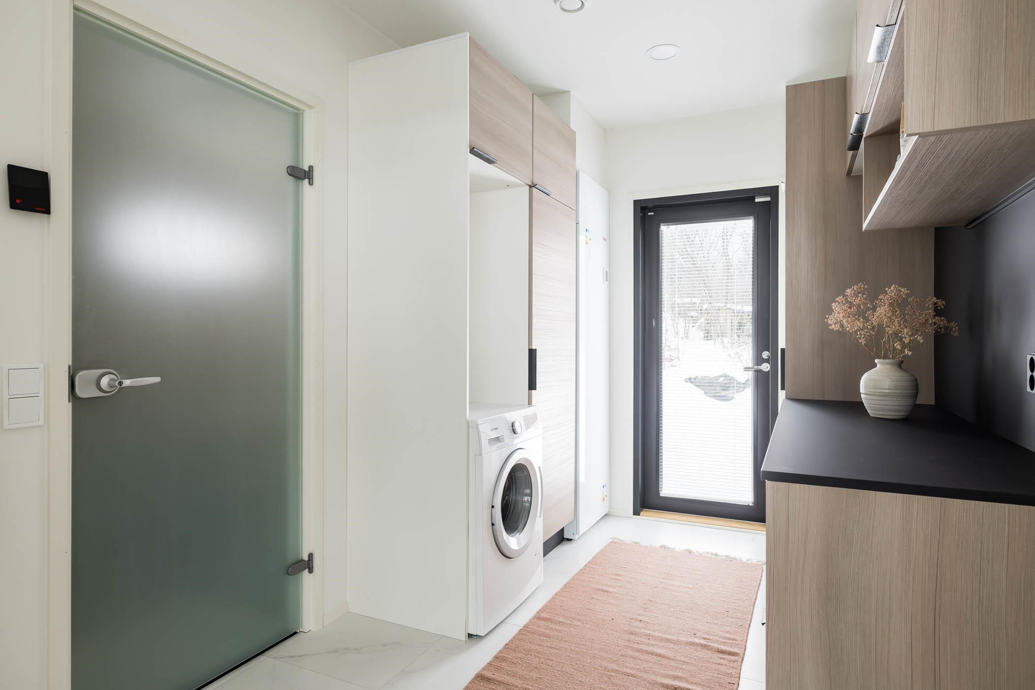 - Kodin ikkunallisessa saunassa on lauteeseen upotettu pilarikiuas sekä lasiseinä. Kylpyhuoneessa on sadesuihku sekä tavallinen suihku, peili, allaskaappi ja wc-istuin. Lisäksi kodissa on erillinen wc, jossa on varusteluna peilit sekä allaskaappi. Kodinhoitohuoneessa on arjen sujuvuutta helpottamassa suora uloskäynti, säilytystilaa kaapistoissa ja pesukoneliitäntä. Lattialämmitys kauttaaltaan koko talossa.