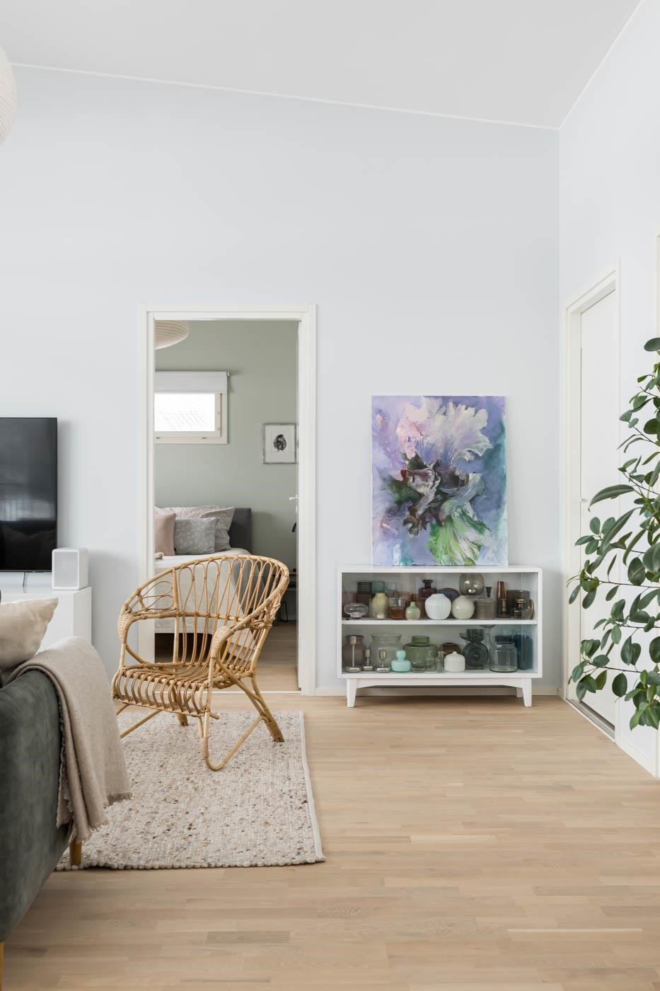 Keittiö ja eteinen: vaalea marmorikuvioitu laatta. Olohuone sekä makuuhuoneet: lattiat parketti Kährs tammi, seinät maalatut. Kodinhoitohuone: laatta. Sauna, kylpyhuone ja wc: laatta.