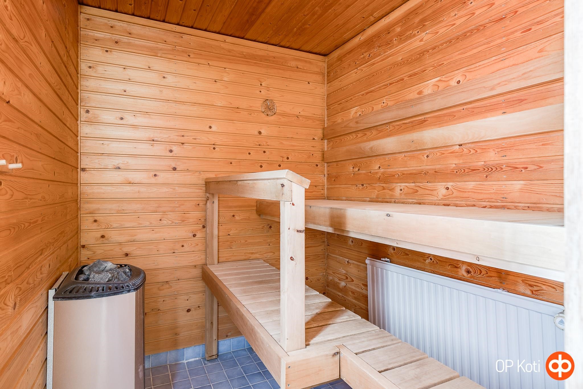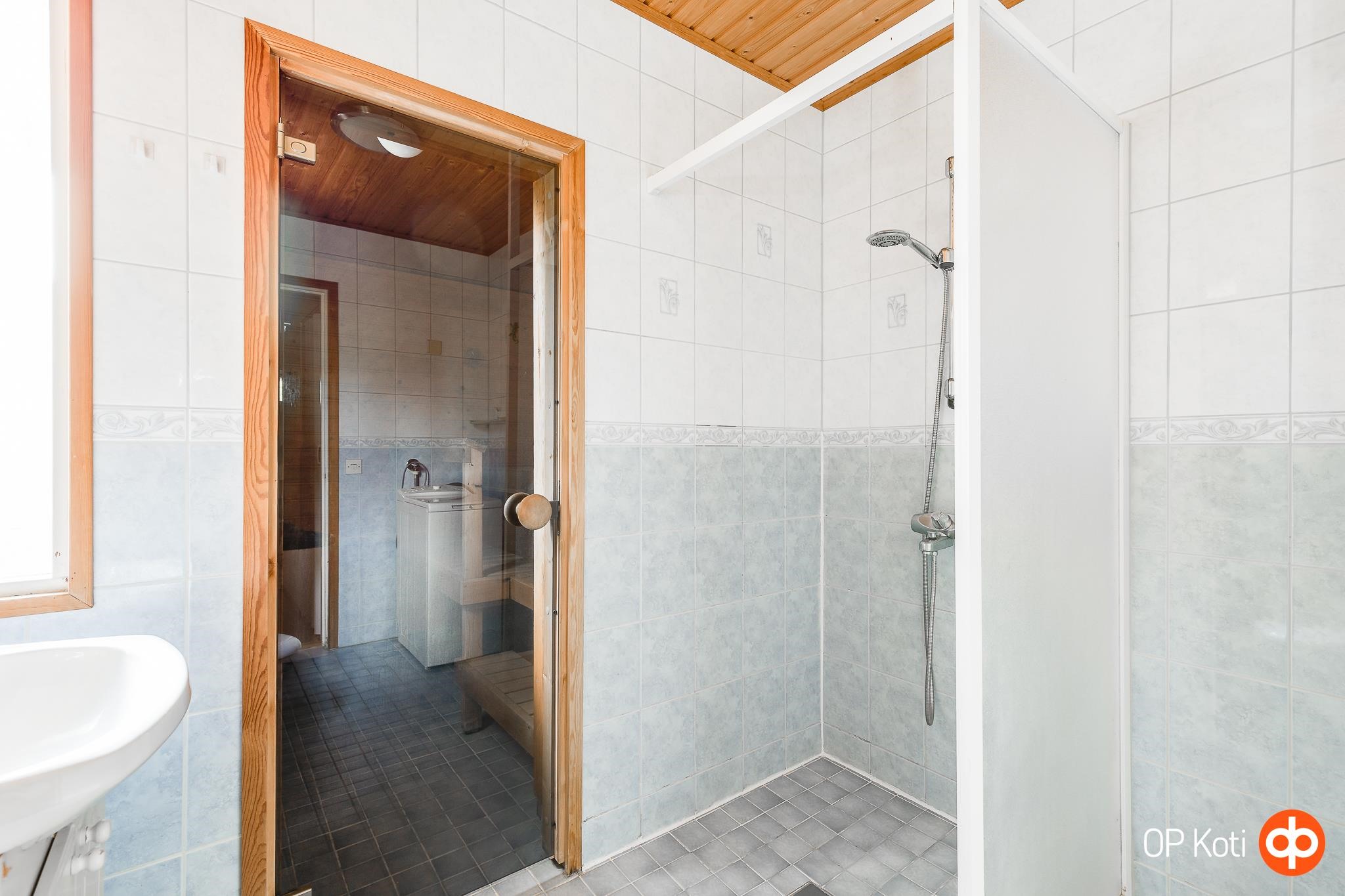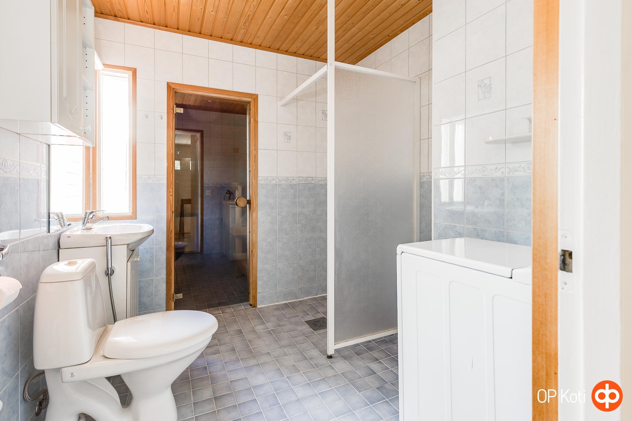 - Sauna, sähkökiuas, kylpyhuone, erillinen wc alakerrassa, yläkerran wc kylpyhuoneen yhteydessä, suihkuseinä, peilikaappi, allaskaappi, pesukoneliitäntä, lattialämmitys kylpyhuone/sauna.