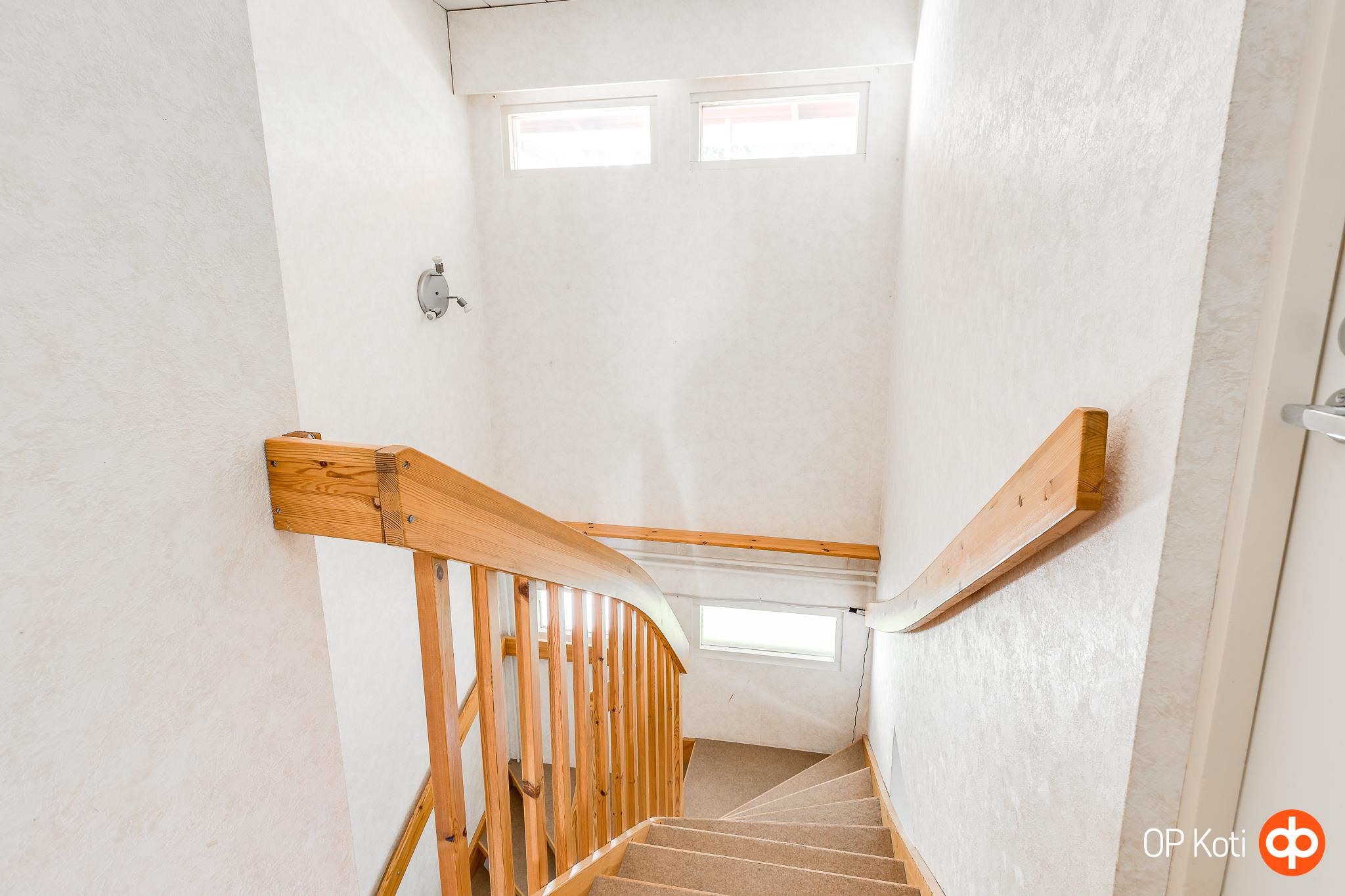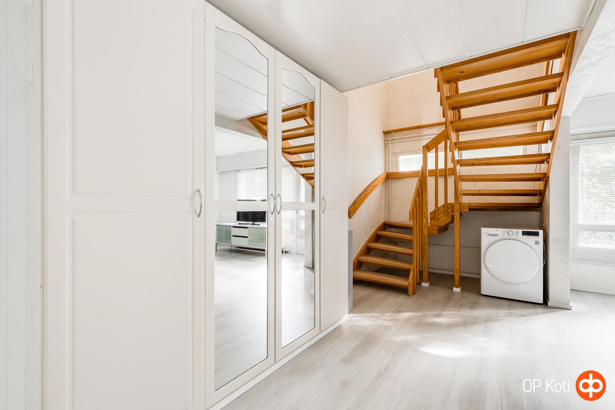 keittiö ja olohuone: Laminaattilattia ja maalatut seinät. alakerran mh: Laminaattilattia, seinät maali/tapetti, huoneesta käynti terassille. yläkerran mh:t: laminaattilattia, tapetoidut seinät, toisesta huoneesta käynti parvekkeelle. ph+sauna: laattalattia ja kaakeloidut seinä ph, sauna puupaneloitu.