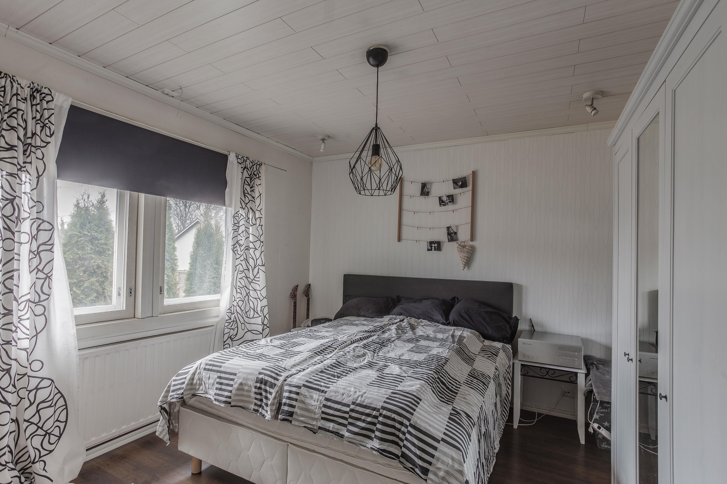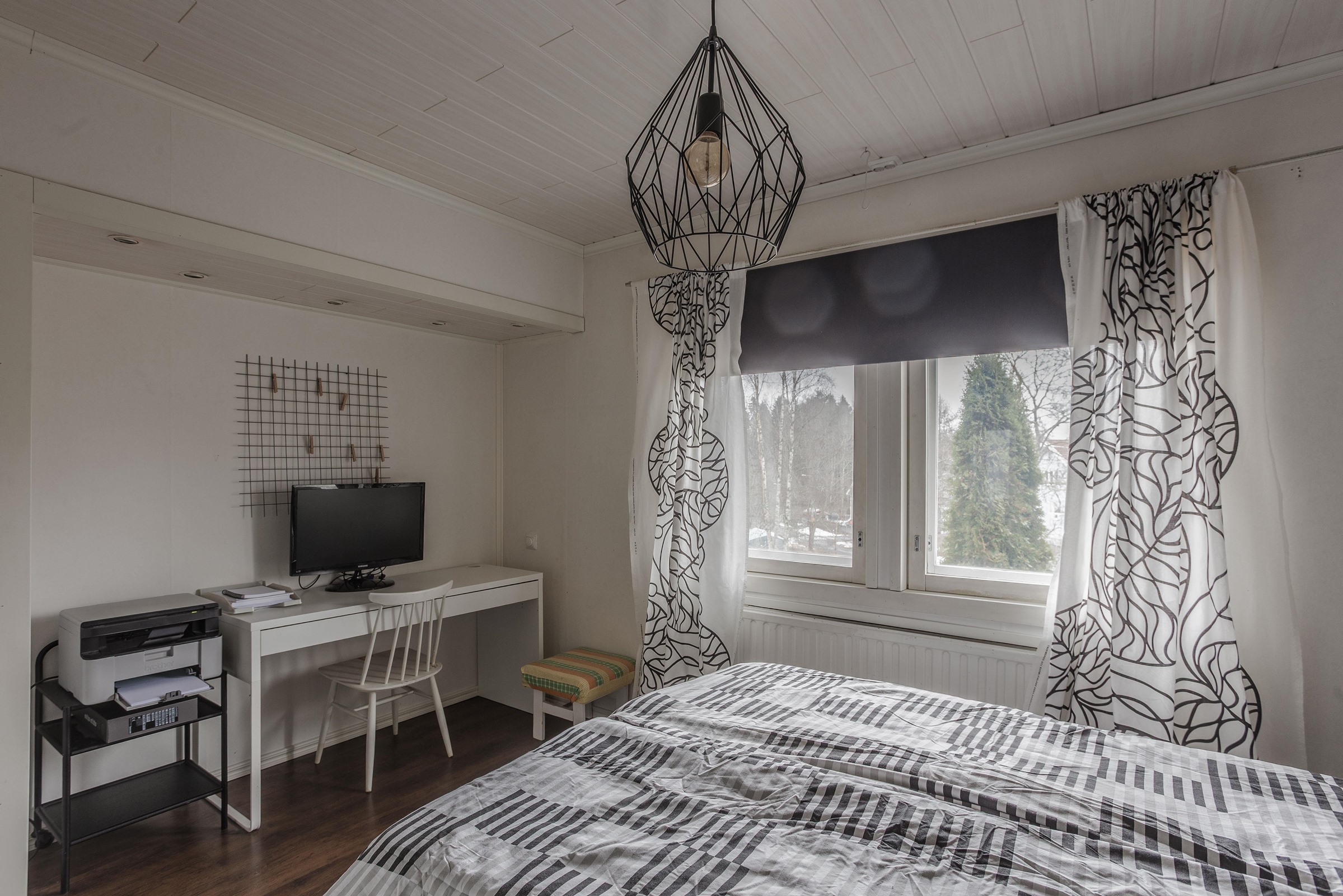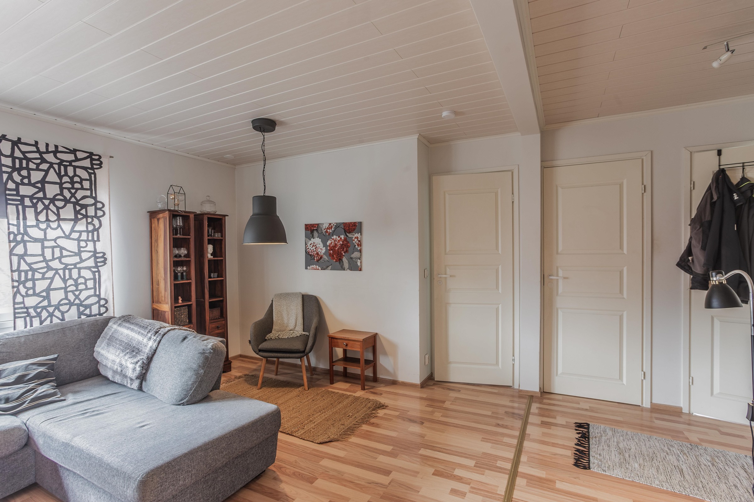 Keittiö: tapetti ja laminaattilattia. Olohuone: tapetti ja laminaattilattia. Makuuhuone 1: tapetti ja laminaattilattia. Makuuhuone 2: maali ja laminaattilattia. Kodinhoitohuone: paneeli ja laattalattia. Sauna: paneeli ja laattalattia. Kylpyhuone: kaakeli ja laattalattia. Wc: maali ja laattalattia / tapetti ja korkki. Takkahuone: paneeli, tapetti ja laattalattia.