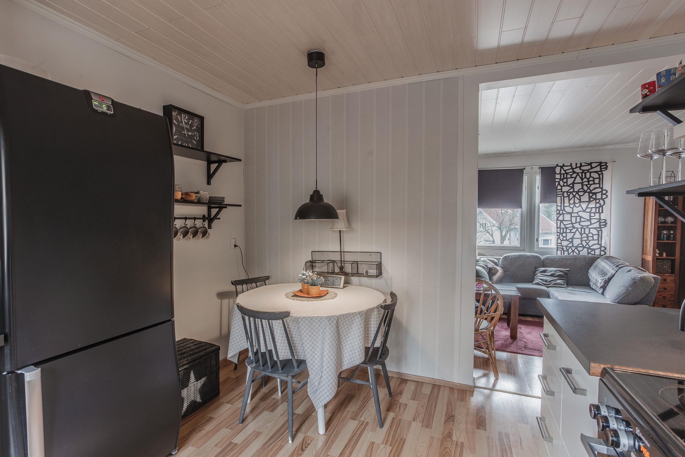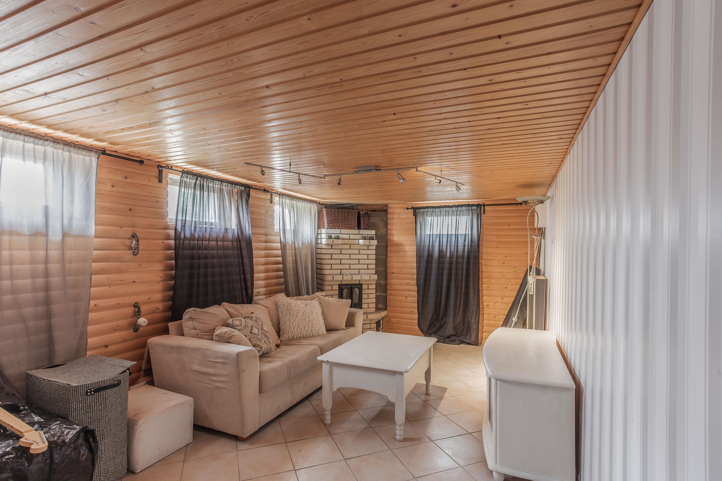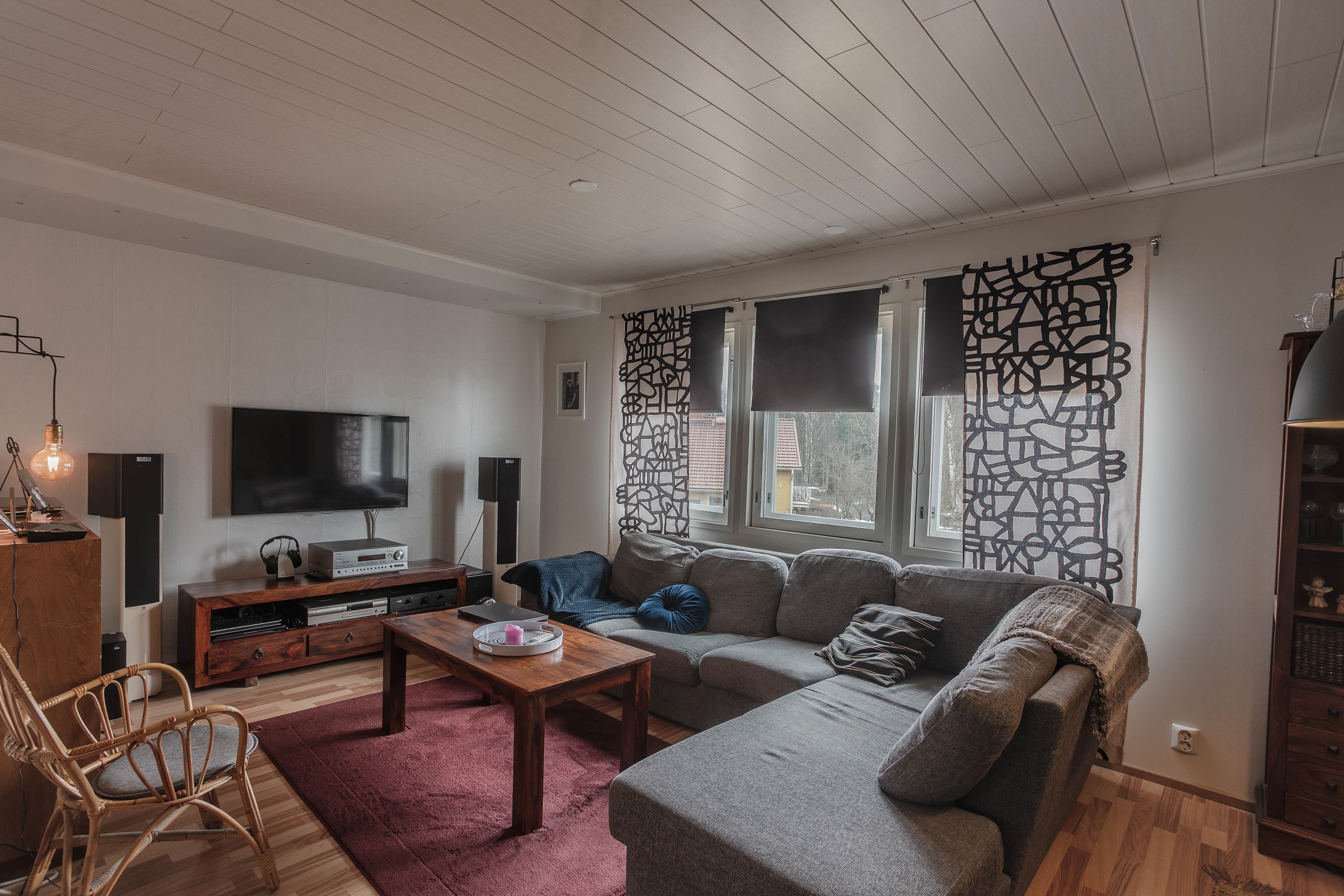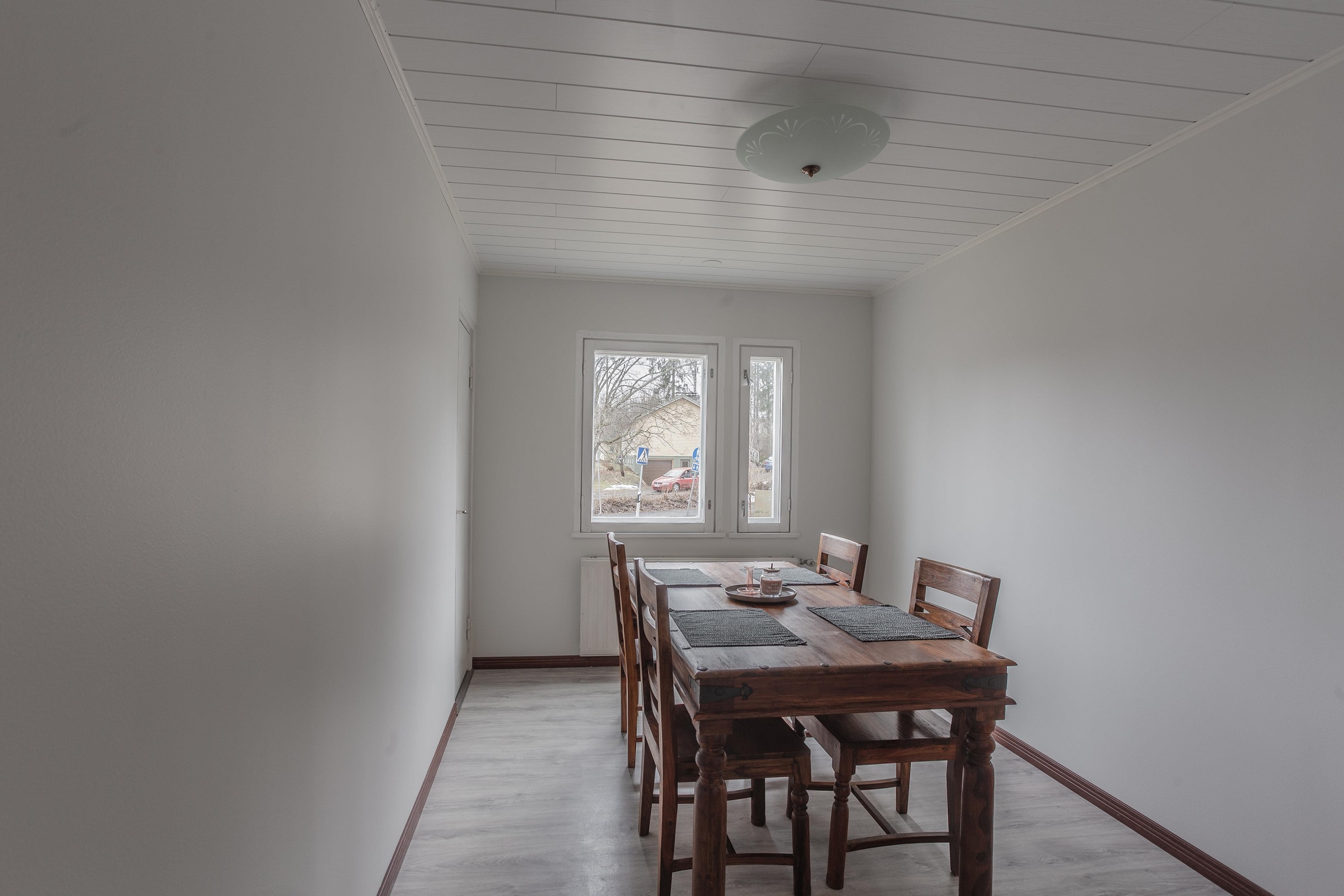 Keittiö: tapetti ja laminaattilattia. Olohuone: tapetti ja laminaattilattia. Makuuhuone 1: tapetti ja laminaattilattia. Makuuhuone 2: maali ja laminaattilattia. Kodinhoitohuone: paneeli ja laattalattia. Sauna: paneeli ja laattalattia. Kylpyhuone: kaakeli ja laattalattia. Wc: maali ja laattalattia / tapetti ja korkki. Takkahuone: paneeli, tapetti ja laattalattia.