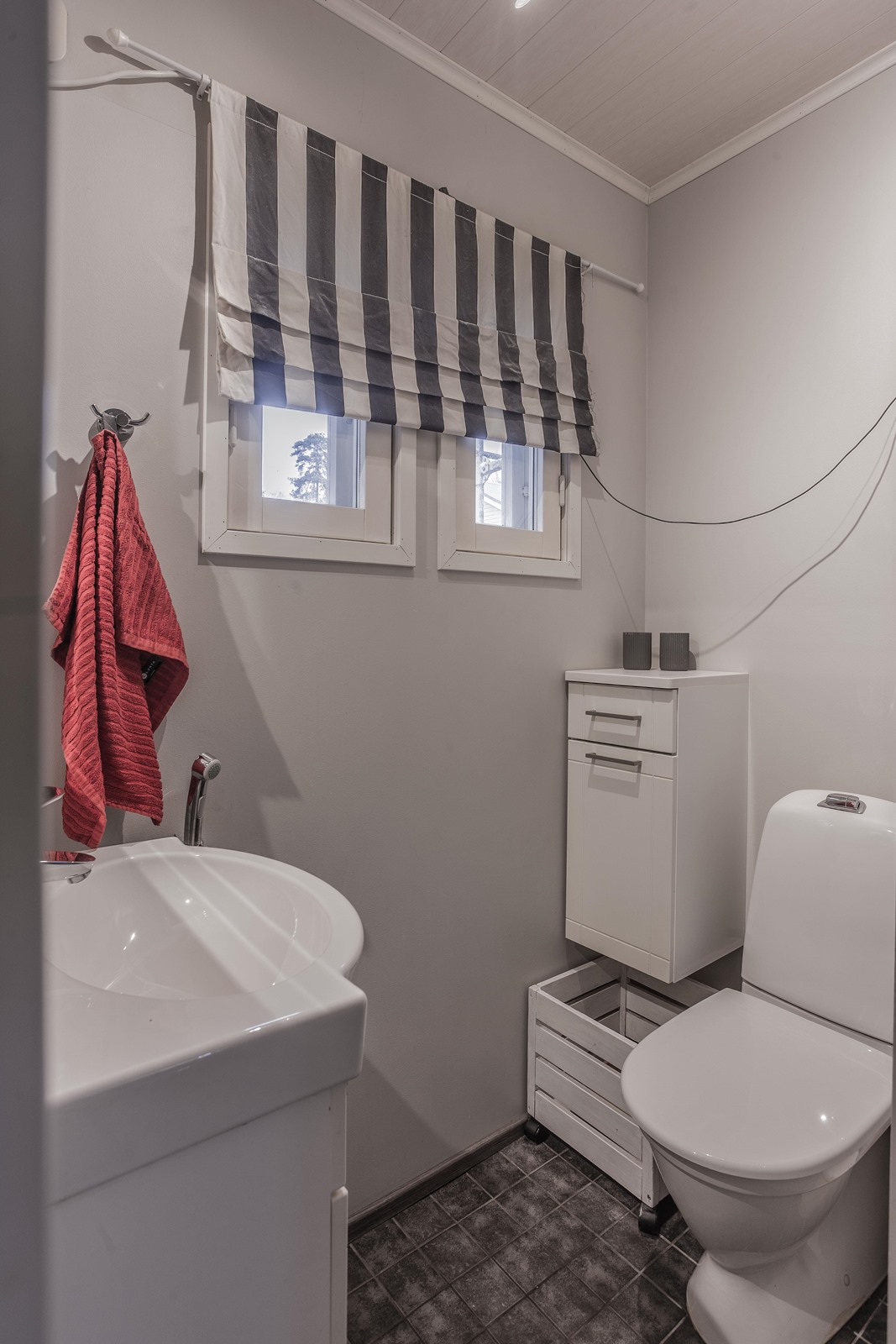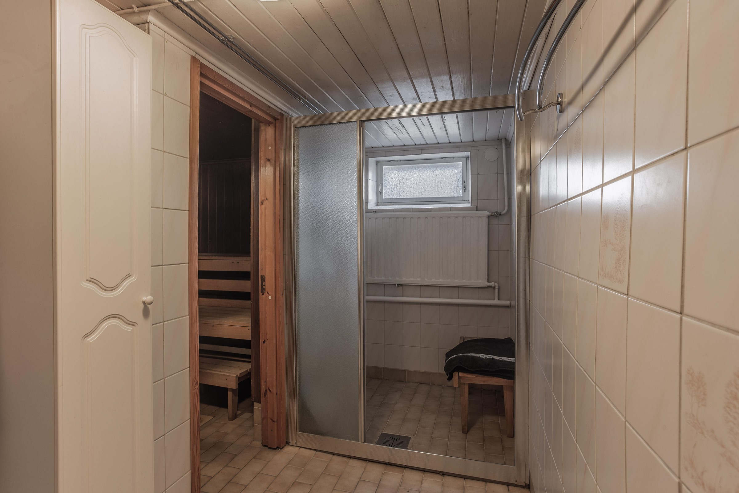 - Sauna, puukiuas, kylpyhuone, erillinen wc (2 kpl), suihku, suihkuseinä, peilit (wc), allaskaappi (wc), pesukoneliitäntä (khh), lattialämmitys (sähköinen), kiinteät valaisimet.