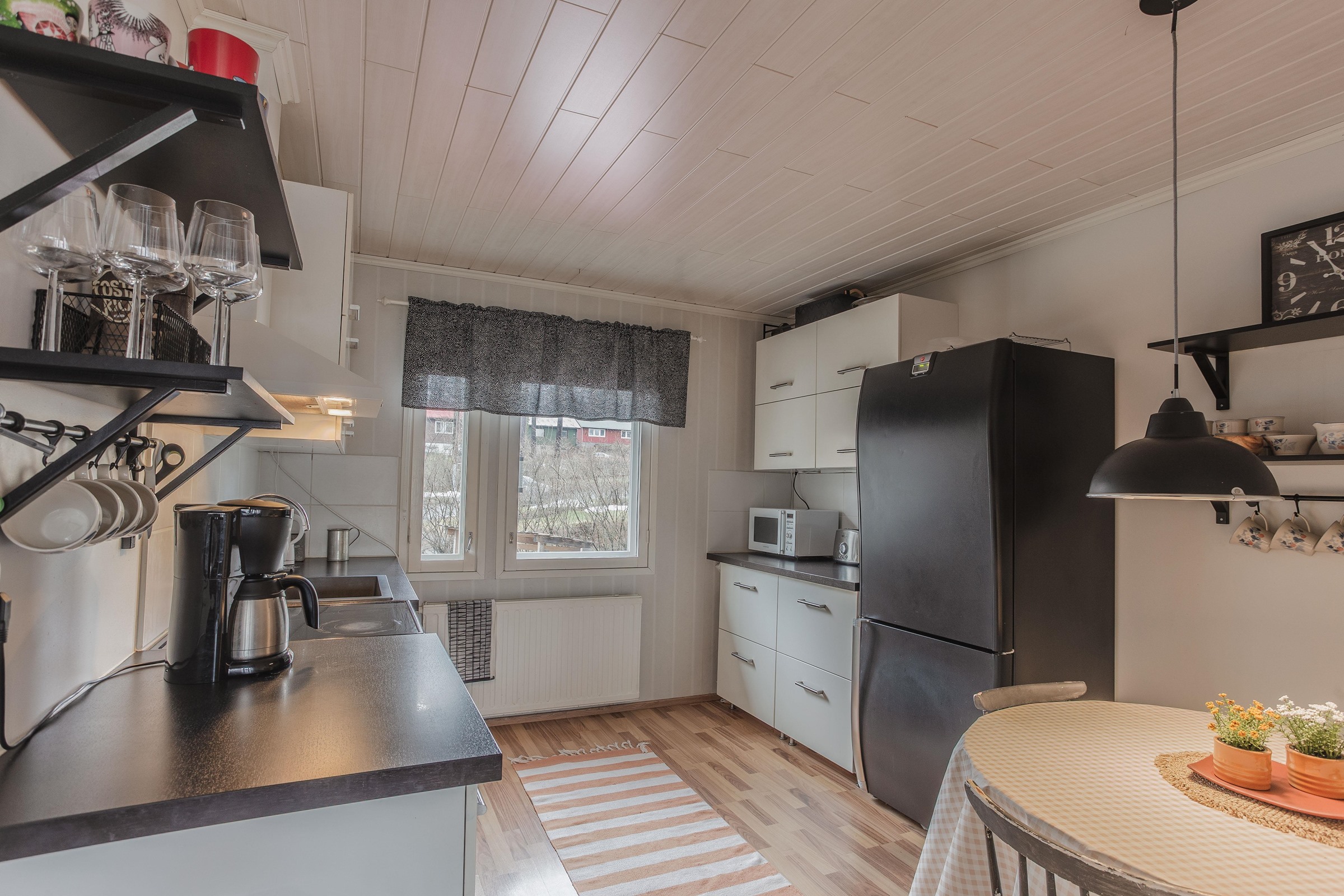 - Jääkaappipakastin, keraaminen liesi, liesituuletin, astianpesukone, kaapistot. Keittiö remontoitu 2014.