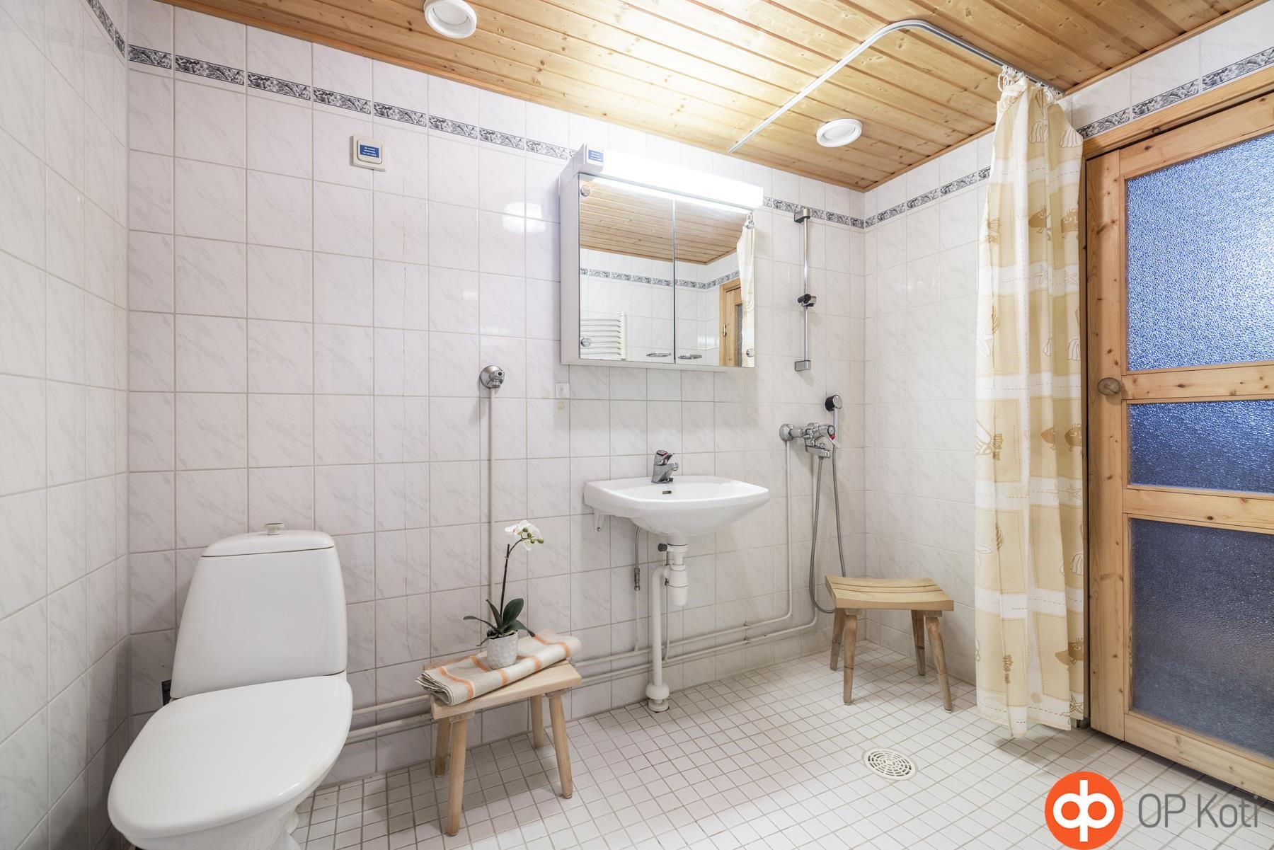 - Sauna, sähkökiuas, kylpyhuone, erillinen wc, suihku, peilikaappi, allaskaappi, pesukoneliitäntä, lattialämmitys mukavuus lattialämmitys sähköllä, kiinteät valaisimet. Kylpyhuoneen seinän laatoissa halkeama, ollut lähes alusta alkaen, tutkittu 26.11.2025 ja raportti löytyy välittäjältä.