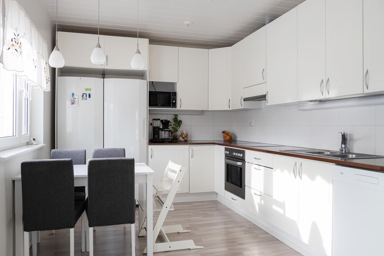 - Jääkaappi, pakastekaappi, erillisuuni, liesitaso, keraaminen liesi, liesituuletin, astianpesukone, kaapistot, kiinteät valaisimet.