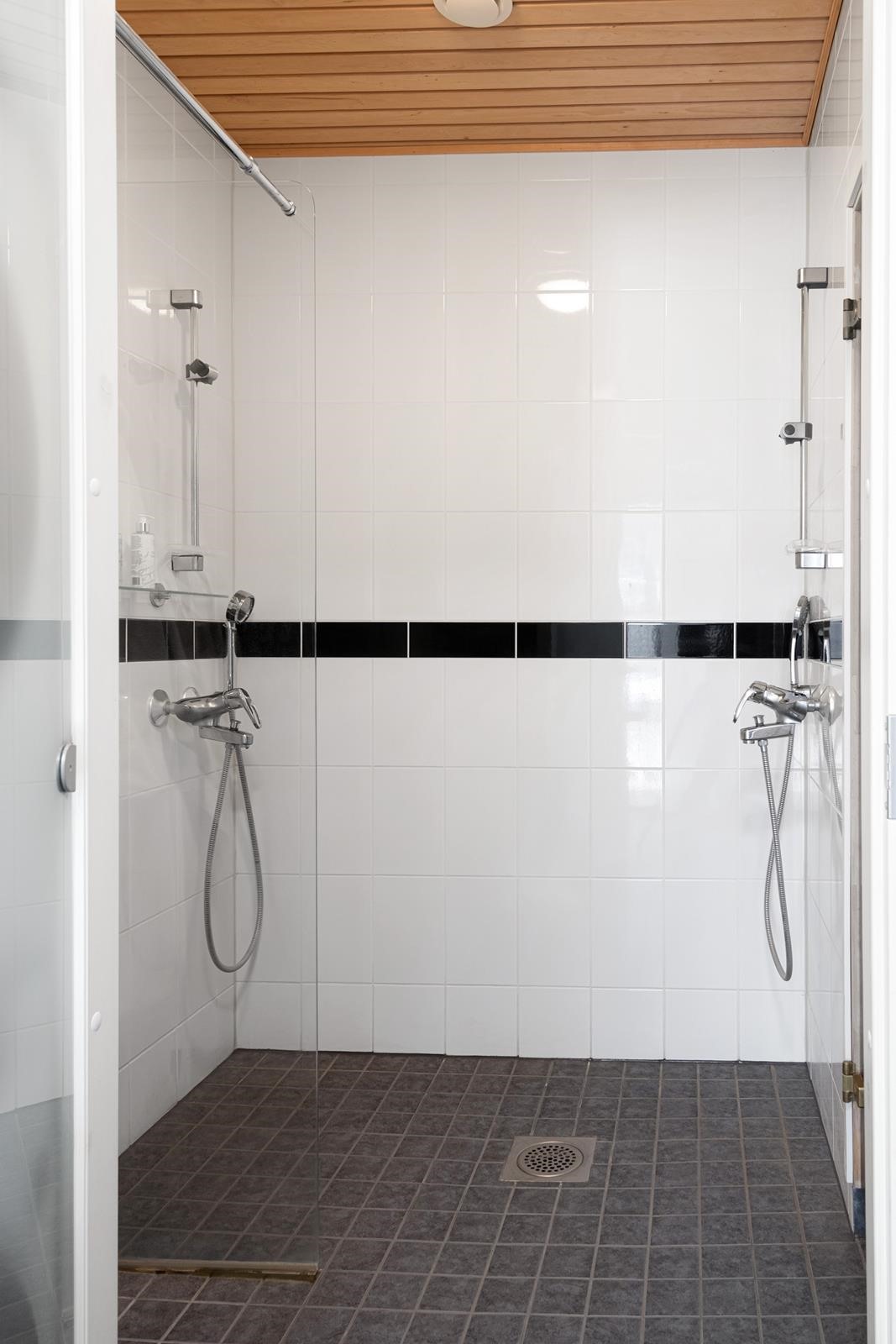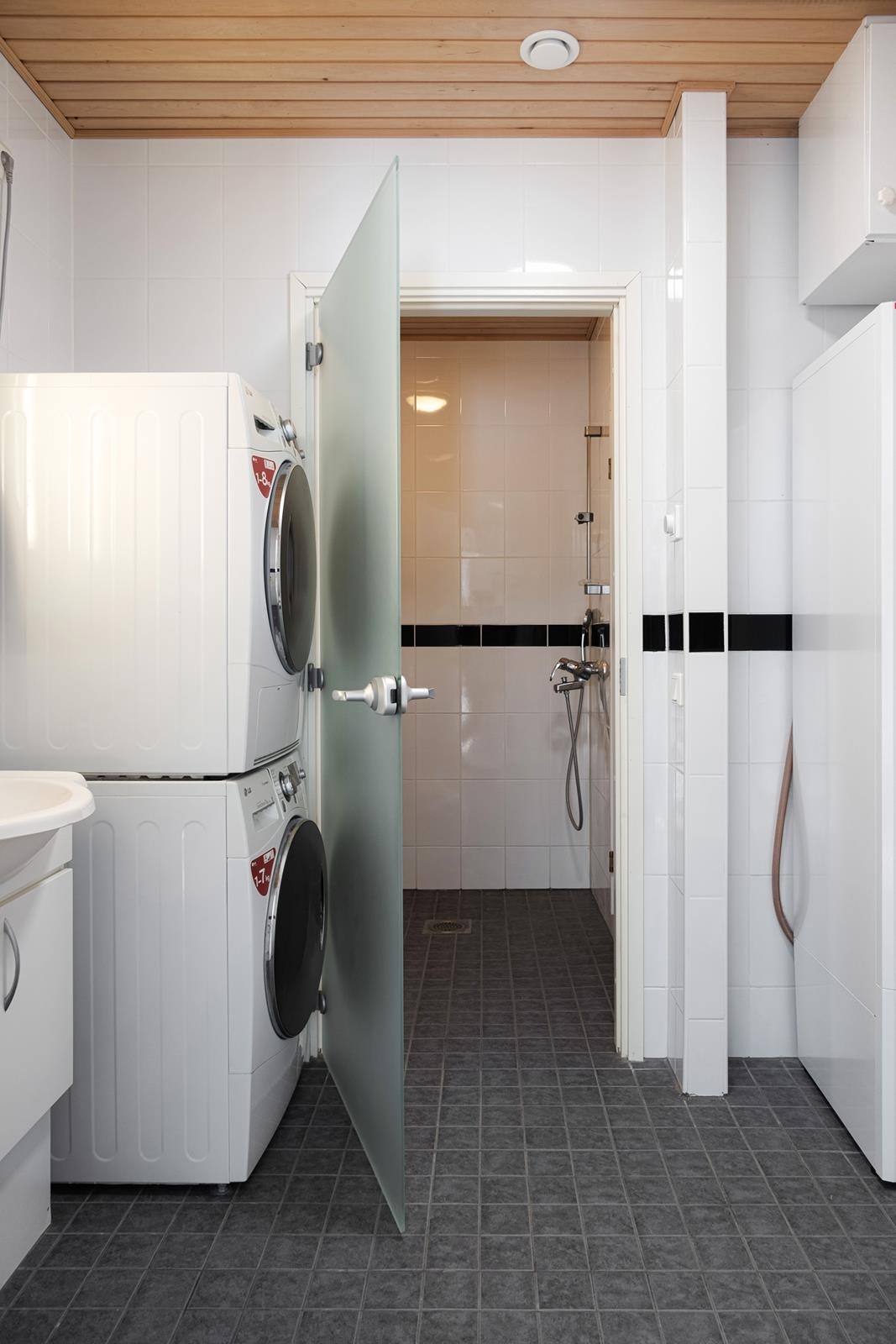 - Sauna, sähkökiuas, kylpyhuone, erillinen wc Wc istuin myös kylpyhuoneessa, suihku 2 kpl, suihkuseinä, peilikaappi, allaskaappi, pesukoneliitäntä, lattialämmitys, kiinteät valaisimet.