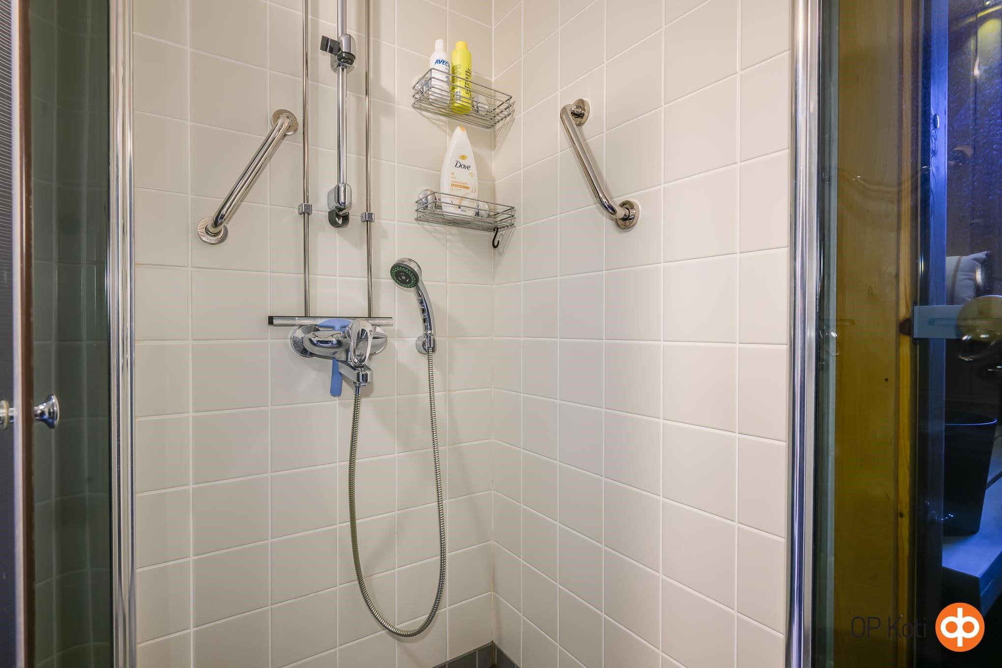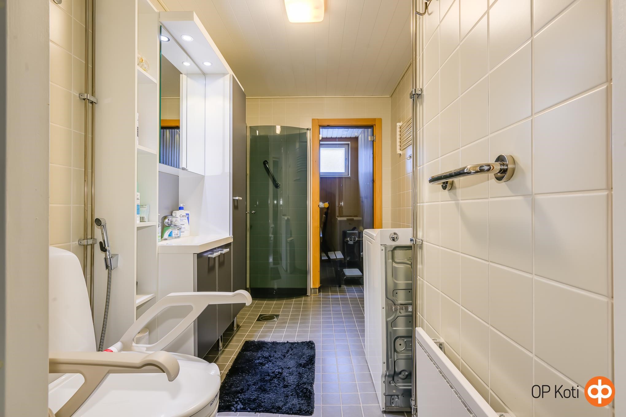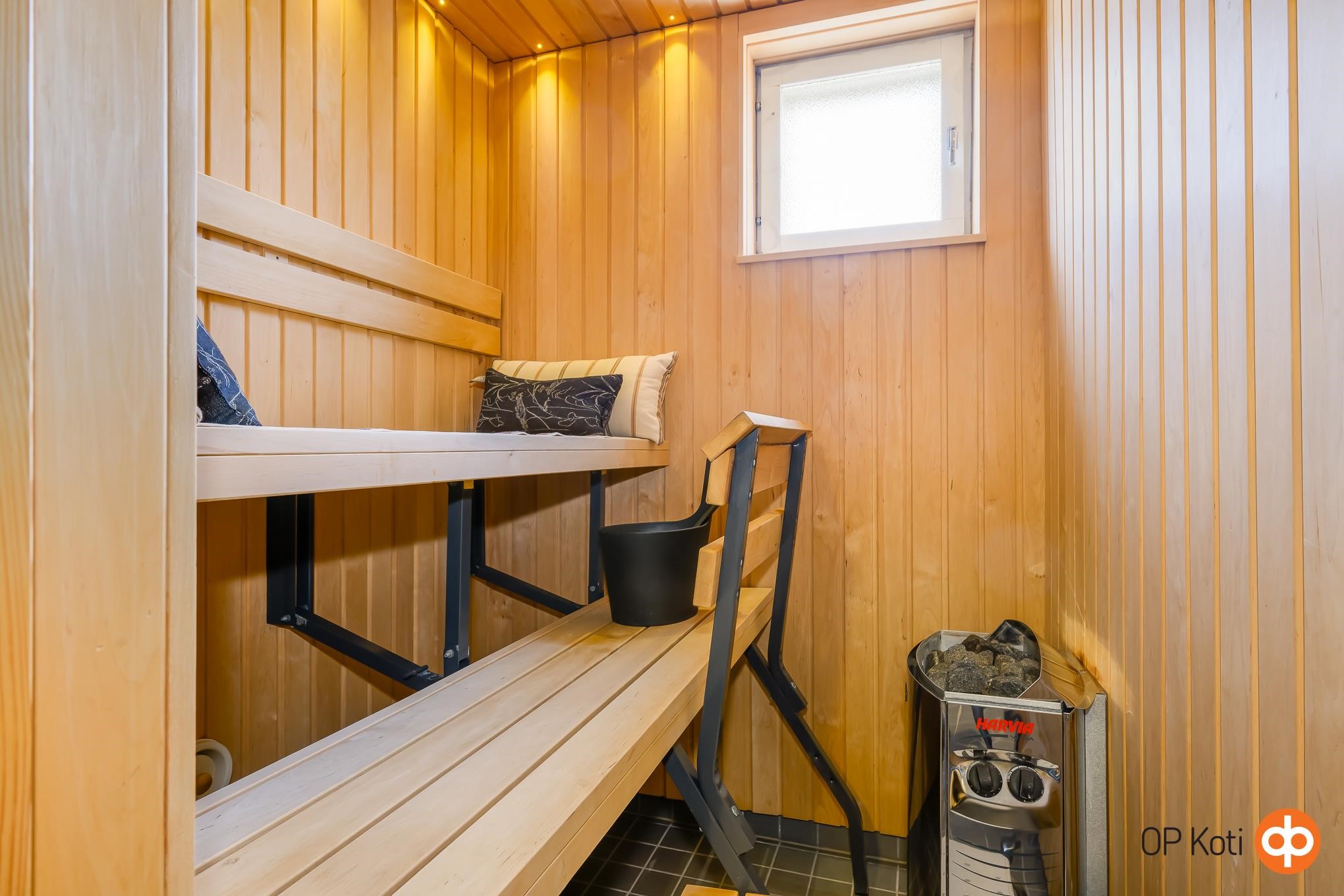 - Sauna, sähkökiuas, kylpyhuone, suihkuseinä, peilikaappi, allaskaappi, pesukoneliitäntä. Nostettavat lauteet