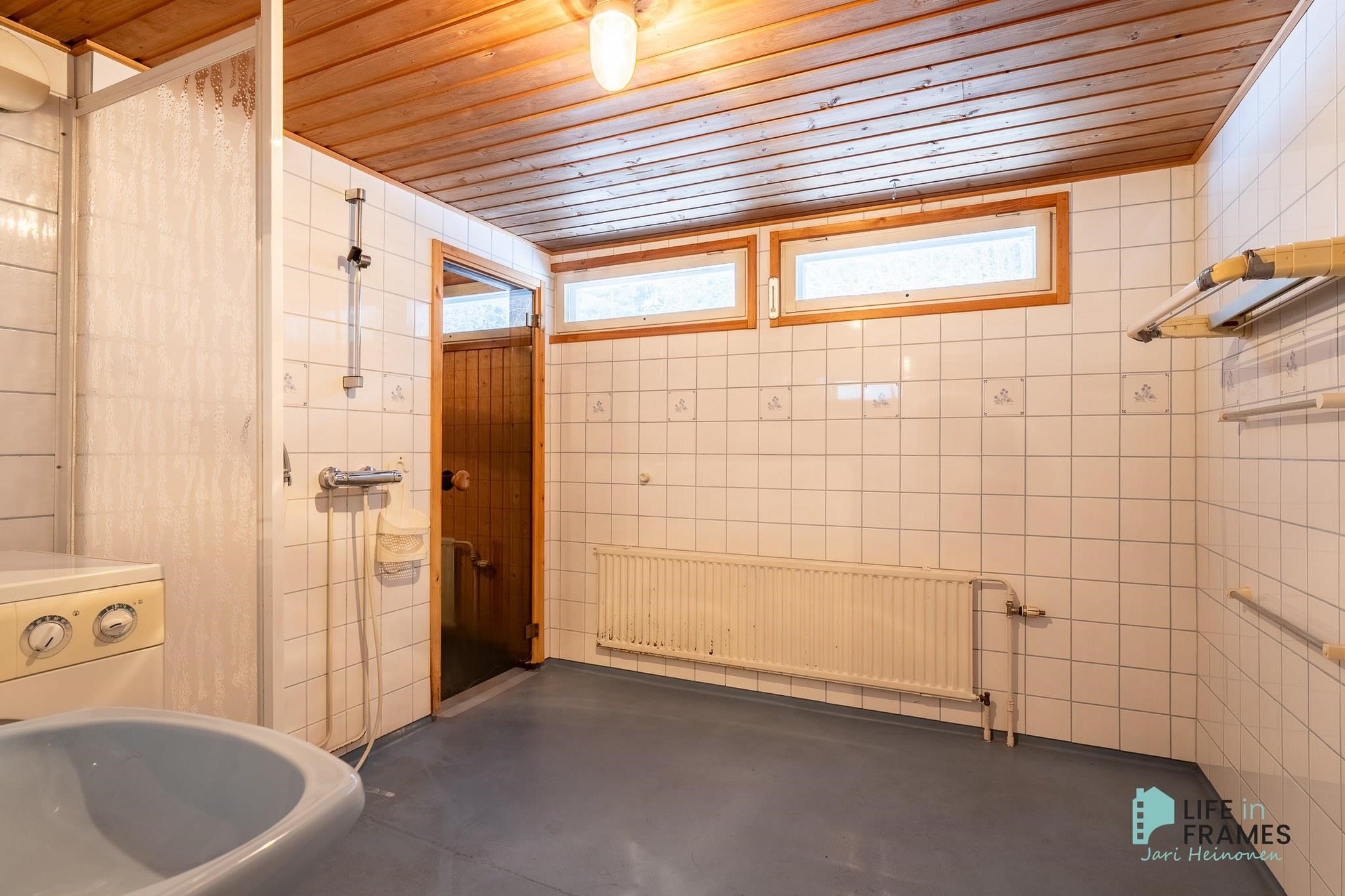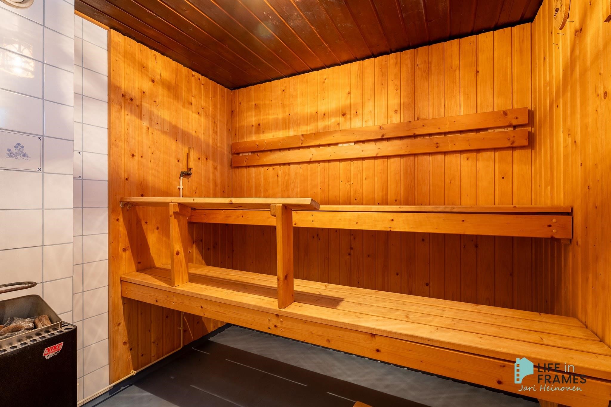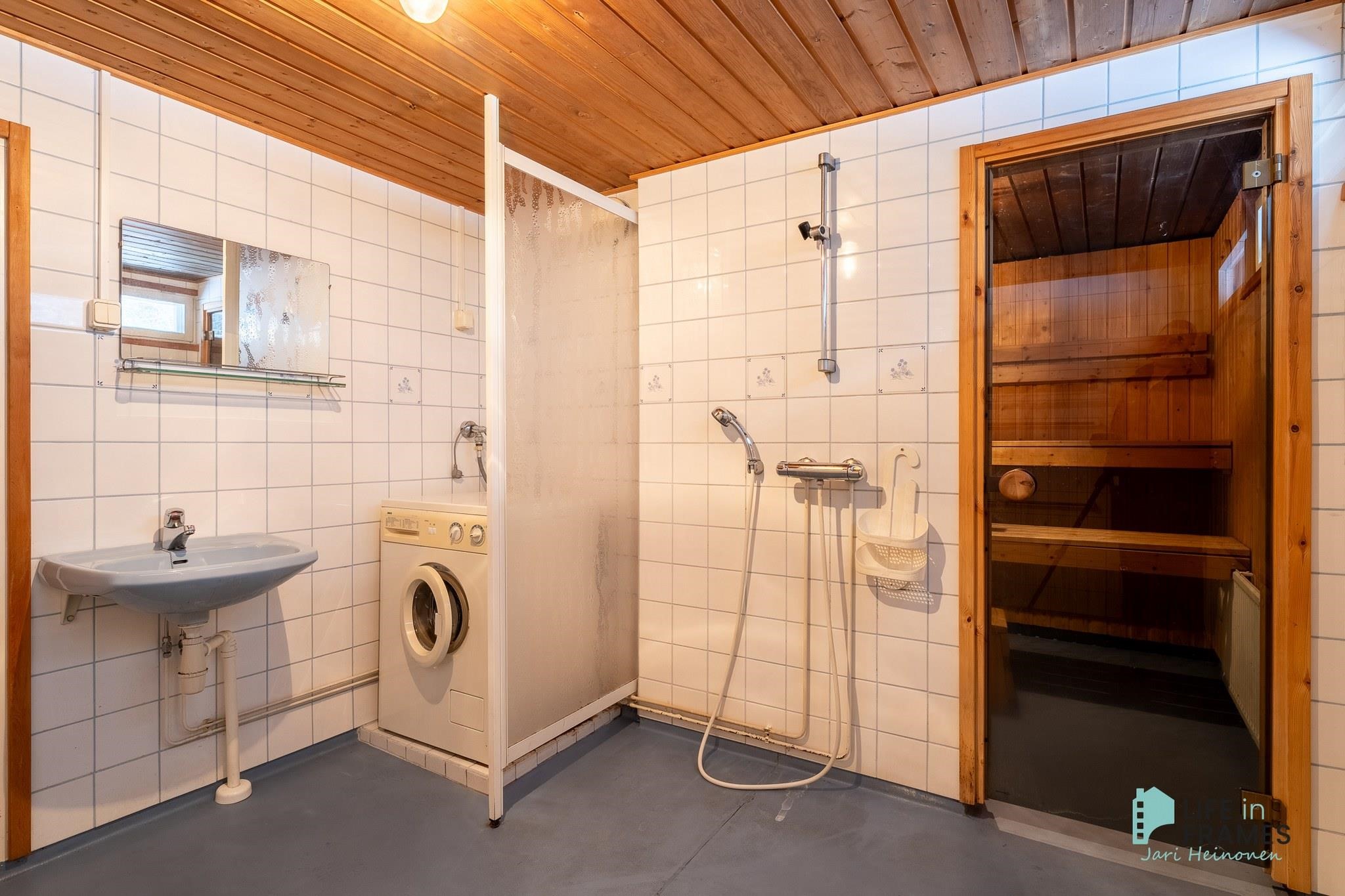 - Sauna, sähkökiuas, kylpyhuone, erillinen wc, suihku, suihkuseinä, pesukoneliitäntä, kiinteät valaisimet.