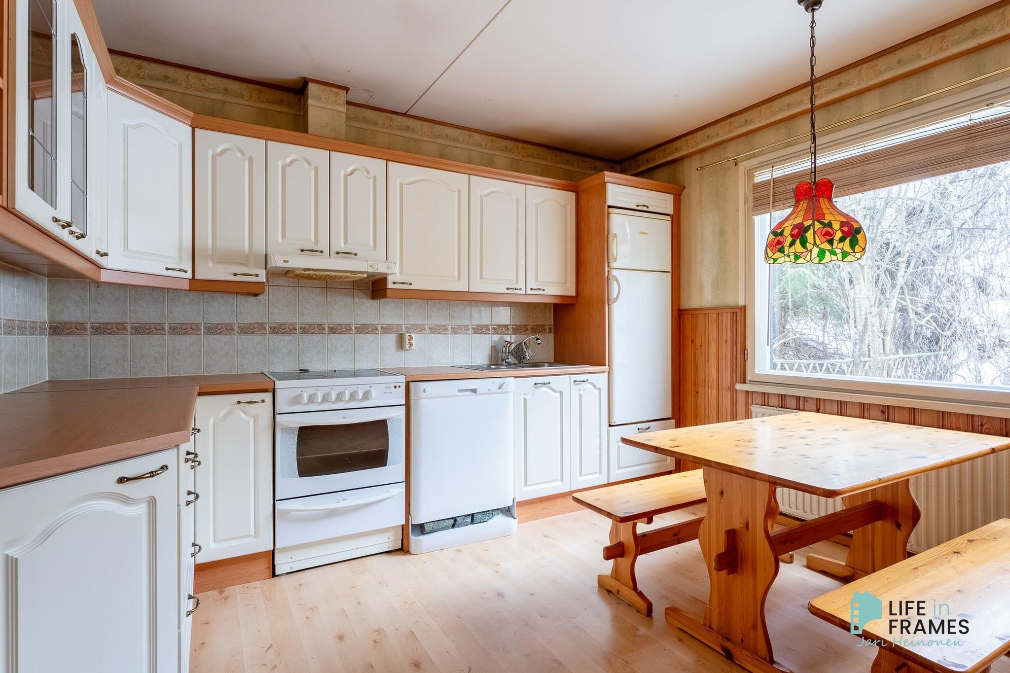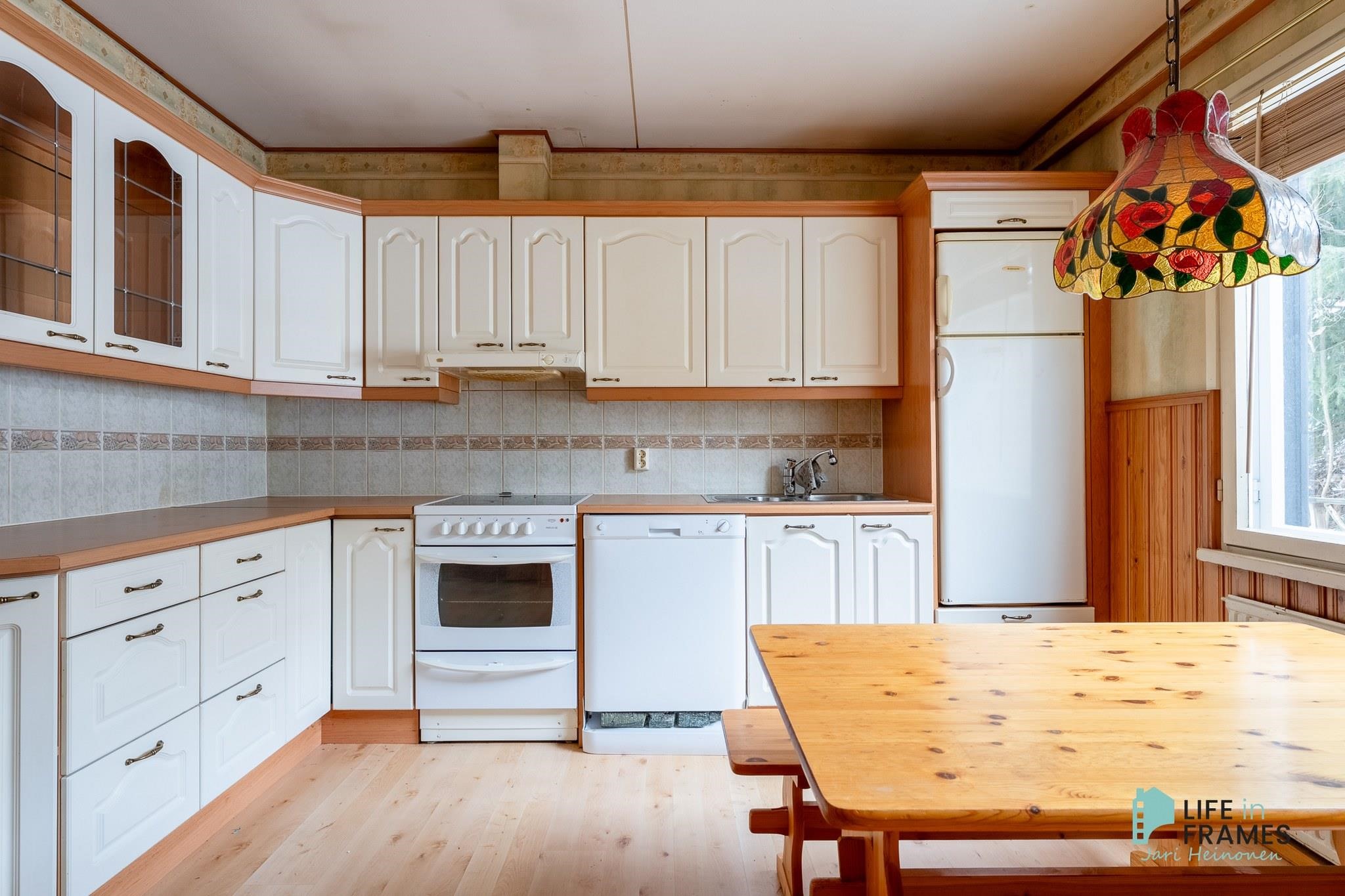 - Jääkaappipakastin, keraaminen liesi, liesikupu, astianpesukone, kaapistot, kiinteät valaisimet.