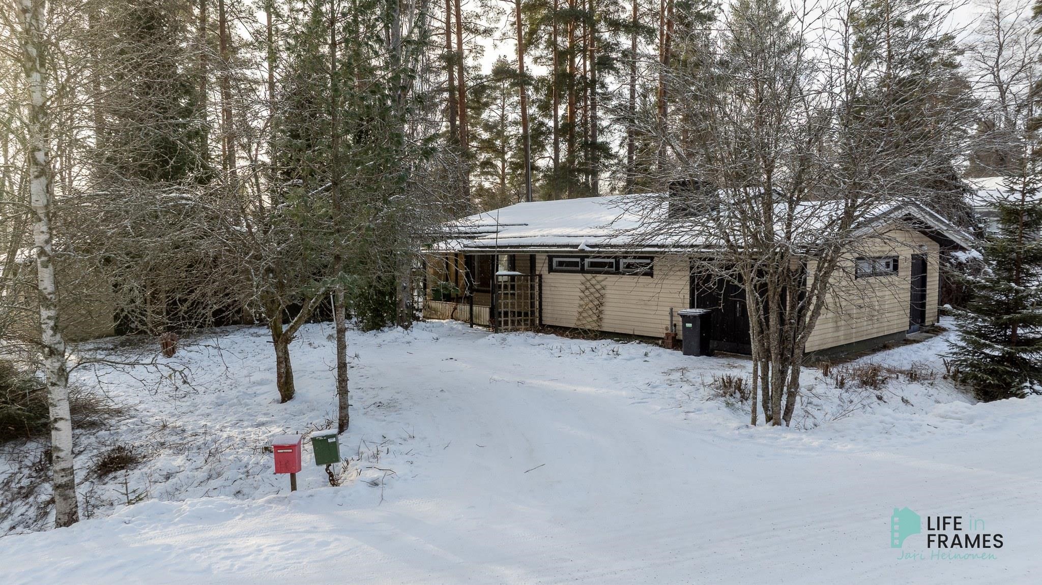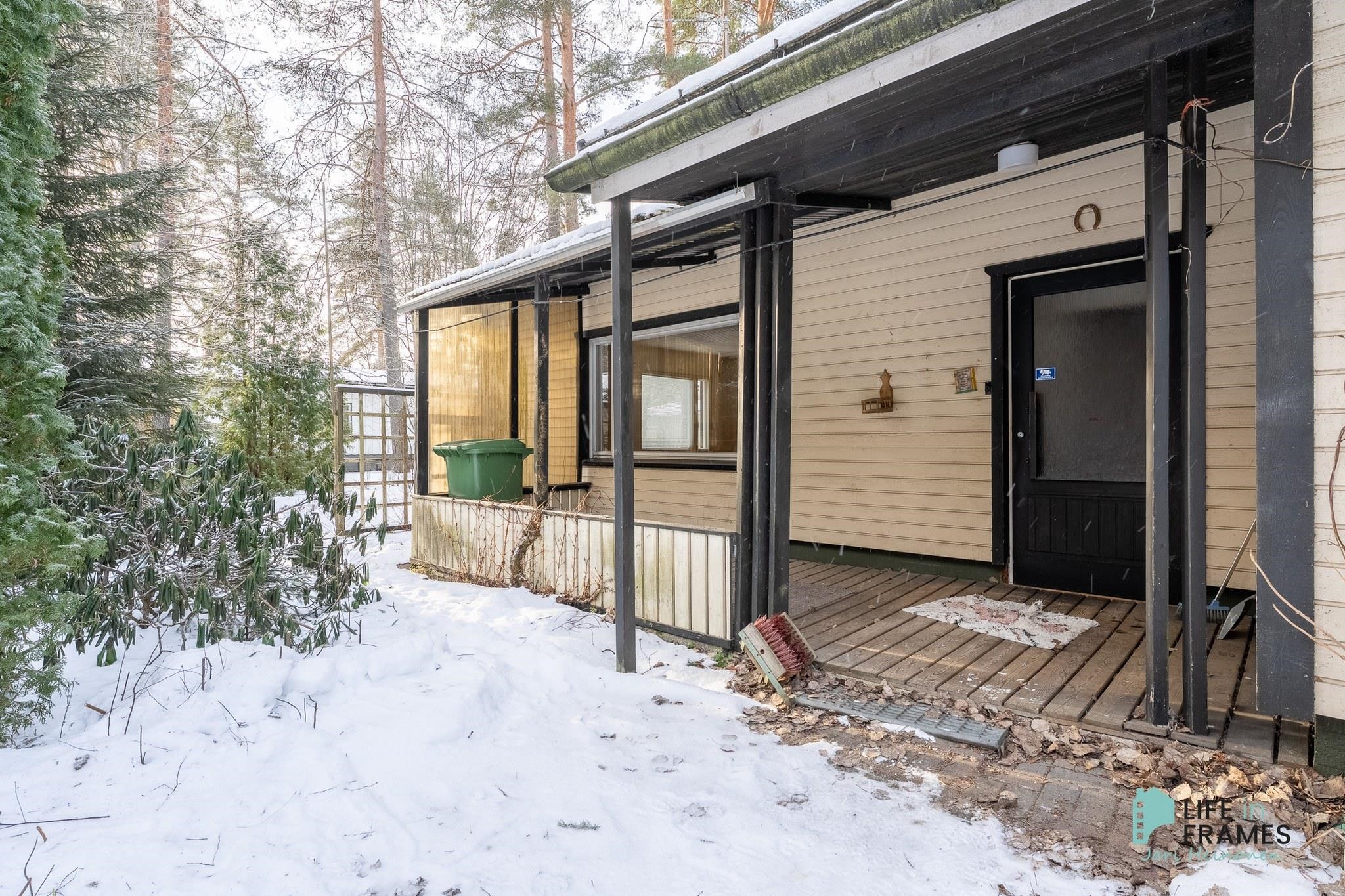 Talossa on iso olohuone, 2 makuuhuonetta, tilava keittiö, takkahuone sekä wc ja pesutilat. Sisäänkäynnin yhteydessä on katettu terassi.