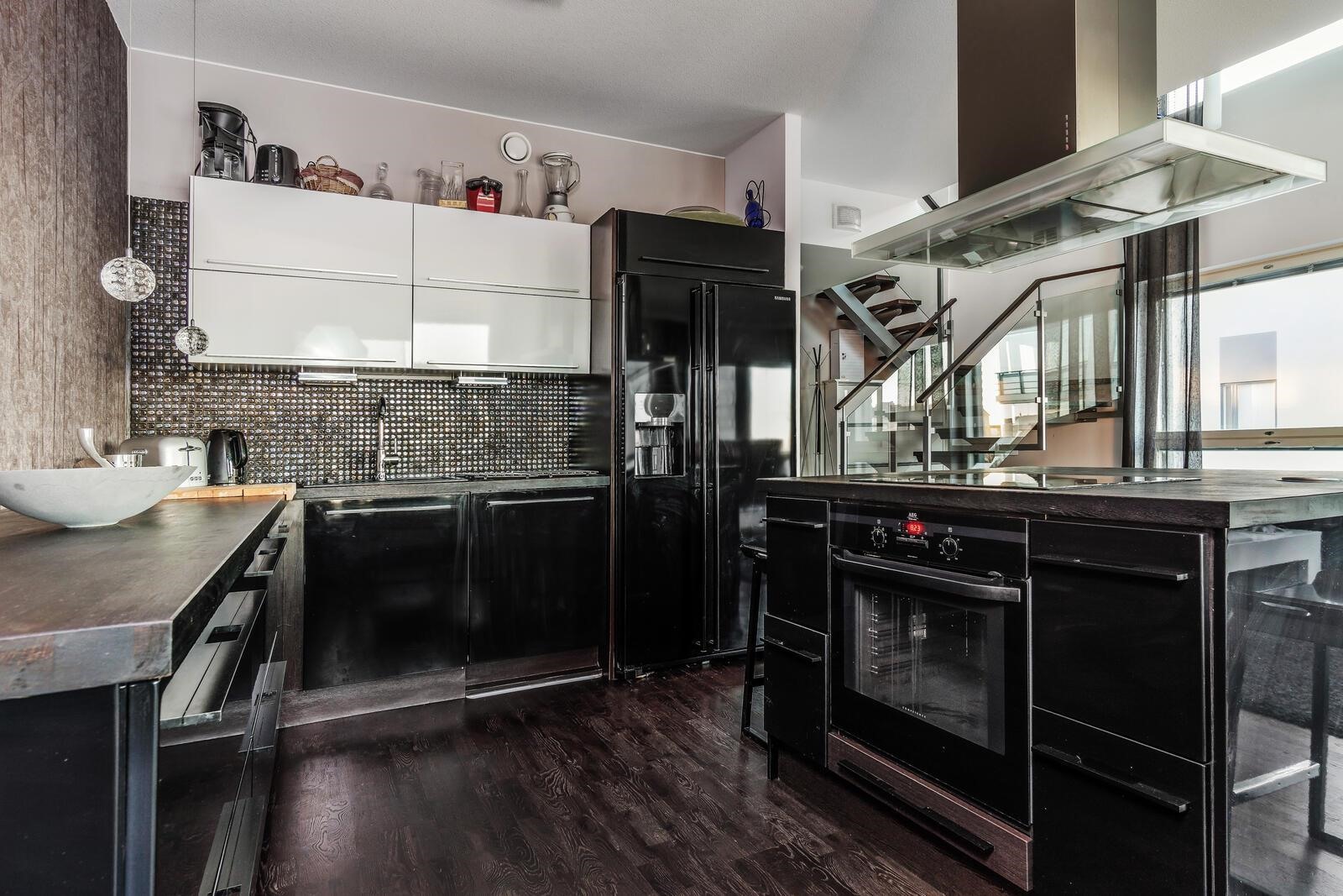 - Jääkaappipakastin, erillisuuni, liesitaso, induktioliesi, liesituuletin, mikroaaltouuni, astianpesukone, kaapistot, kiinteät valaisimet.