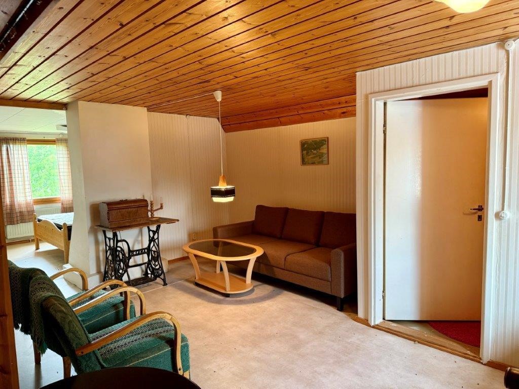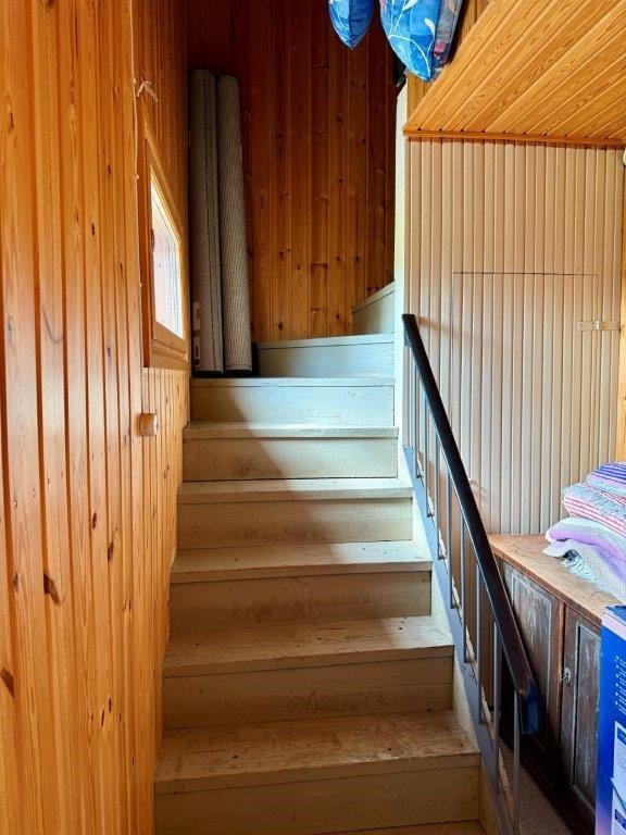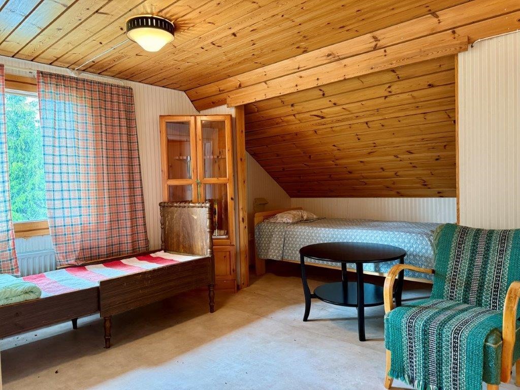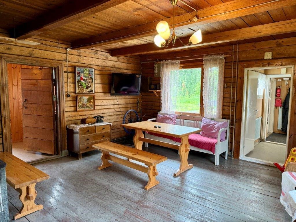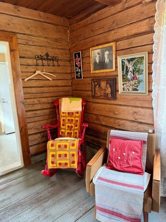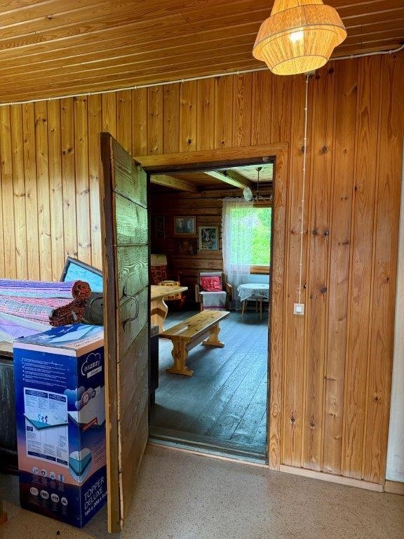 Keittiö: laminaattilattia. Olohuone: maalattu puulattia, hirsiseinät. Makuuhuone 1: laminaattilattia. Eteinen: maalattu puulattia. Wc: muovimatto. Pesuhuone: muovimatto. Yläkerran tilat: muovimatto.