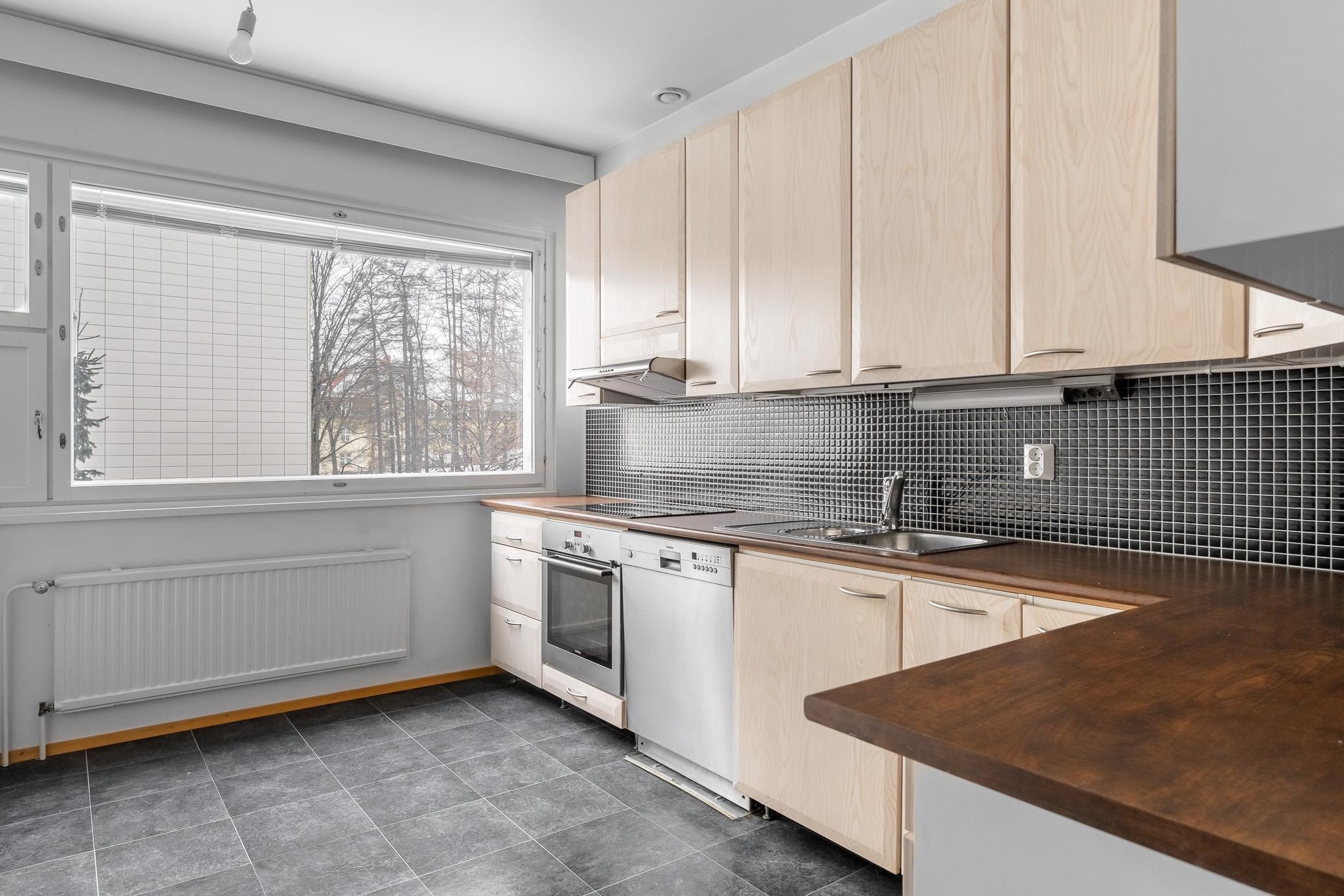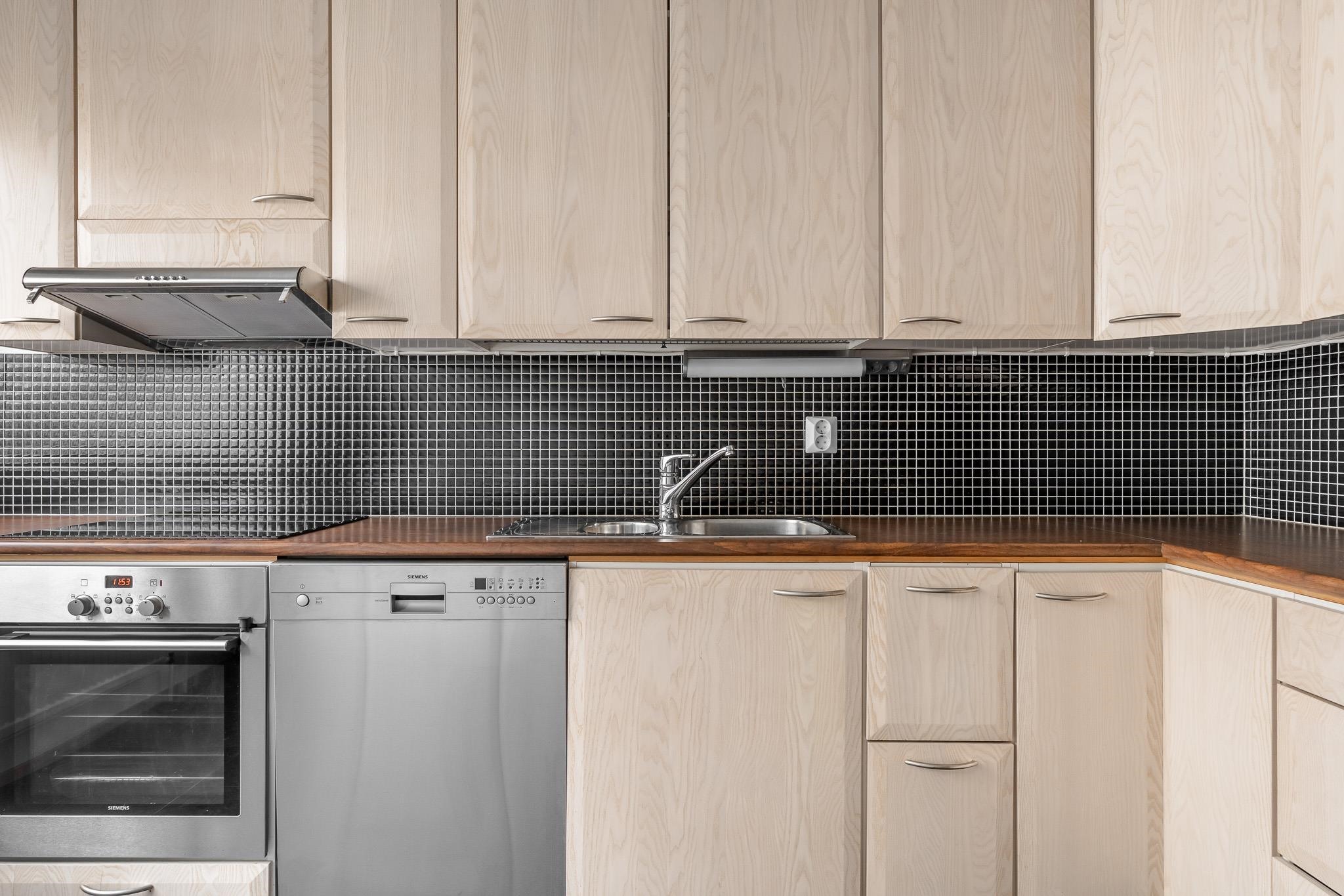 - Jääkaappipakastin, erillisuuni, liesitaso, induktioliesi, liesituuletin, astianpesukone, kaapistot, kiinteät valaisimet. Erillinen pakastin