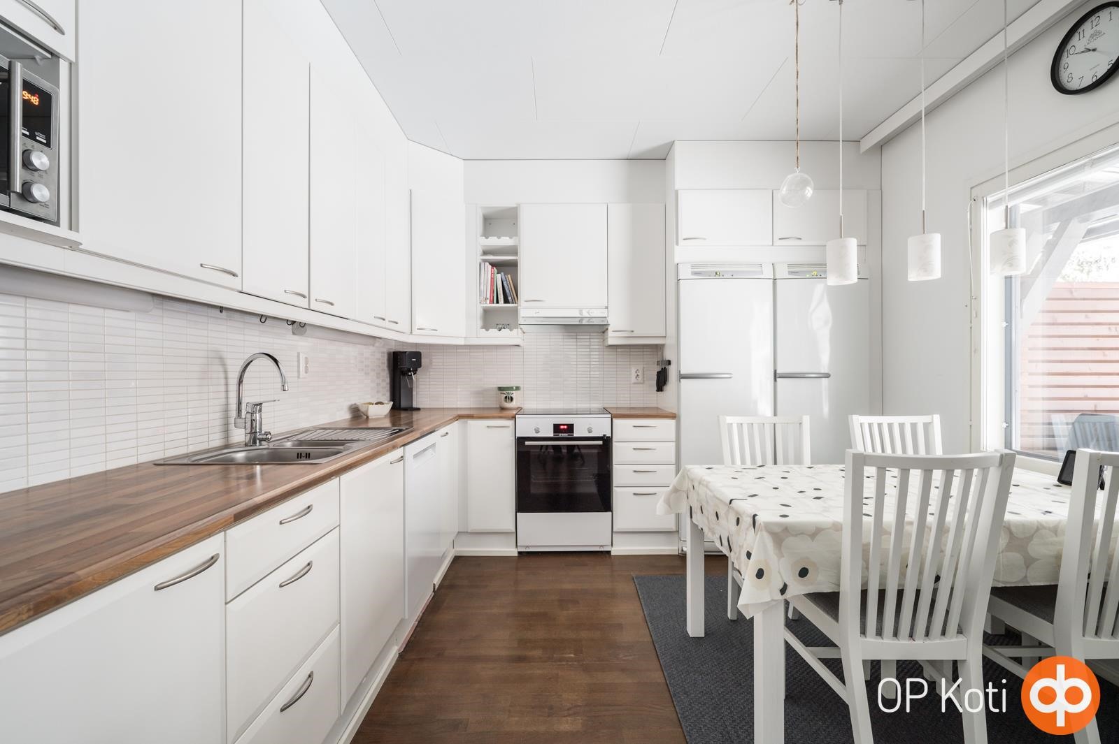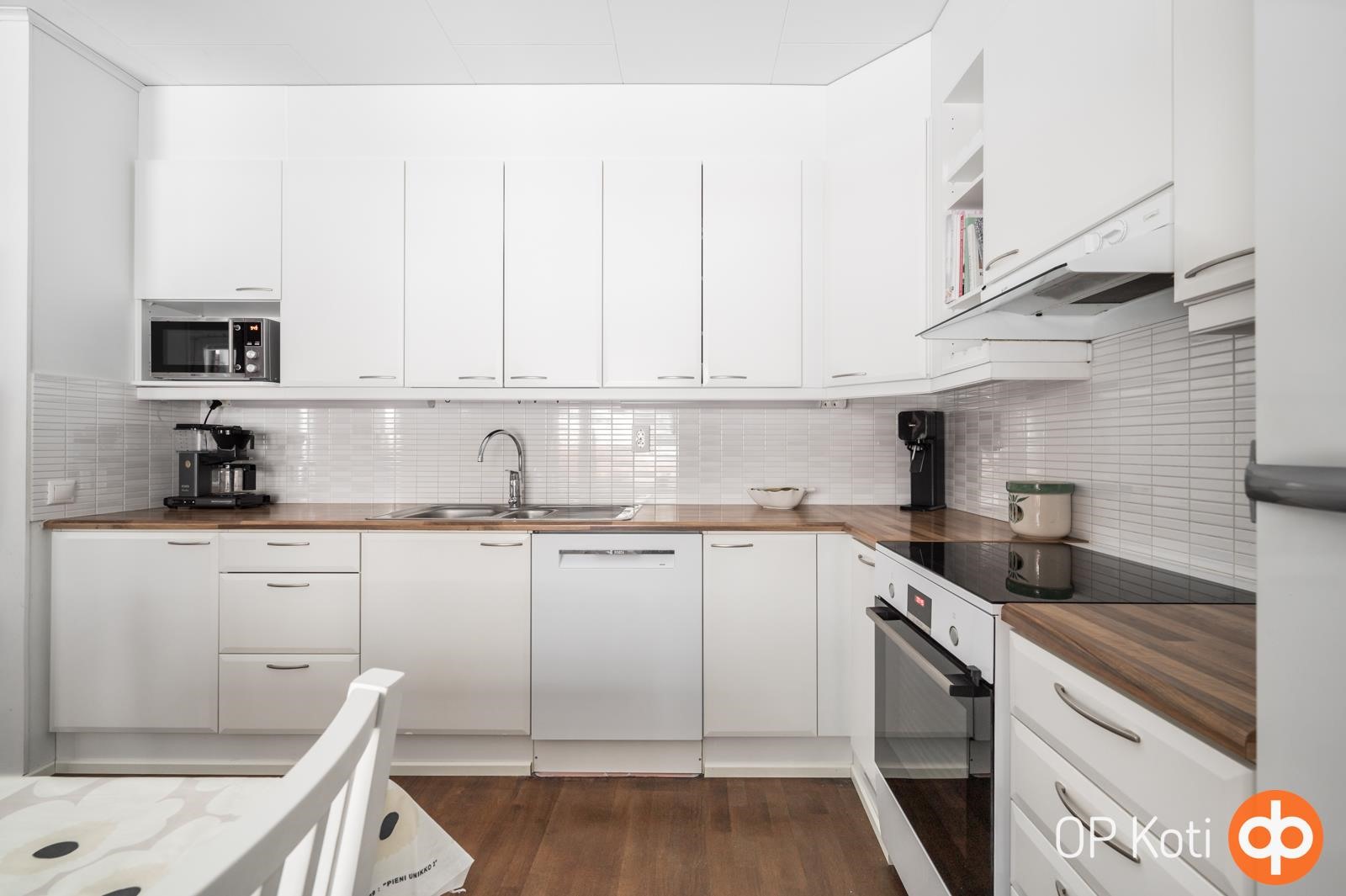 - Jääkaappi täyskorkea, pakastekaappi täyskorkea, induktioliesi uusittu 2024, liesituuletin hormiin, astianpesukone uusittu 2024, kaapistot, kiinteät valaisimet.