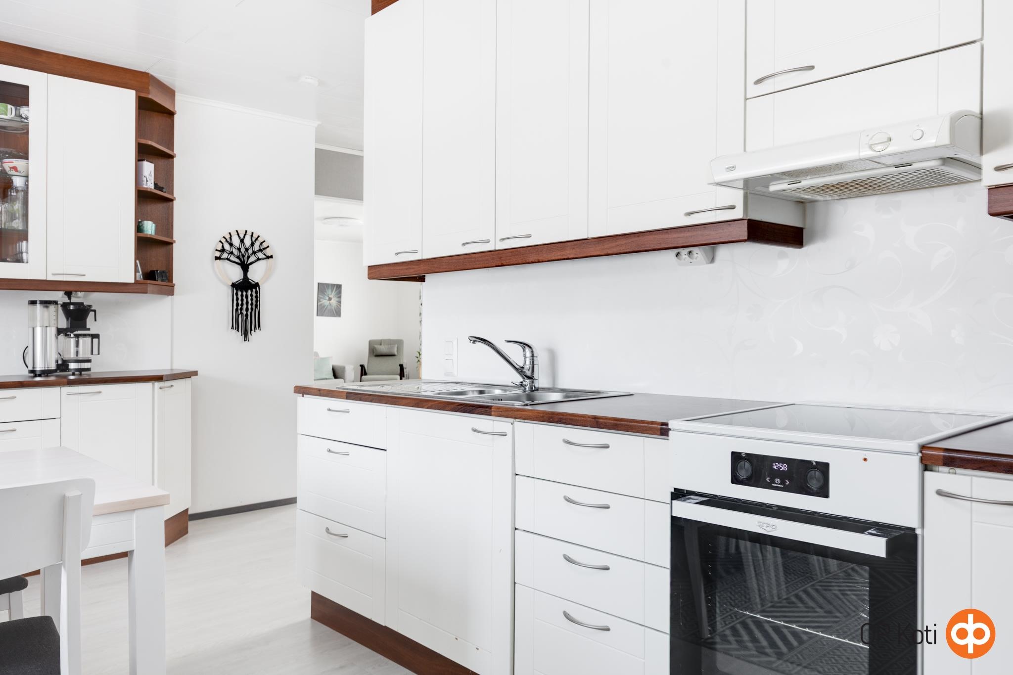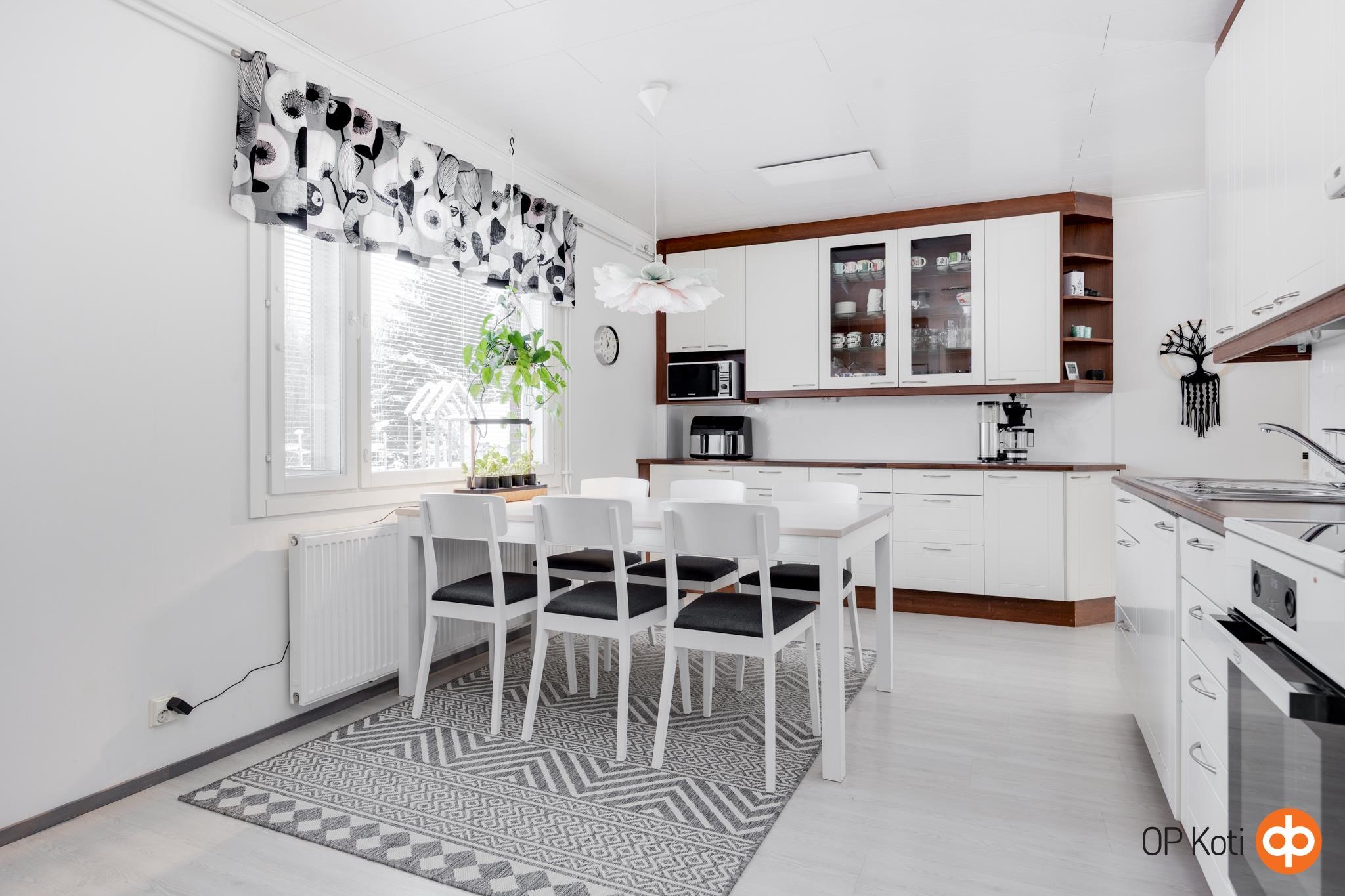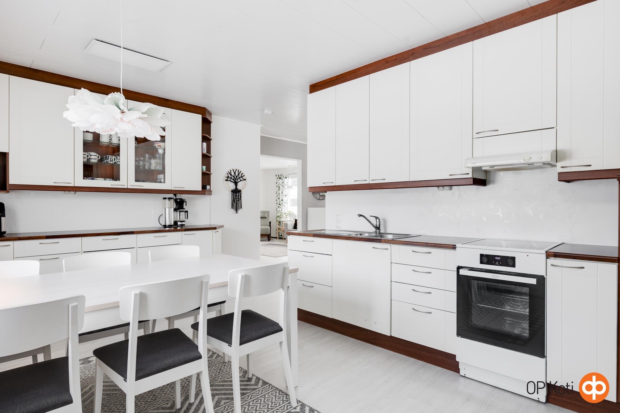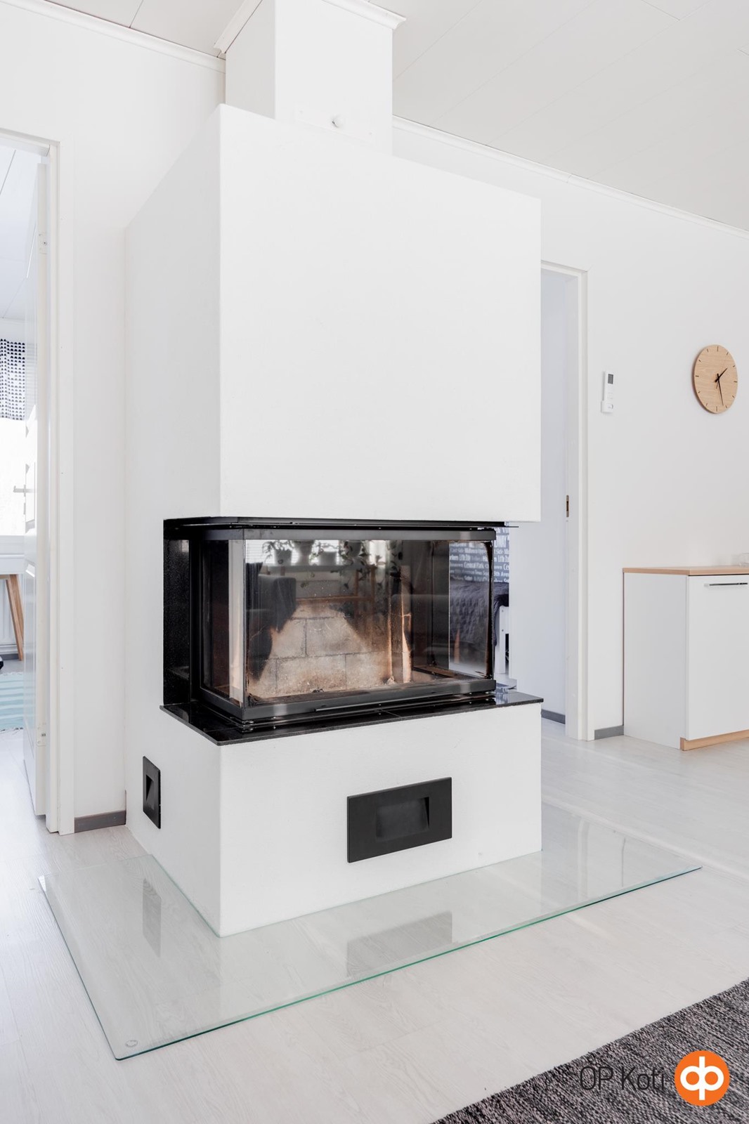 Tämä koti tarjoaa puitteet monenlaiselle perheelle. Kolme makuuhuonetta, erillinen työhuone ja avara olohuone luovat mahdollisuudet sekä rauhalliseen arkeen että yhteiseen ajanviettoon. Keittiö on käytännöllinen ja remontoitu vastaamaan nykypäivän tarpeita, ja olohuoneen yhteyteen muurattu uusi takka tuo lämpöä ja tyylikkyyttä. Kaksi wc:tä, tilava pesuhuone ja oma sauna helpottavat arjen sujuvuutta. Arkieteinen tekee kotiin saapumisesta toimivaa, ja myös säilytystilaa kodissa on runsaasti.