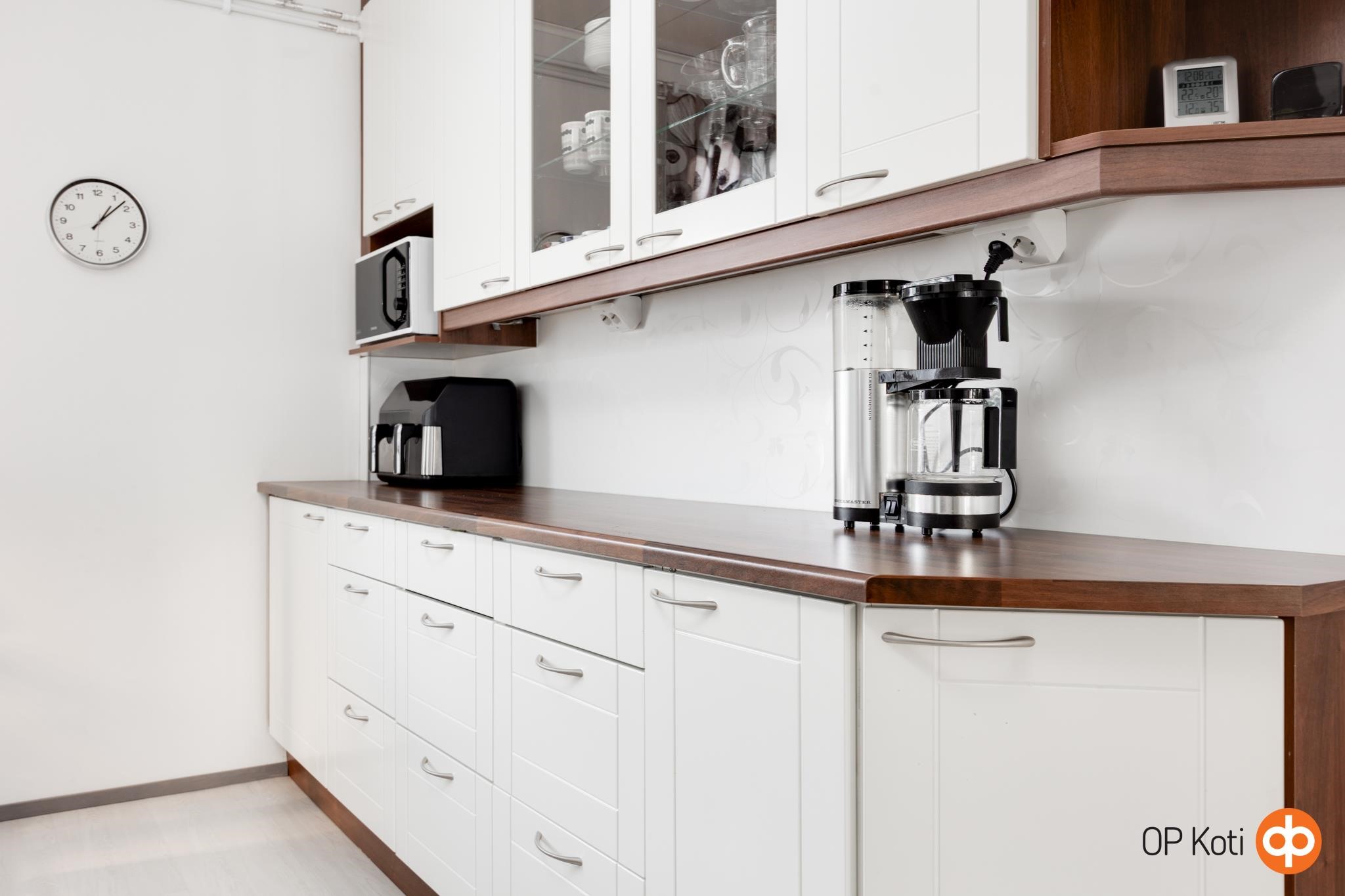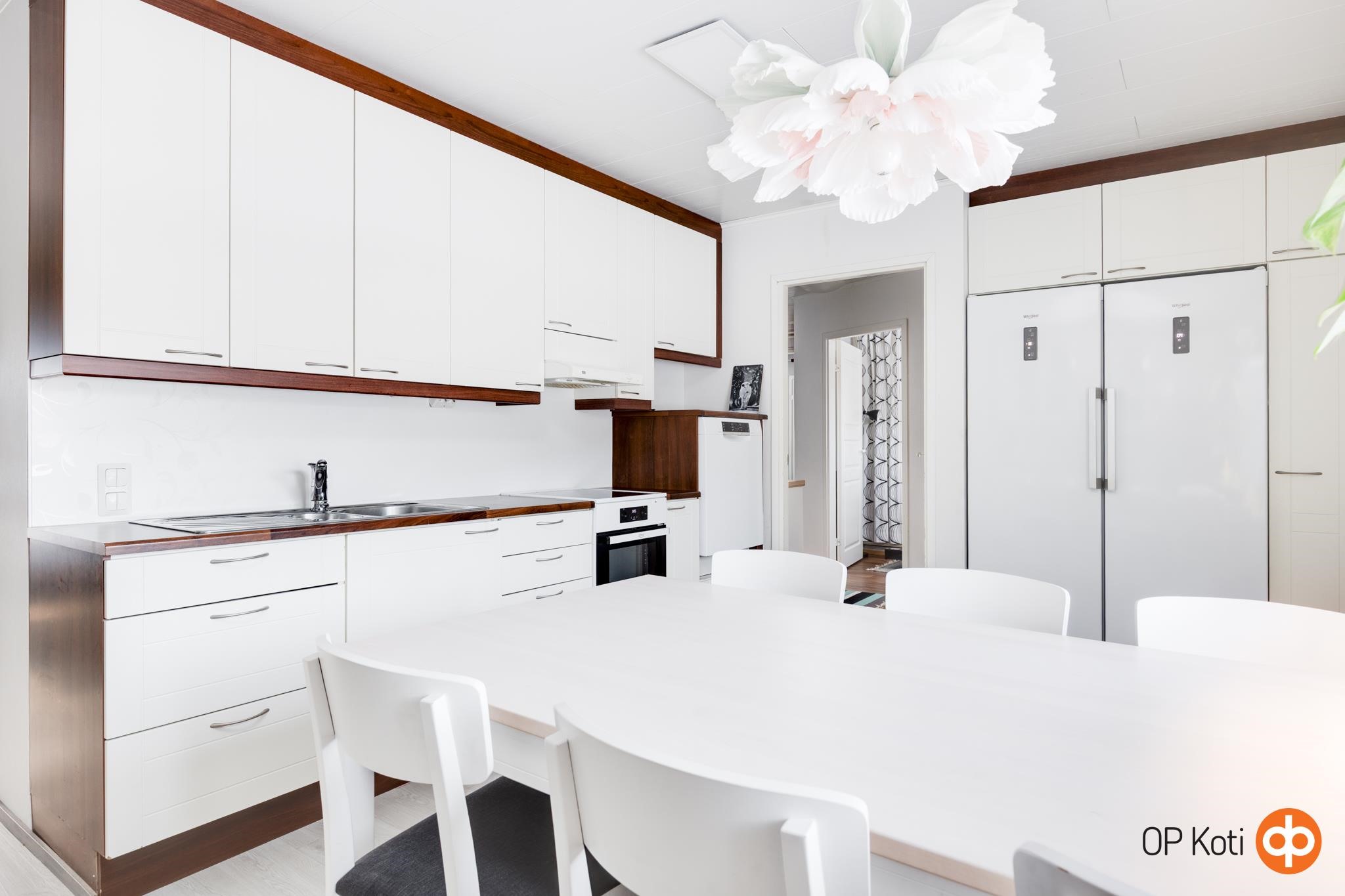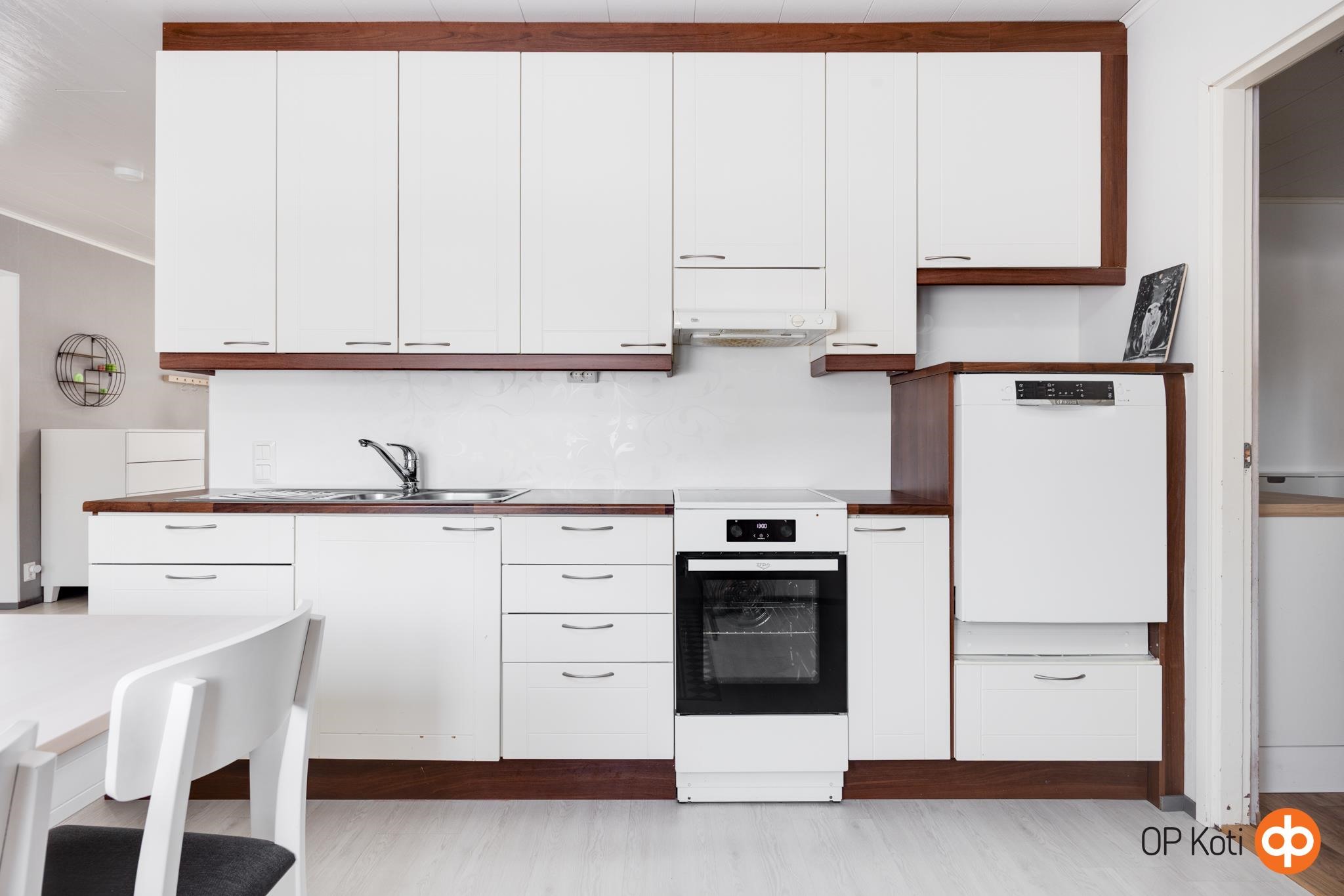 - Jääkaappi, pakastekaappi, lattialiesi, induktioliesi, liesituuletin, astianpesukone, kaapistot, kiinteät valaisimet, pöytätasojen materiaali Laminaatti. Keittiön kaapistot uusittu vuonna 2006.