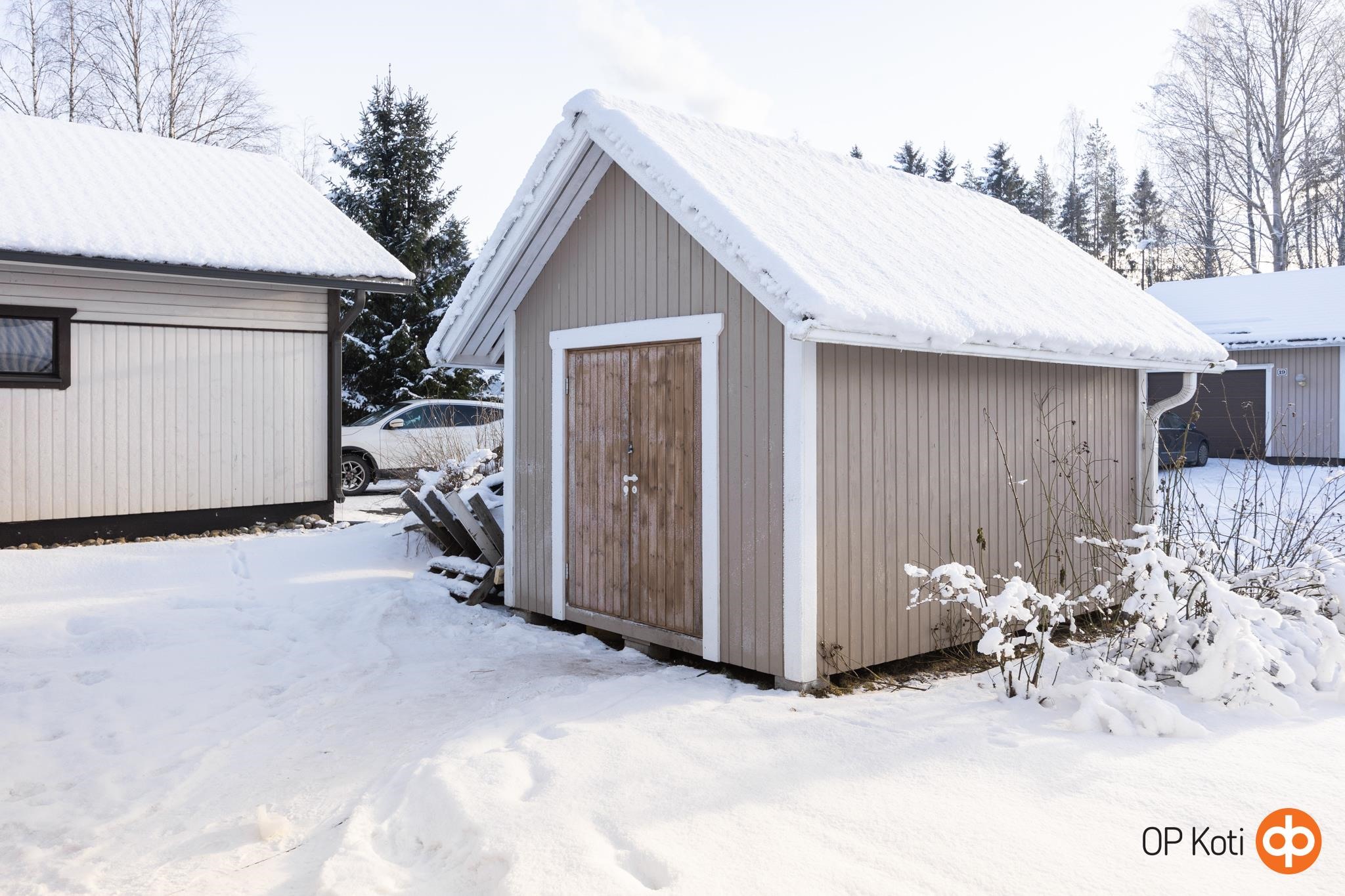 - 124,8 m2Kerrosala laajennuksen rakennusluvan (1996) mukainen 156m². Asuintilojen pinta-alat eivät ilmene asiakirjoista. Asuintiloihin luetaan tuulikaappi, eteinen, olohuone, keittiö, makuuhuoneet, työhuone, vaatehuone, wc, kylpyhuone ja sauna.