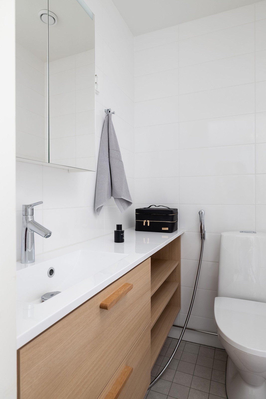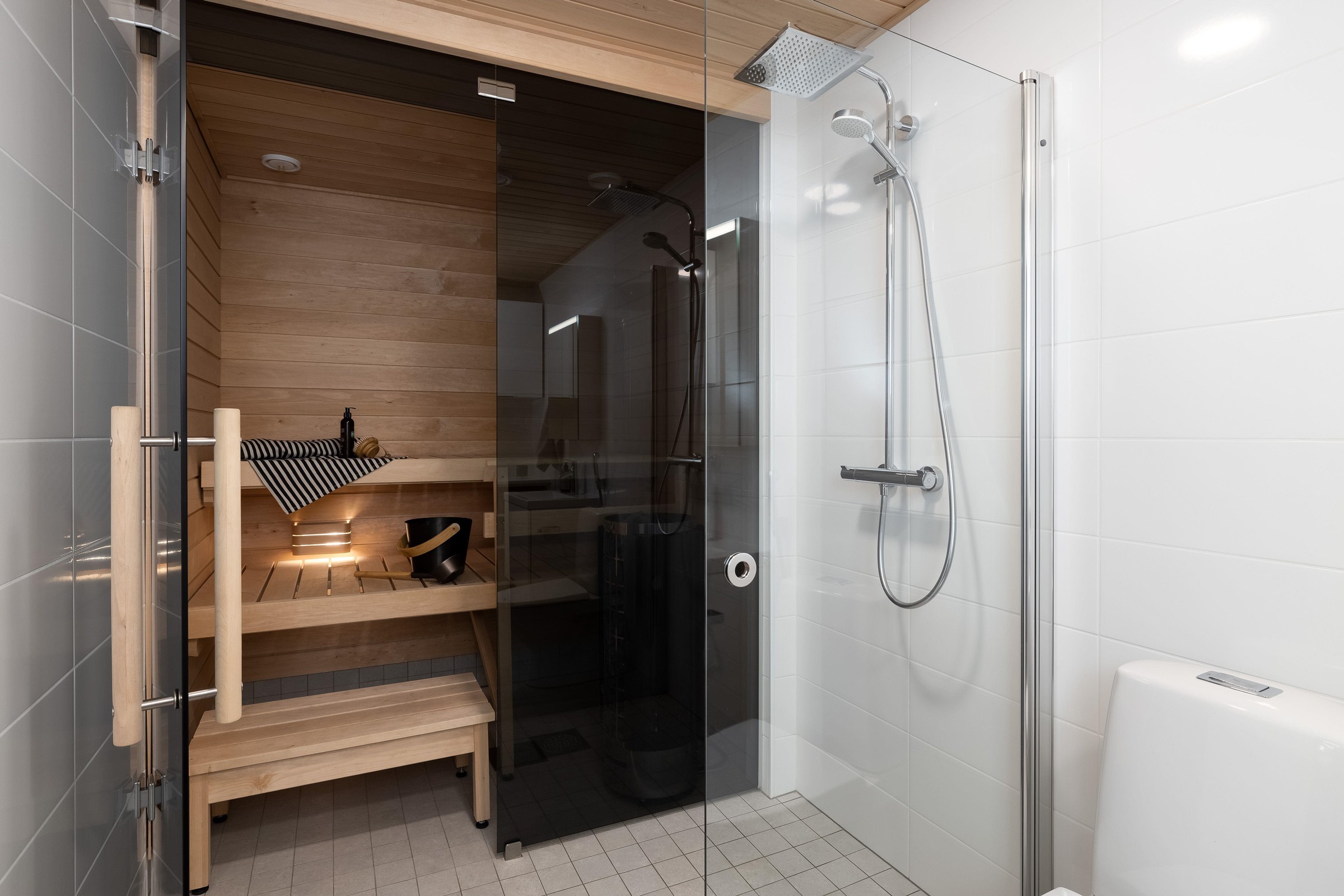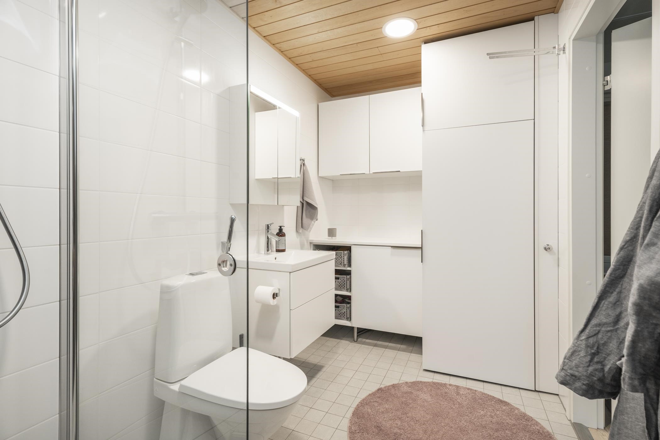 - Sauna, sähkökiuas, kylpyhuone, erillinen wc, suihku (sadesuihku), suihkuseinä (kääntyvä lasinen), peilikaappi, kaapit, allaskaappi, pesukoneliitäntä, lattialämmitys, kiinteät valaisimet. Erillinen wc / allaskaluste lisätty 2022 Kodinhoitohuoneen yläkaapit 2022