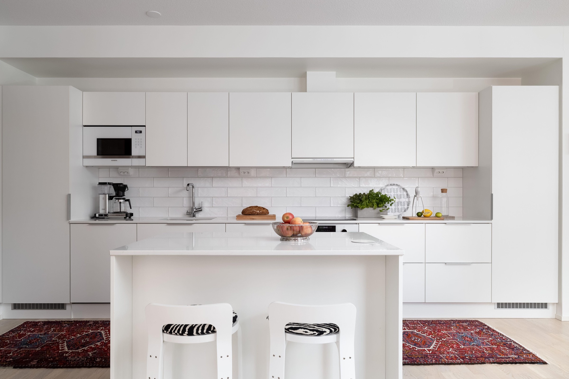 - Jääkaappi ja pakastekaappi (integroitu), erillisuuni, liesitaso (induktio), liesituuletin, mikroaaltouuni ja astianpesukone (integroitu), kaapistot, viinikaappi, irrallinen saareke, kiinteät valaisimet (työtasovalaisimet). Rakennusvaiheessa tehty tavallista suurempi saareke, välitilan laatoitus, kaapit vaihdettu valkoiseksi. Saareketta pystyy hallutessaan siirtämään ja siihen tulee sähköt.