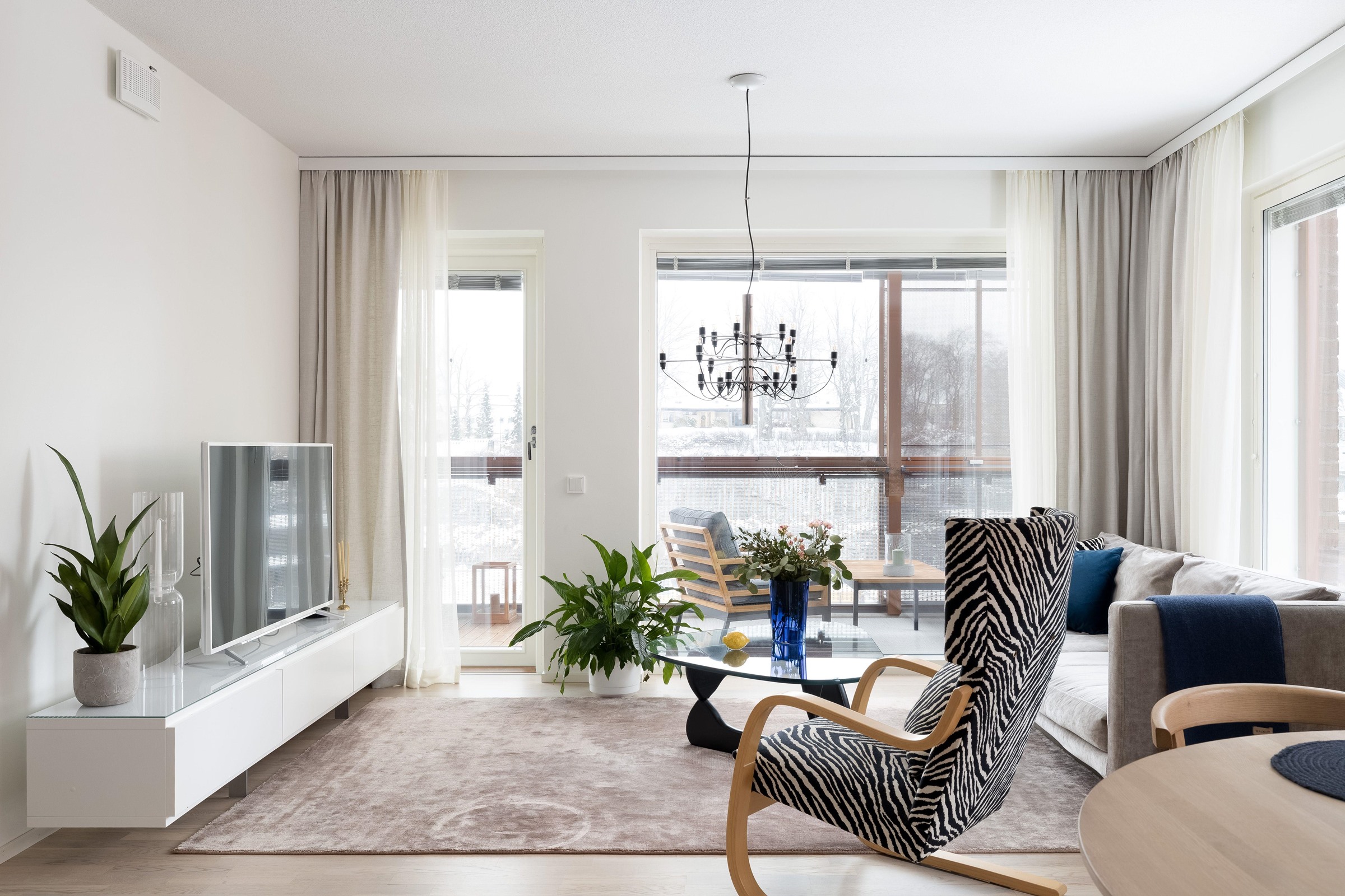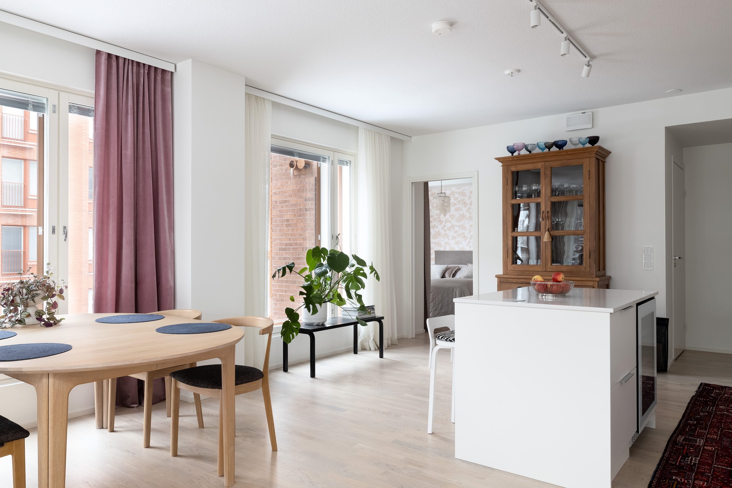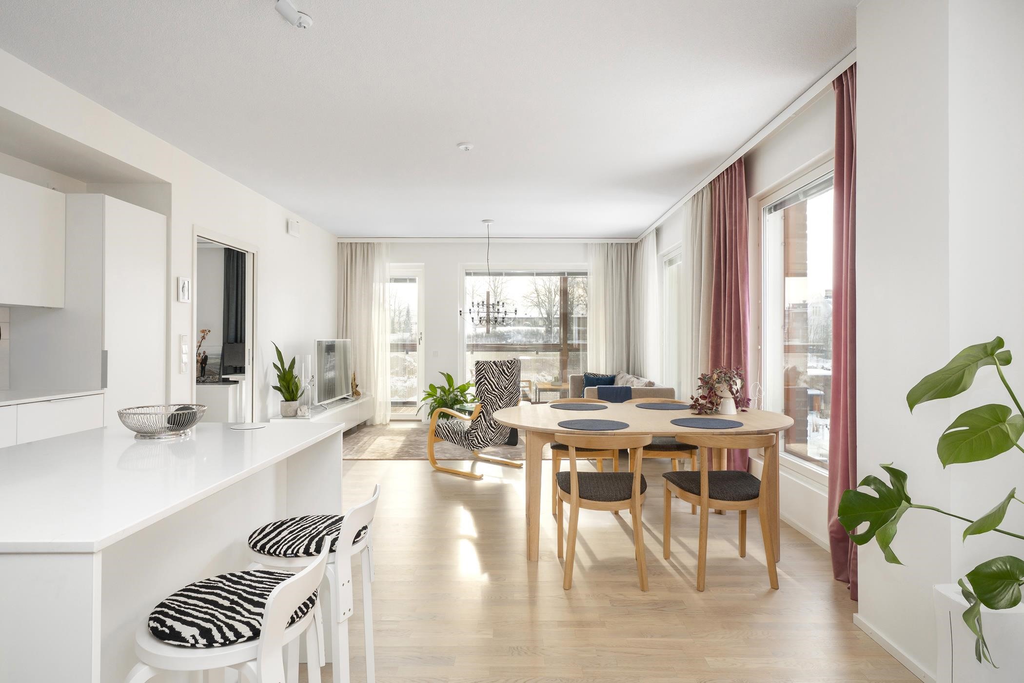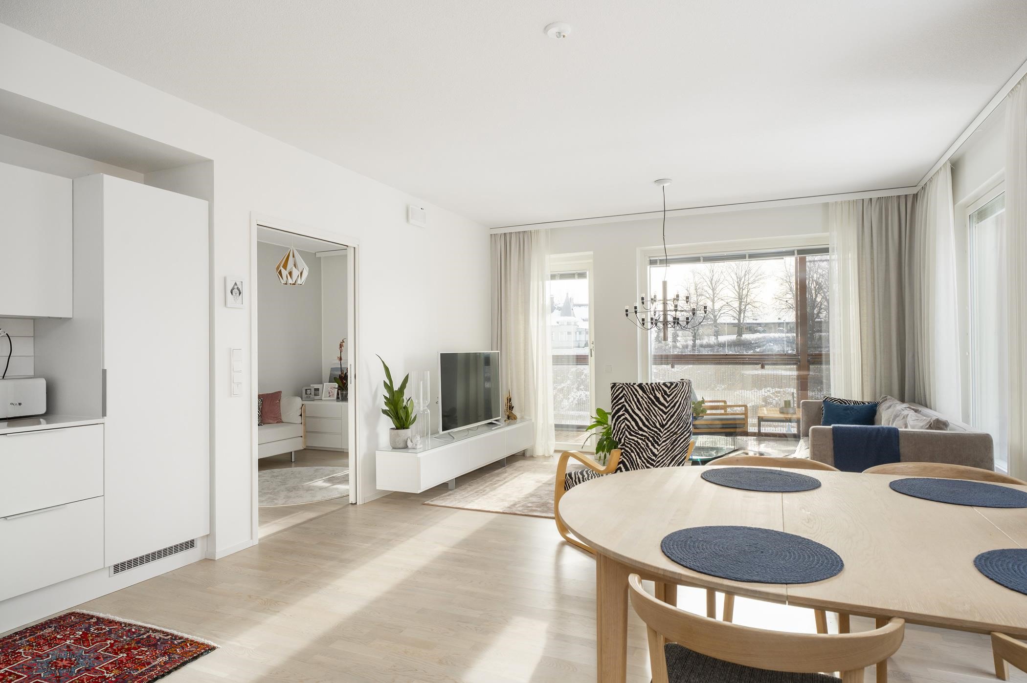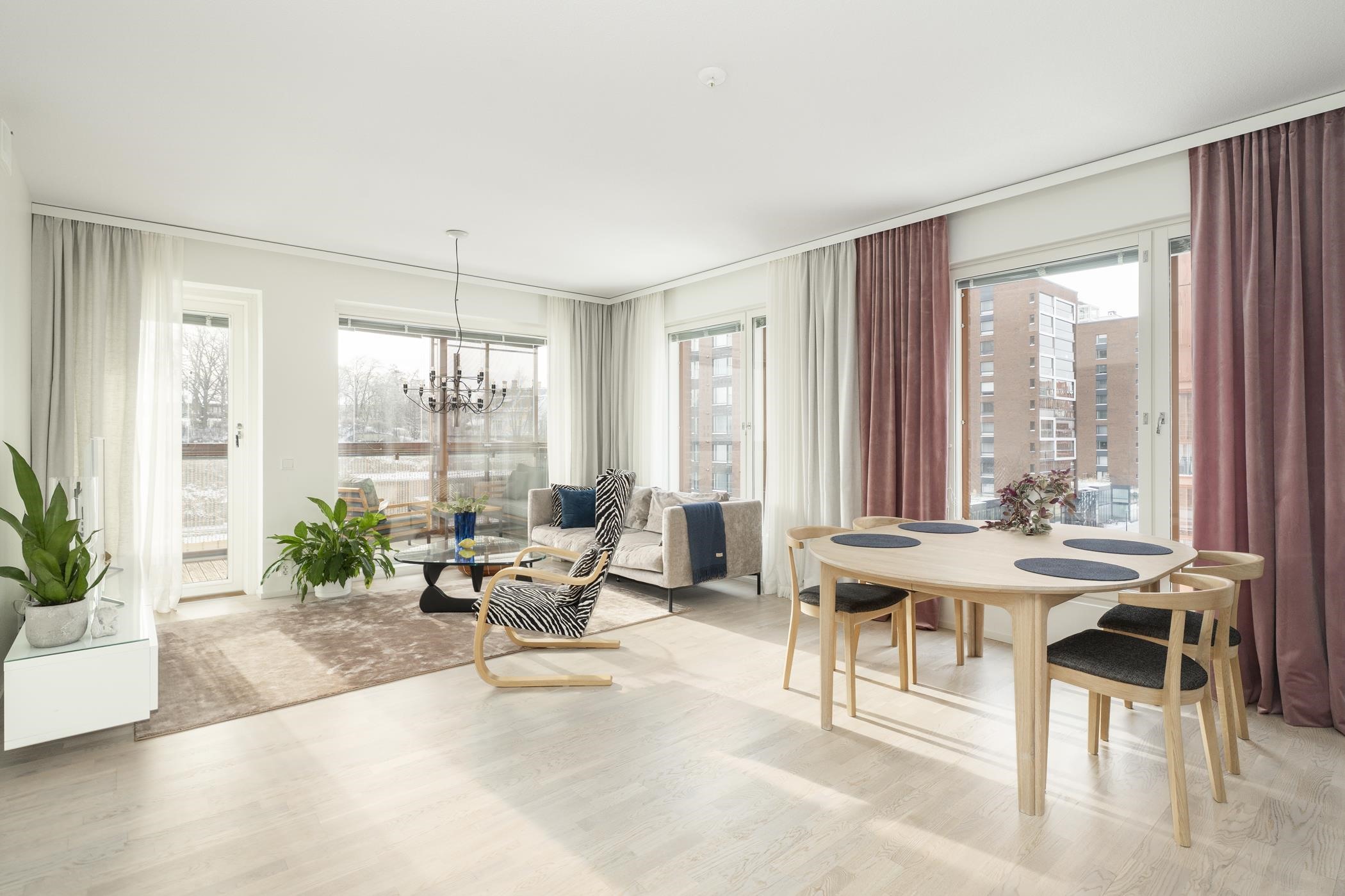Asunnon sydän on upea, avara olohuone, jonka suuret ikkunat avautuvat sekä etelään että länteen ja tuovat tilaan runsaasti luonnonvaloa. Harkittu pohjaratkaisu tarjoaa mahdollisuuden myös yhden lisähuoneen toteuttamiseen olohuoneen yhteyteen. Keittiö on laadukas kokonaisuus viinikaappeineen, integroiduin laittein ja muunneltavin ratkaisuin, ja kaksi lasitettua parveketta viimeistelevät asumismukavuuden. Toinen parvekkeista on aurinkoiseen etelään, toinen kauniisti ilta-auringon suuntaan. Makuuhuoneet ovat tilavia, kylpytilat modernit ja sauna kutsuva. Arjessa iloa tuovat myös käytännöllinen kodinhoitotila ja erinomaiset säilytysratkaisut. Lisäksi asumisviihtyvyyttä lisää huoneiston kaukokylmään kytketty vesikiertoinen lattiaviilennys.
