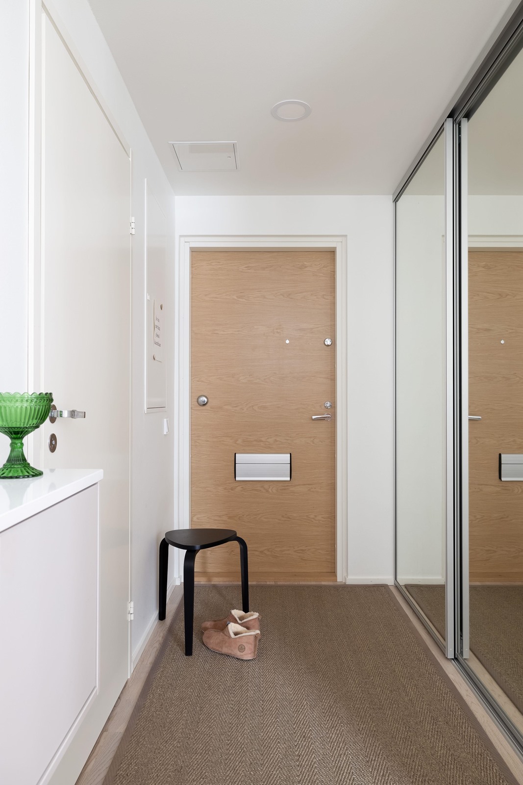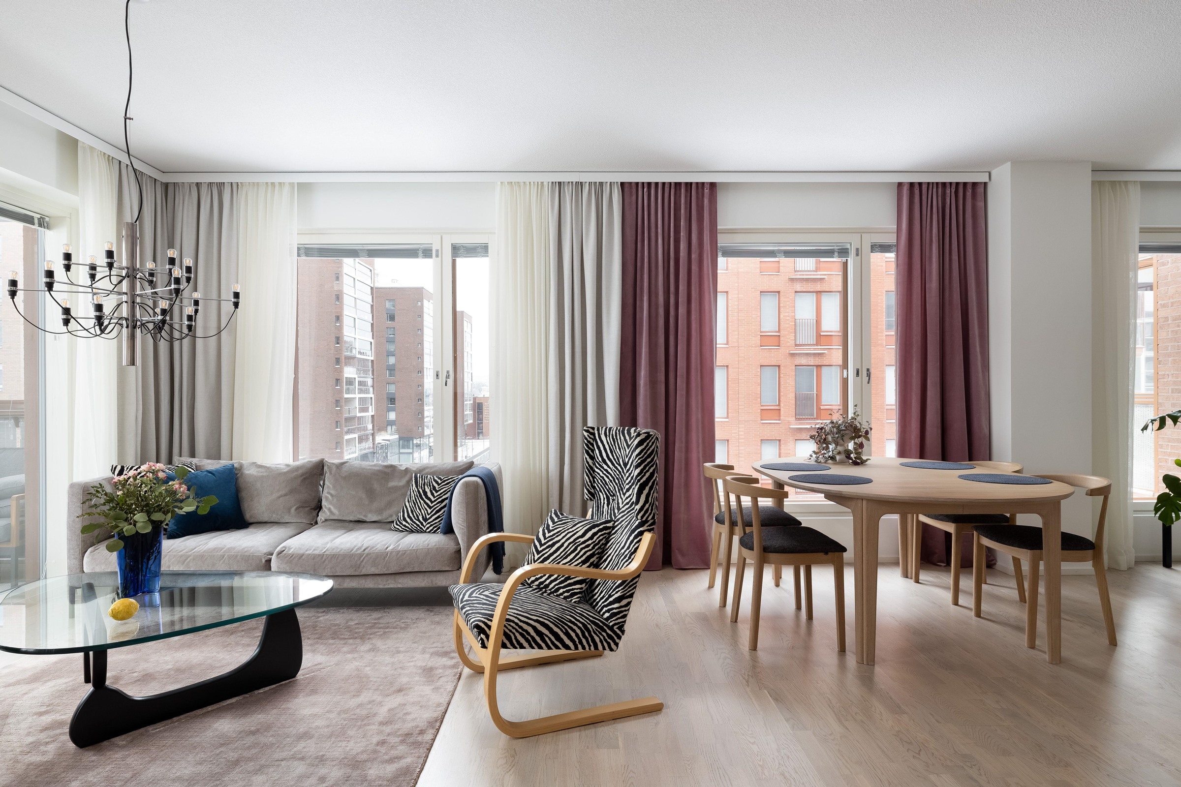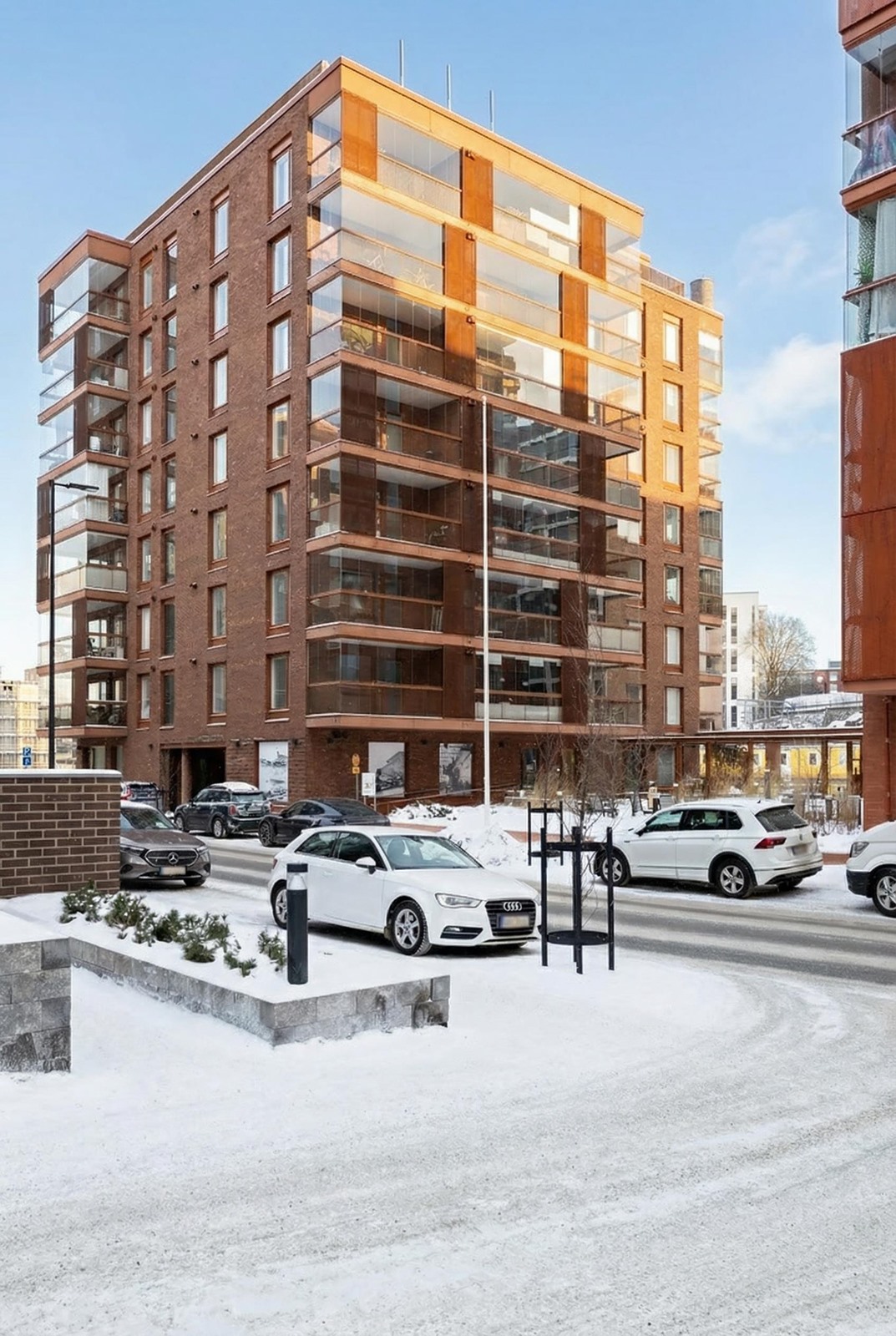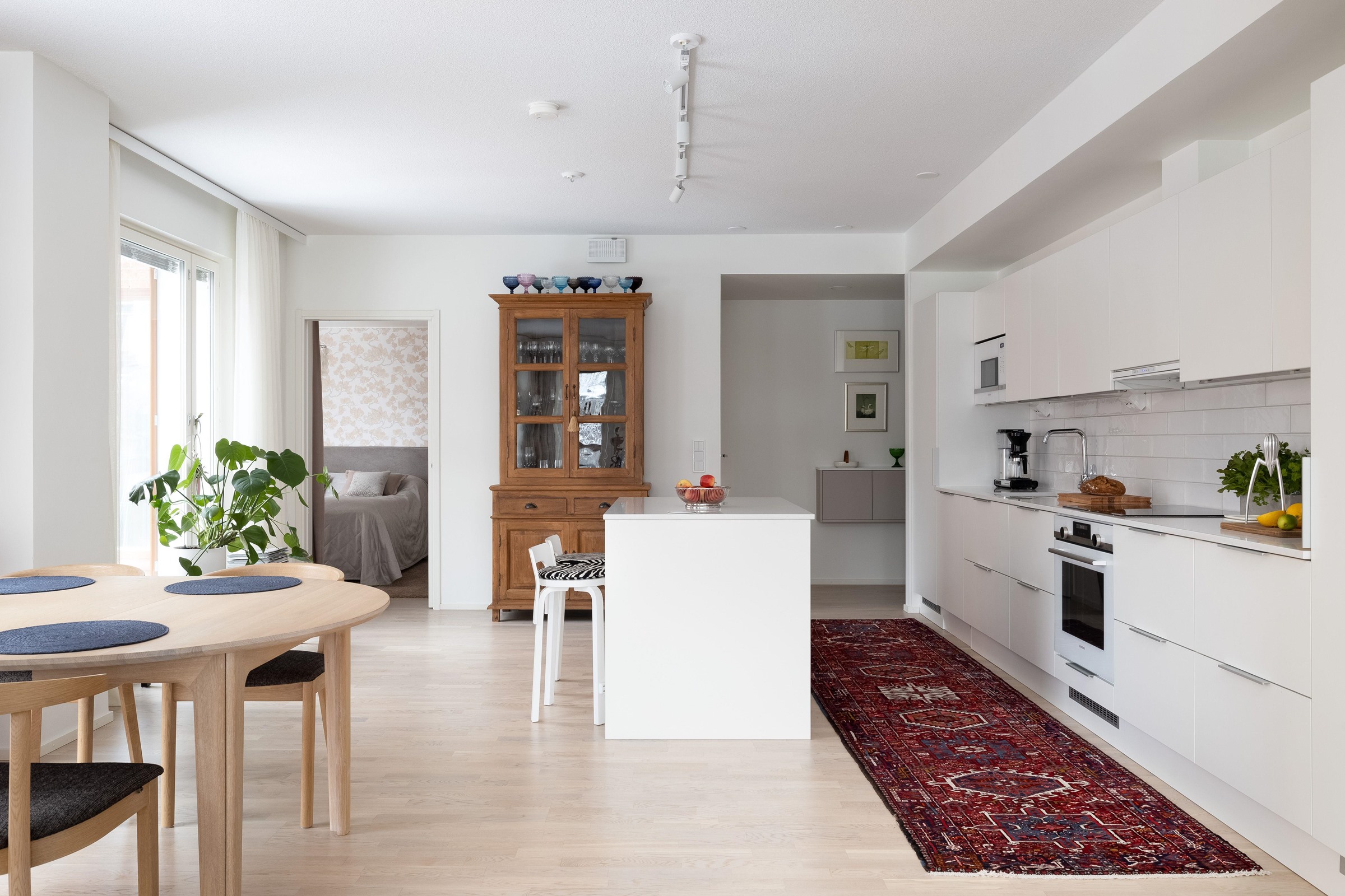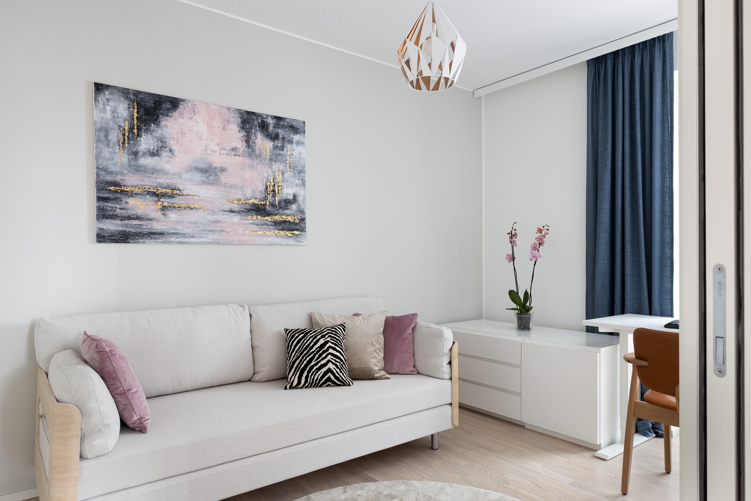 Asunnon sydän on upea, avara olohuone, jonka suuret ikkunat avautuvat sekä etelään että länteen ja tuovat tilaan runsaasti luonnonvaloa. Harkittu pohjaratkaisu tarjoaa mahdollisuuden myös yhden lisähuoneen toteuttamiseen olohuoneen yhteyteen. Keittiö on laadukas kokonaisuus viinikaappeineen, integroiduin laittein ja muunneltavin ratkaisuin, ja kaksi lasitettua parveketta viimeistelevät asumismukavuuden. Toinen parvekkeista on aurinkoiseen etelään, toinen kauniisti ilta-auringon suuntaan. Makuuhuoneet ovat tilavia, kylpytilat modernit ja sauna kutsuva. Arjessa iloa tuovat myös käytännöllinen kodinhoitotila ja erinomaiset säilytysratkaisut. Lisäksi asumisviihtyvyyttä lisää huoneiston kaukokylmään kytketty vesikiertoinen lattiaviilennys.