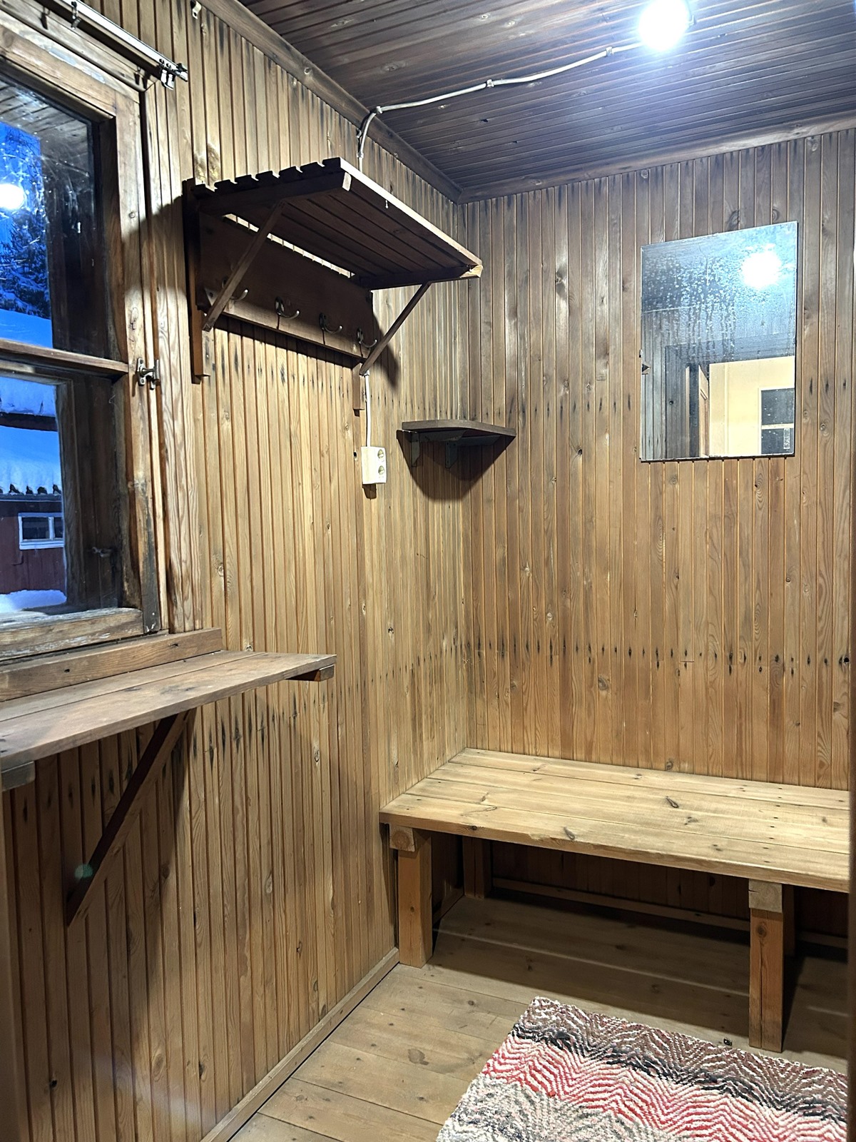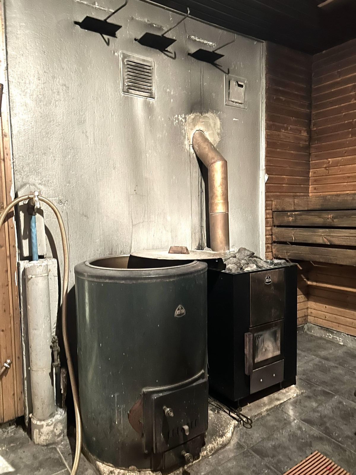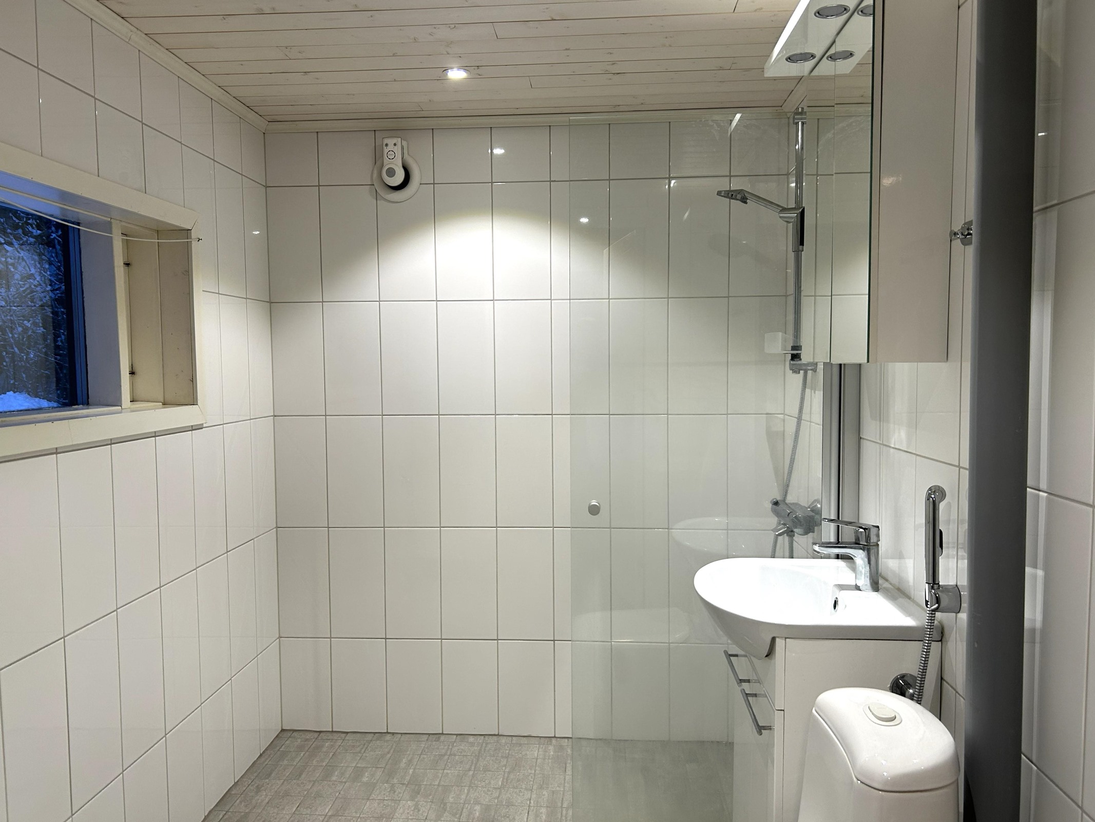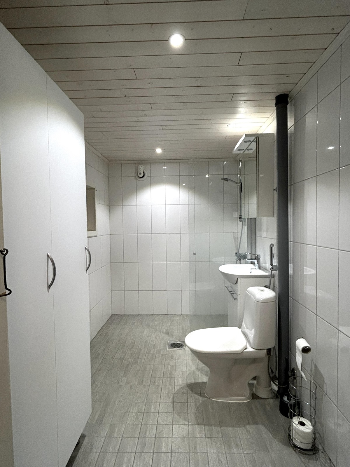 - Sauna, puukiuas, kylpyhuone, suihku, suihkuseinä, peilikaappi, allaskaappi, pesukoneliitäntä, lattialämmitys, kiinteät valaisimet.