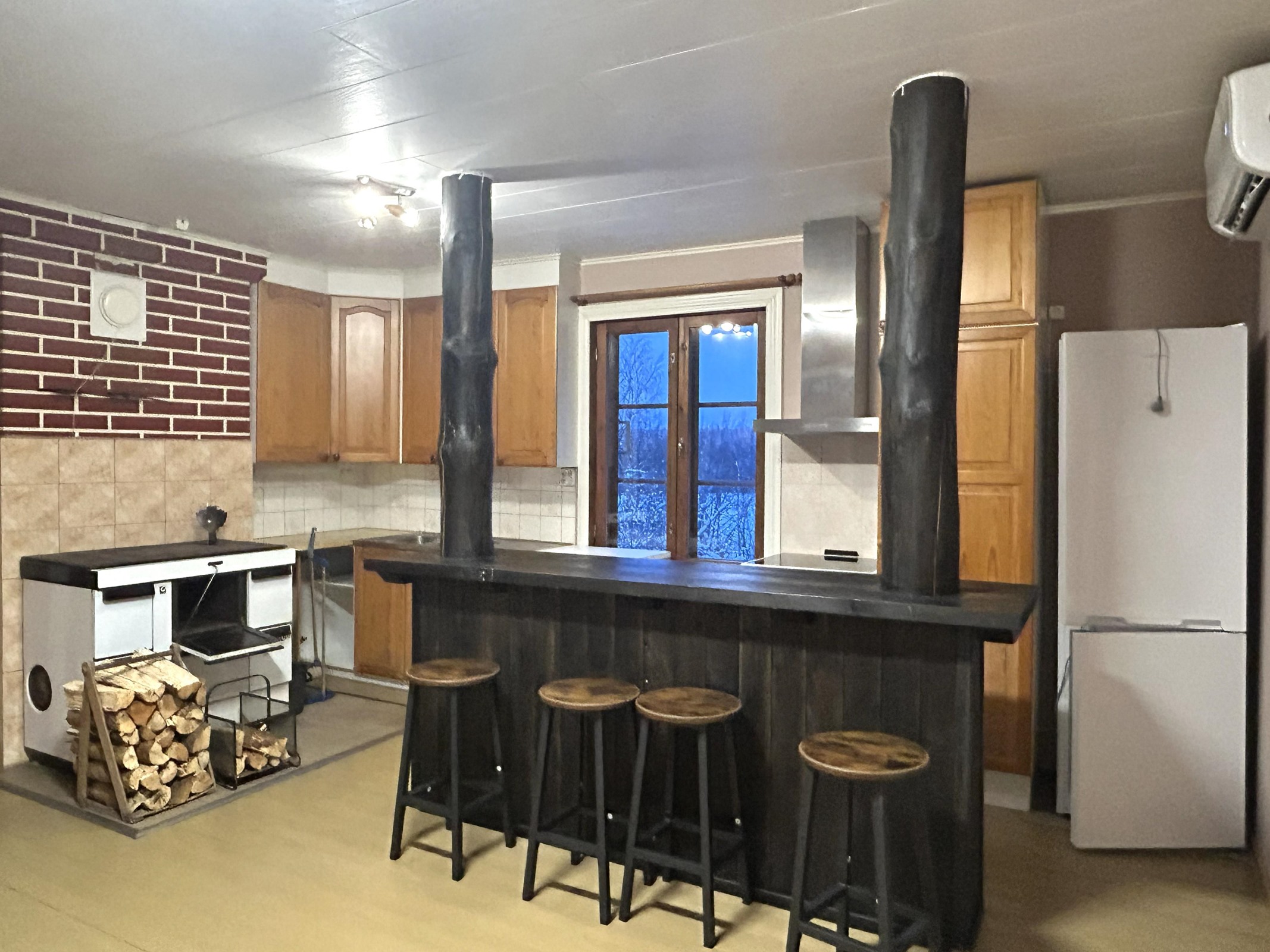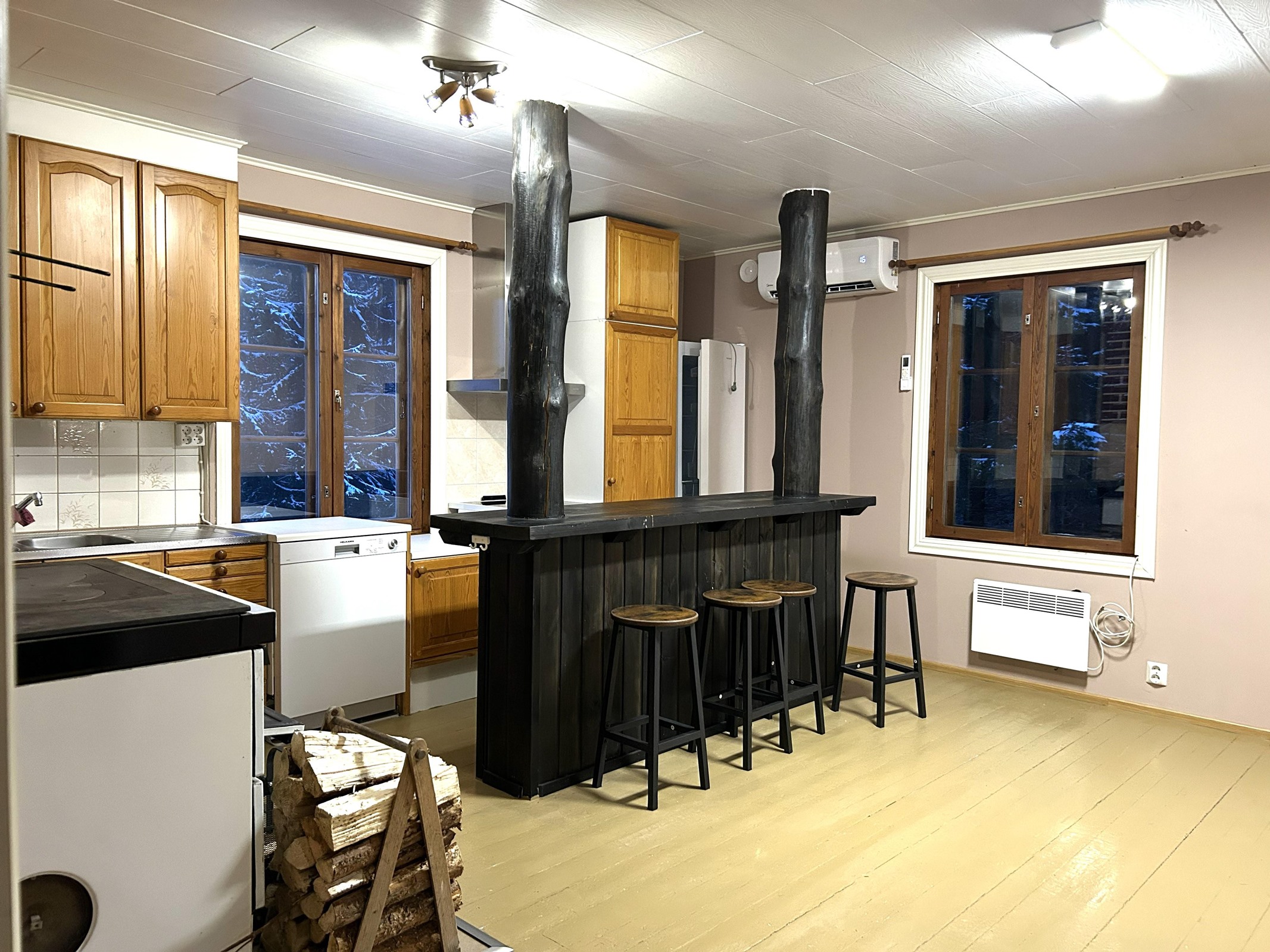 - Jääkaappipakastin, sähköliesi Keraaminen liesitaso, liesituuletin, astianpesukone, kaapistot, kiinteät valaisimet, Puuhella.