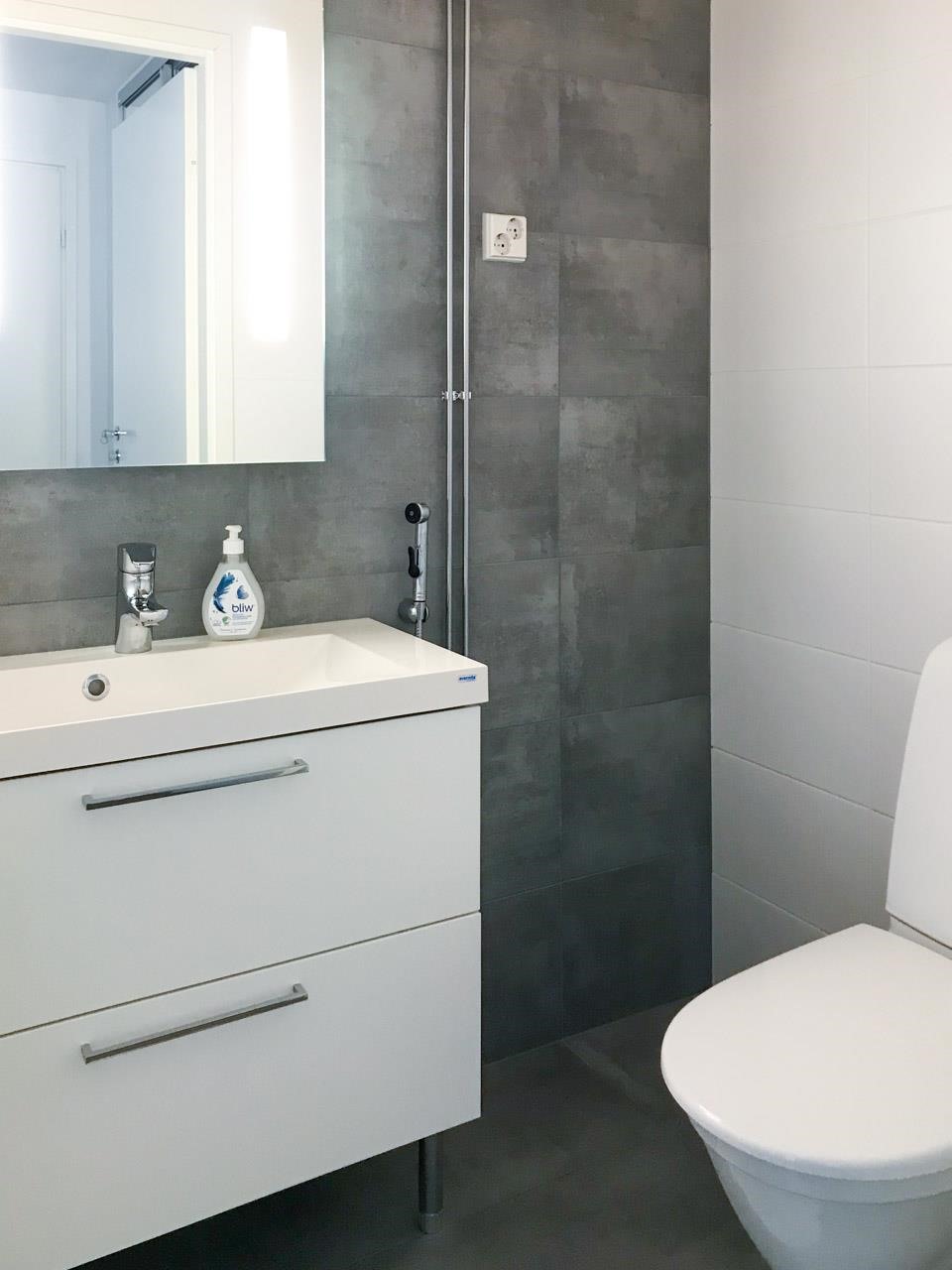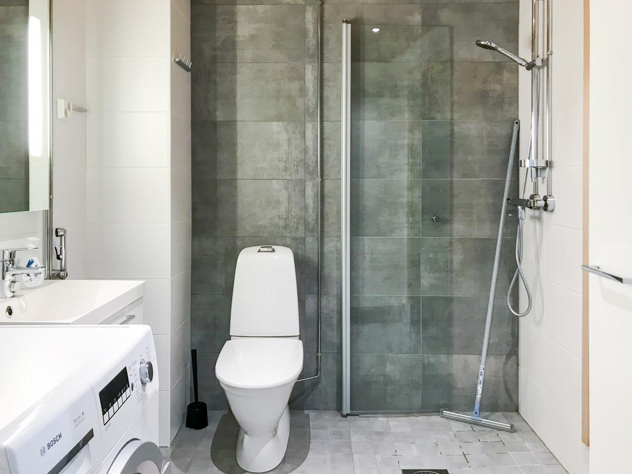 - Sauna, sähkökiuas, kylpyhuone, erillinen wc, suihku, suihkuseinä, peilit, kaapit, allaskaappi, kiinteät valaisimet, Pyykinpesukone.