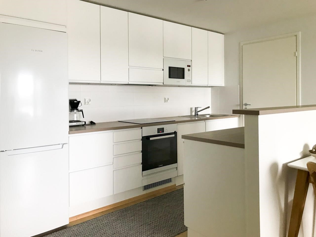 - Jääkaappipakastin, erillisuuni, keraaminen liesi, mikroaaltouuni, astianpesukone, kaapistot, kiinteät valaisimet.