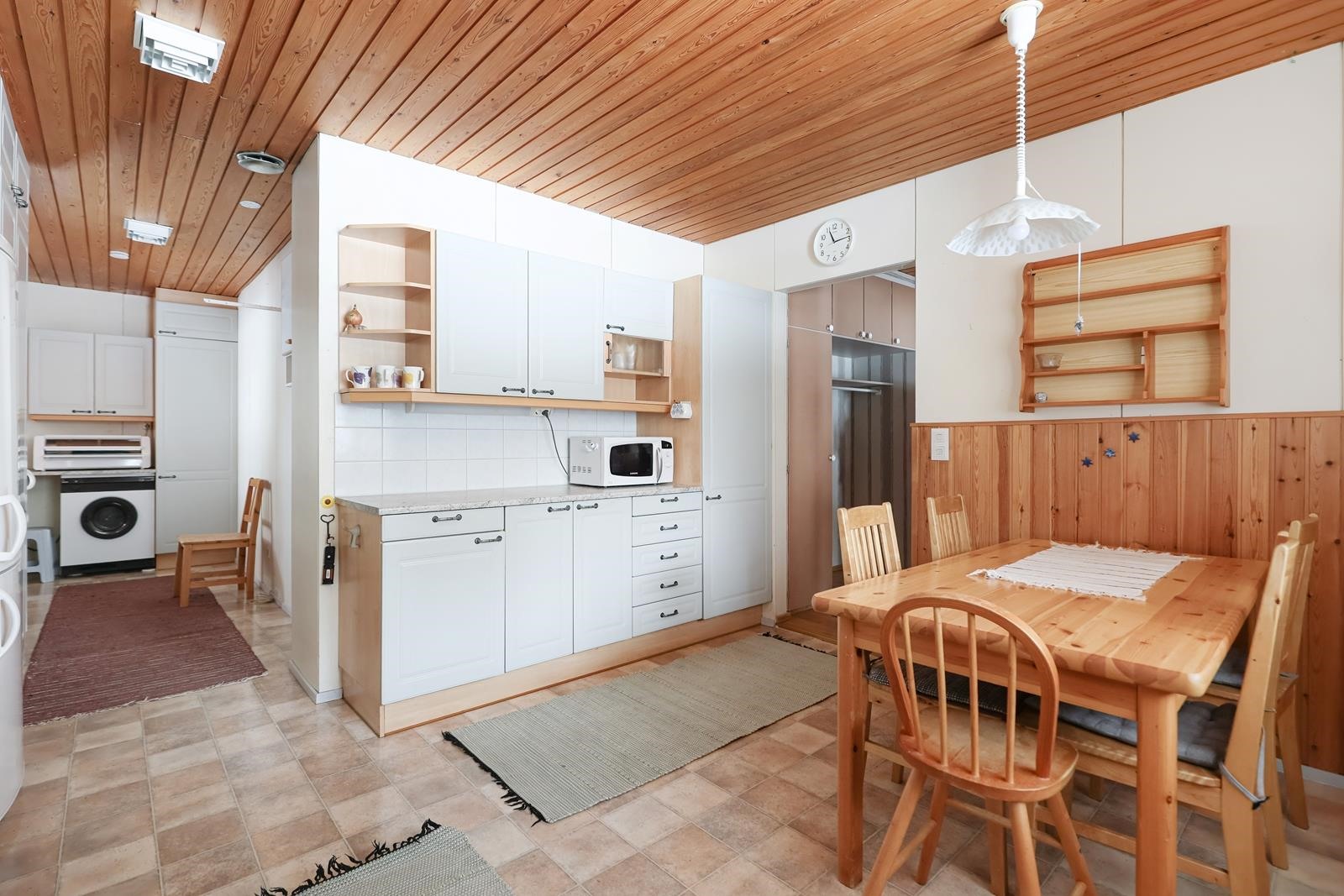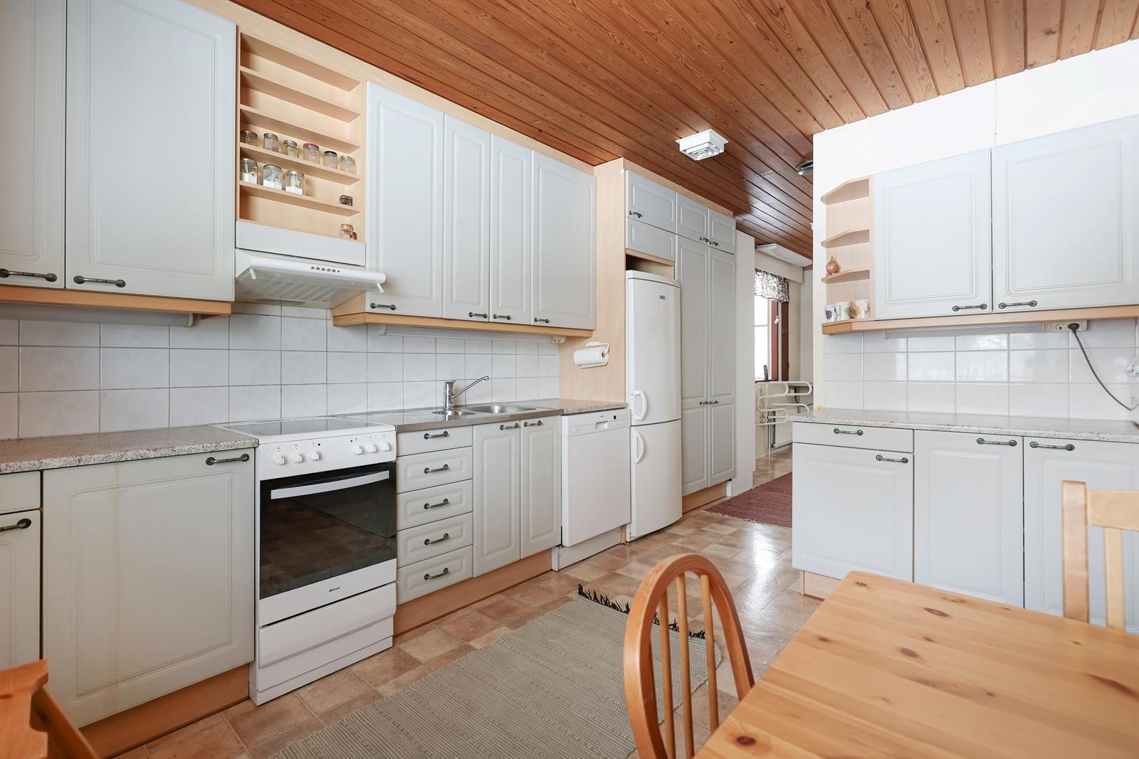 - Jääkaappipakastin, lattialiesi, keraaminen liesi, liesituuletin, astianpesukone, kaapistot, kiinteät valaisimet, pöytätasojen materiaali laminaatti.