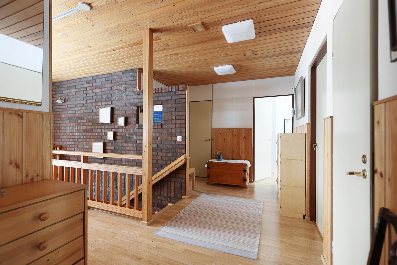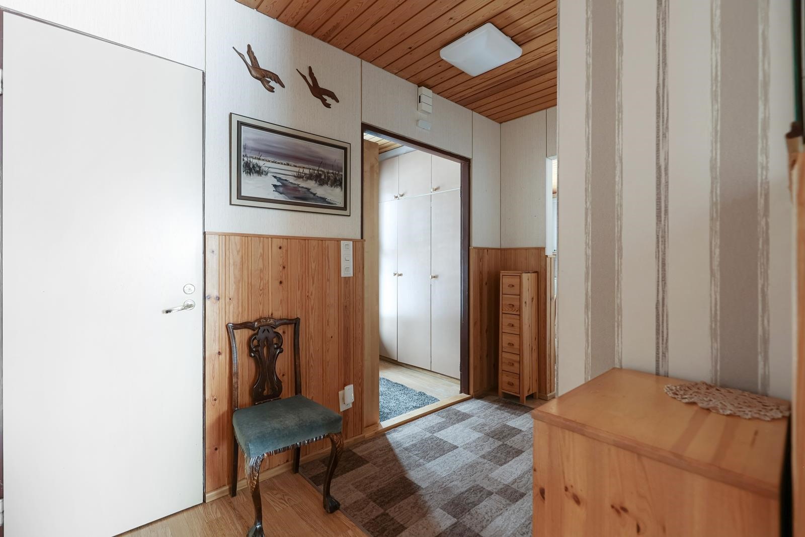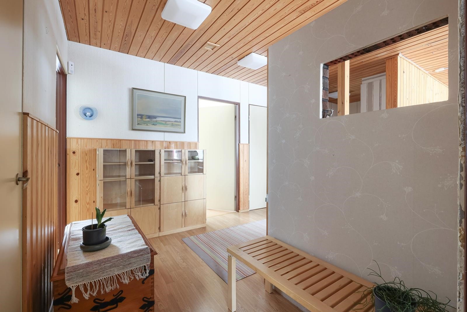 Keittiö: muovimatto, puolipaneeli. Olohuone: laminaattilattia, paneeli. Makuuhuone 1: laminaatti, lastulevyseinät. Makuuhuone 2: laminaatti, lastulevyseinät. Kodinhoitohuone: muovimatto, seinät maalattu, katto paneloitu. Sauna: laattalattia. Kylpyhuone: laattalattoa, laatta seinissä. Eteinen: laminaattilattia, puolipaneeli. Wc: laattalattia, laatta seinissä.