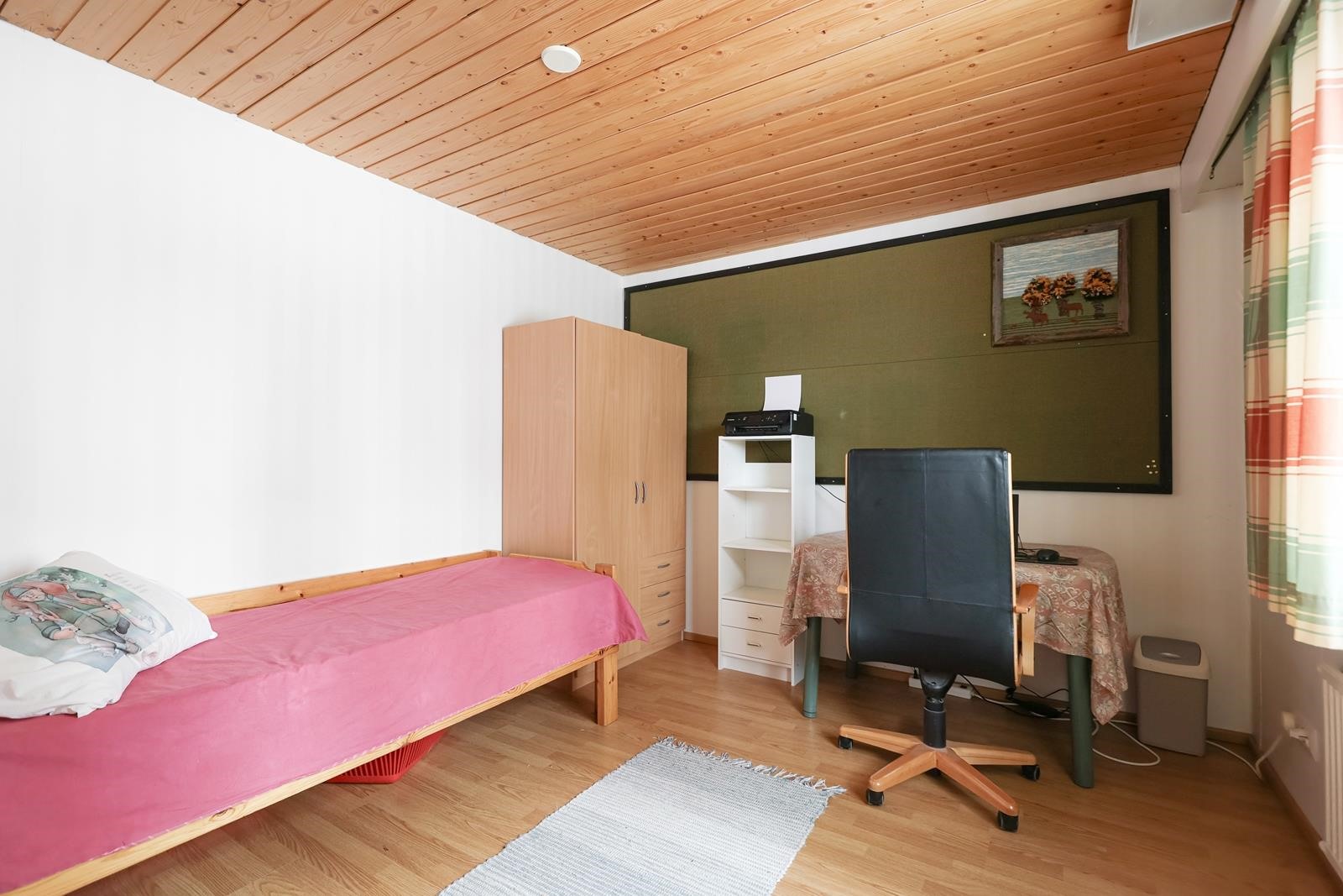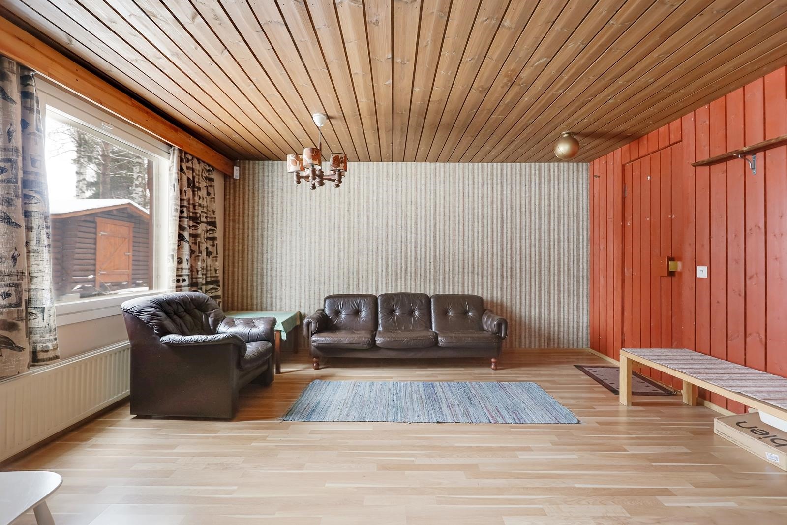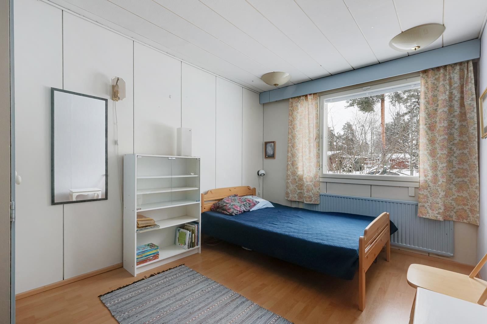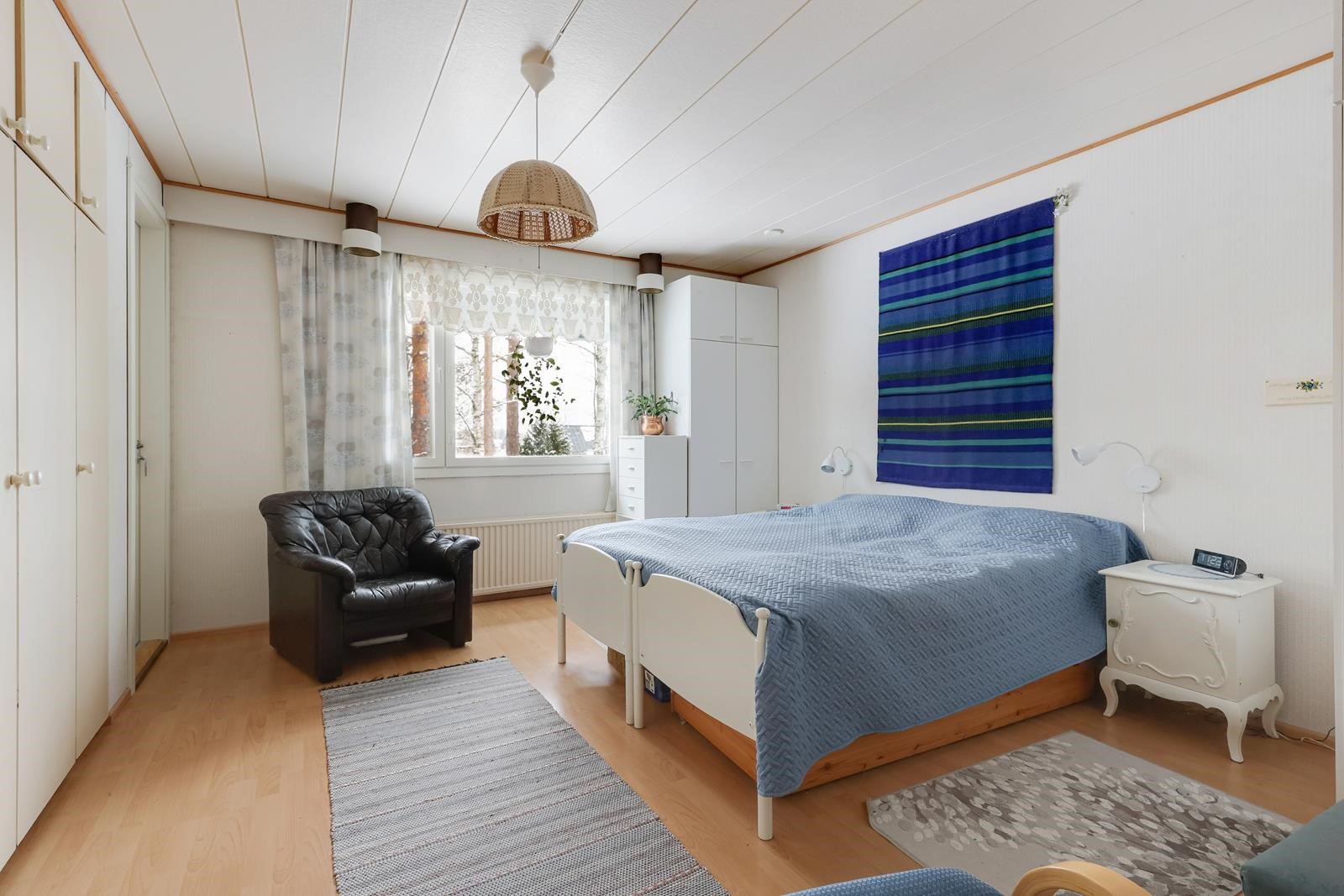 Keittiö: muovimatto, puolipaneeli. Olohuone: laminaattilattia, paneeli. Makuuhuone 1: laminaatti, lastulevyseinät. Makuuhuone 2: laminaatti, lastulevyseinät. Kodinhoitohuone: muovimatto, seinät maalattu, katto paneloitu. Sauna: laattalattia. Kylpyhuone: laattalattoa, laatta seinissä. Eteinen: laminaattilattia, puolipaneeli. Wc: laattalattia, laatta seinissä.