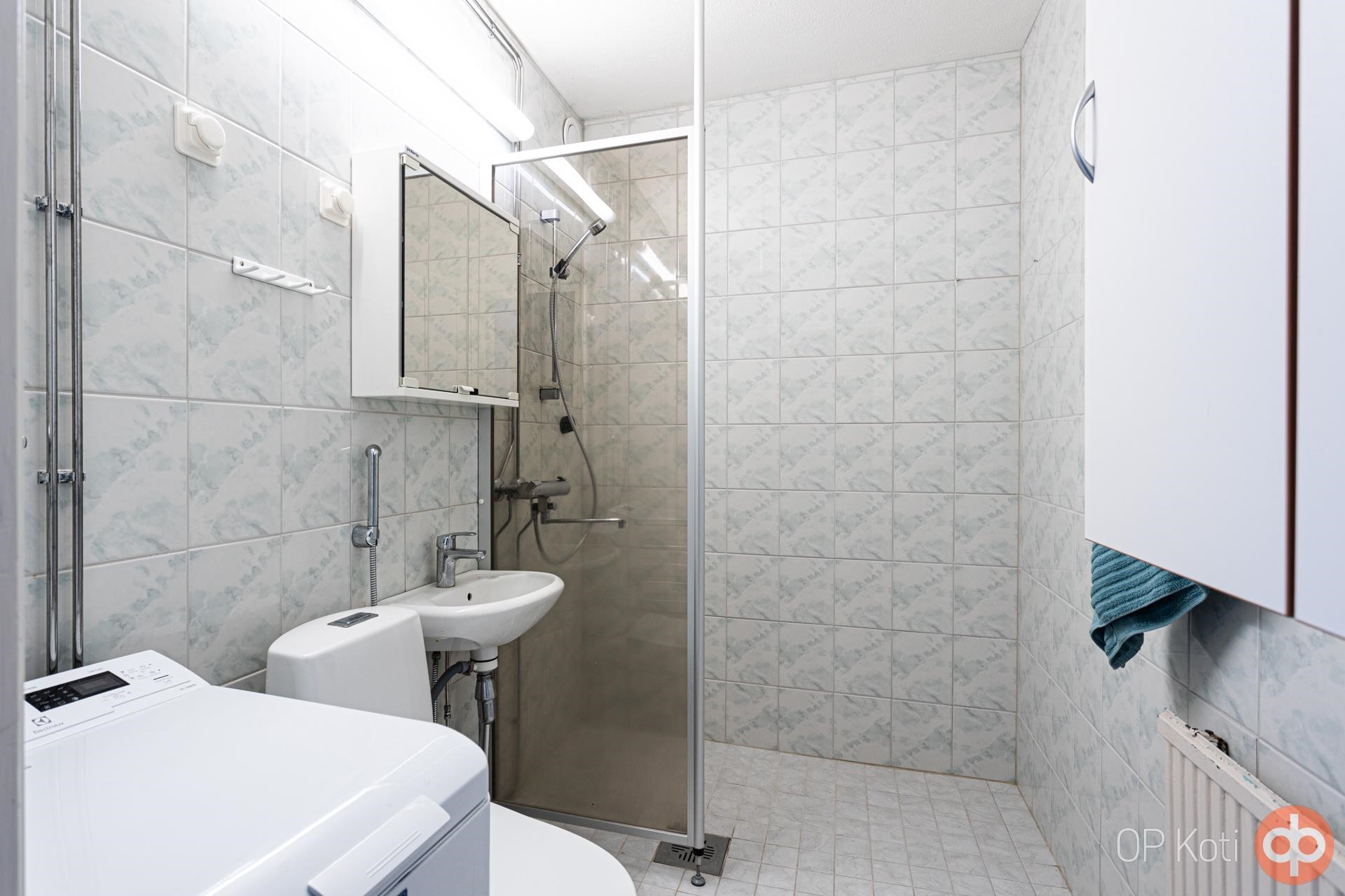 - Kylpyhuone, suihku, suihkuseinä, peilikaappi, kaapit, pesukoneliitäntä, kiinteät valaisimet.