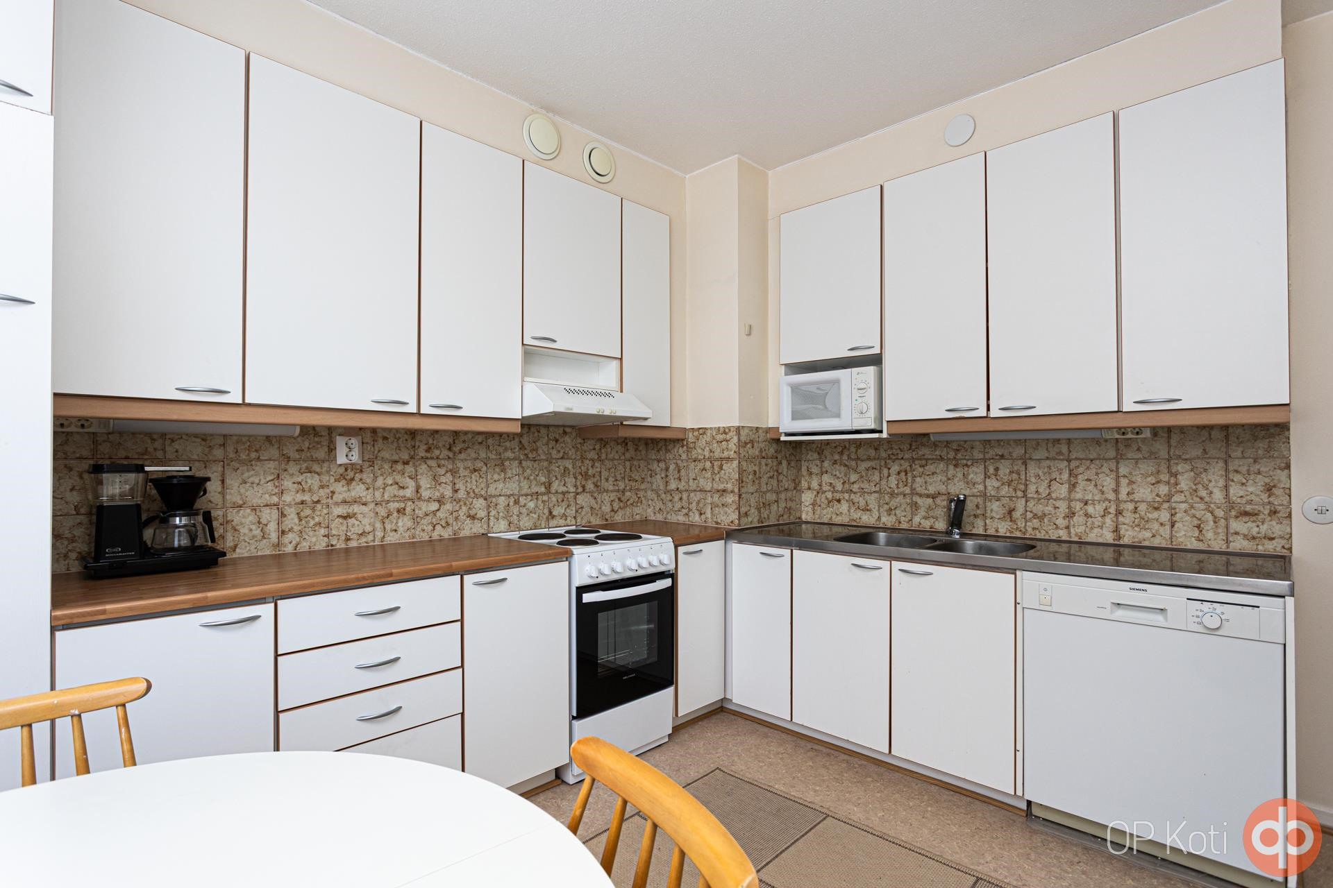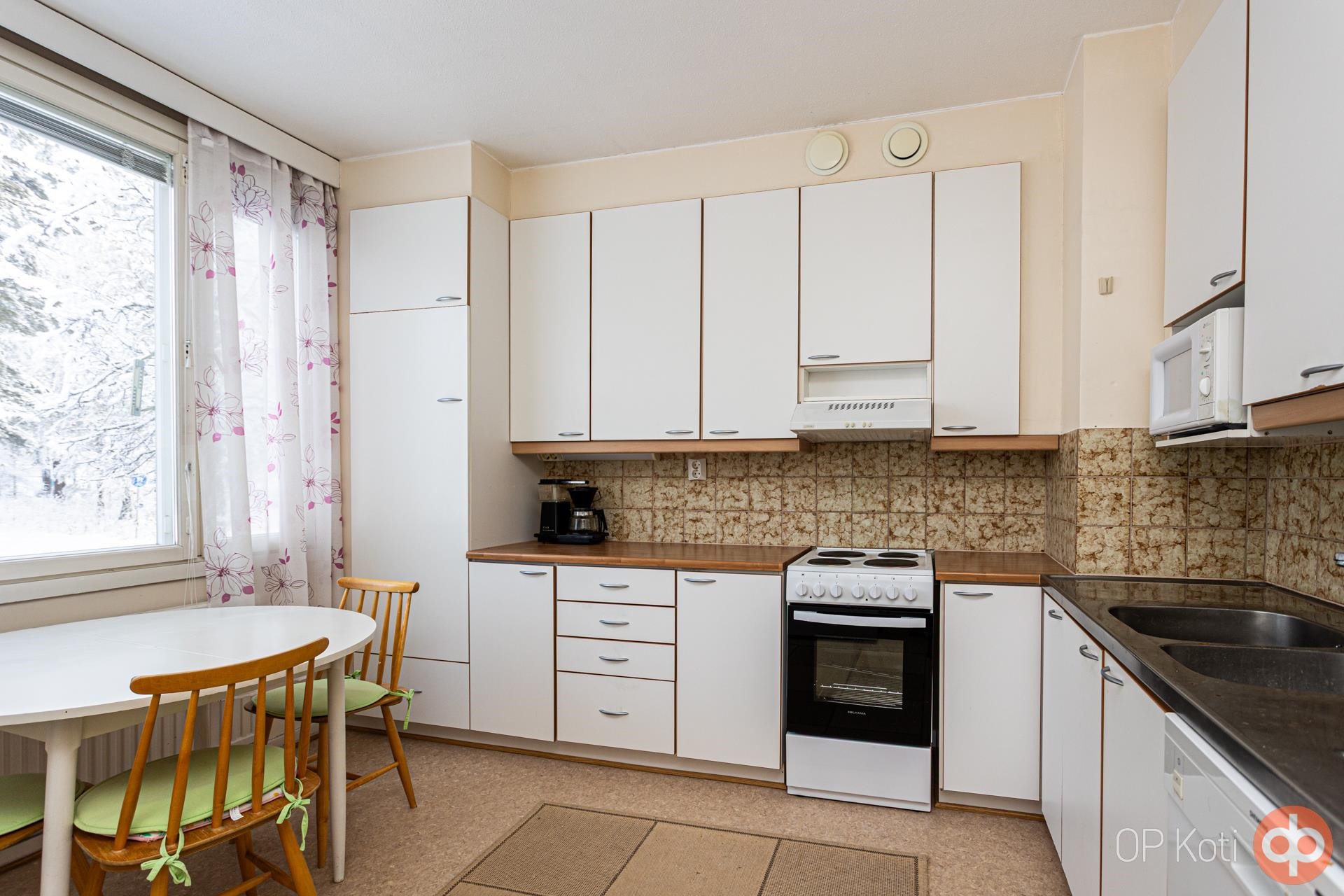 - Jääkaappi, jääkaappipakastin, sähköliesi, liesituuletin, astianpesukone, kaapistot, kiinteät valaisimet.