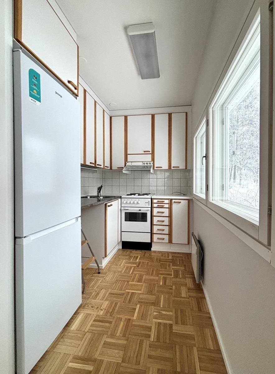 - Keittiössä jääkaappipakastin, sähköliesi, liesituuletin ja kaapistot.
