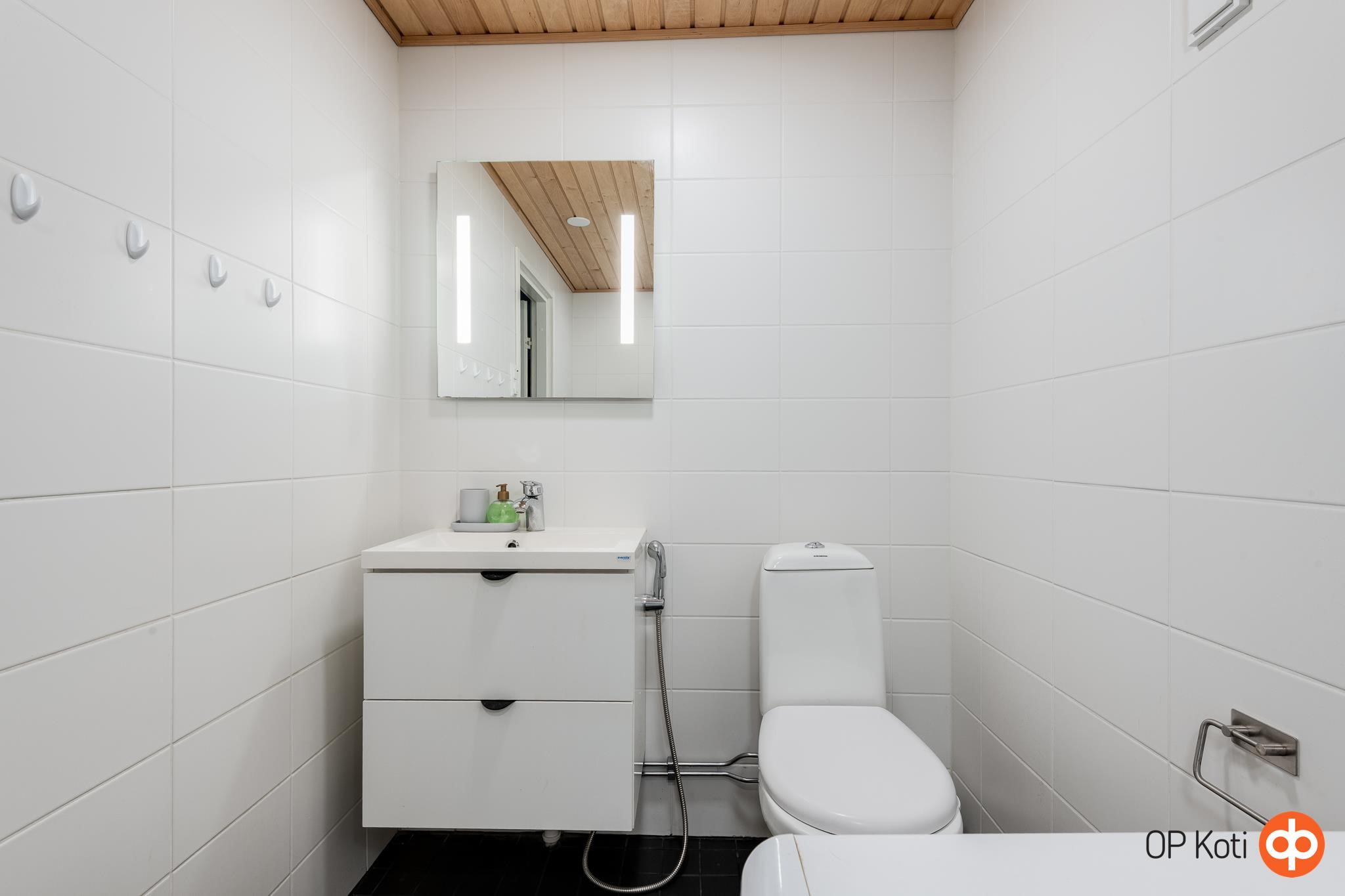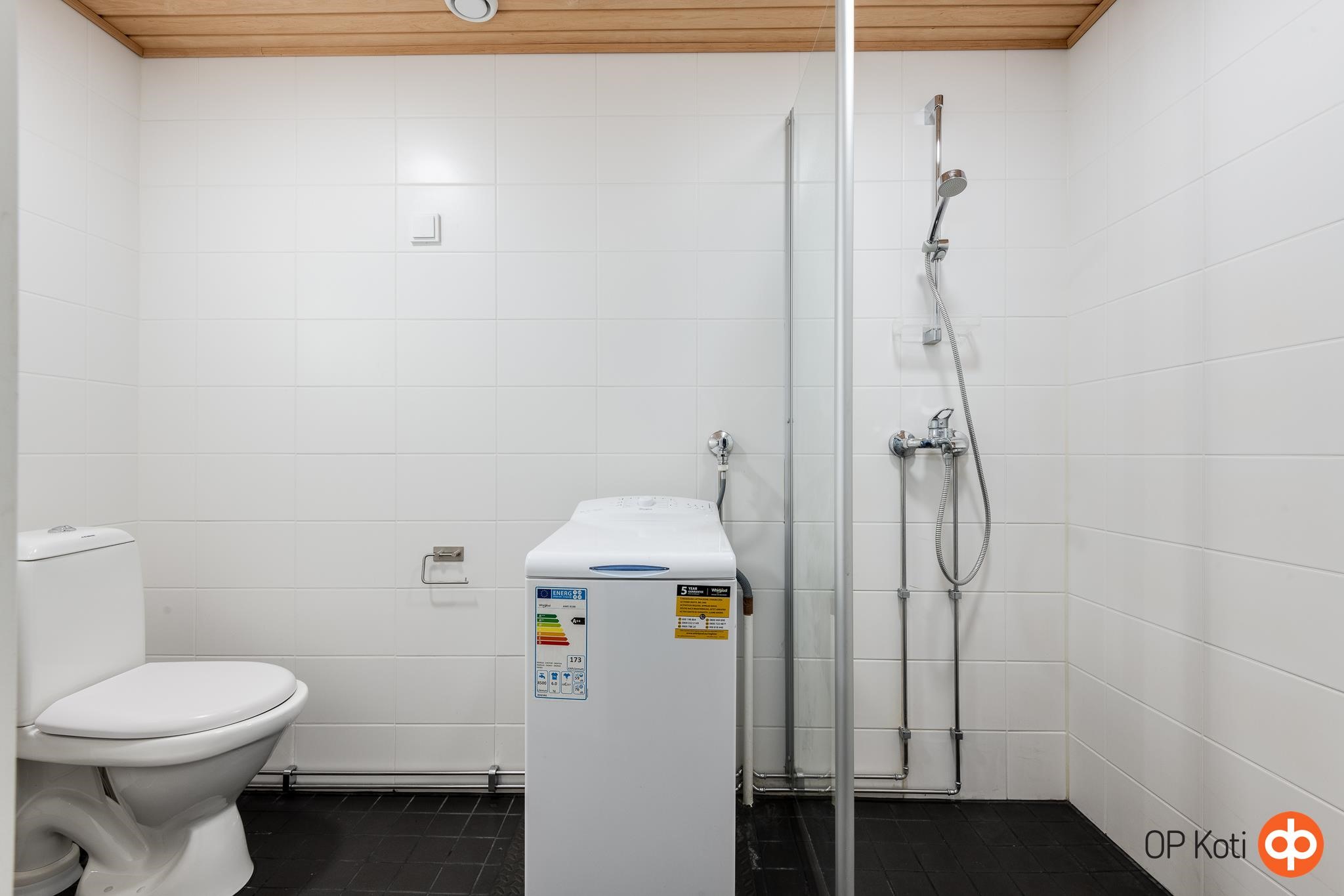 - Kylpyhuone, suihku, suihkuseinä, peilikaappi, allaskaappi, pesukoneliitäntä, lattialämmitys, kiinteät valaisimet.