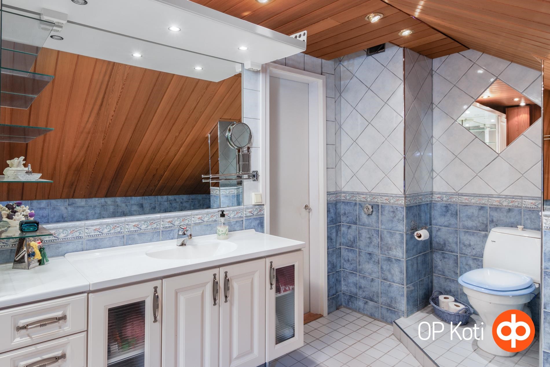 - Sauna, puukiuas, kylpyhuone, erillinen wc, suihku, amme, peilit yläkerran kph, peilikaappi wc:ssä, kaapit, allaskaappi, pesukoneliitäntä kellarikerroksessa, lattialämmitys yläkerran kph (sähköinen), kiinteät valaisimet. Yläkerran kylpyhuone rakennettu v. 1999.