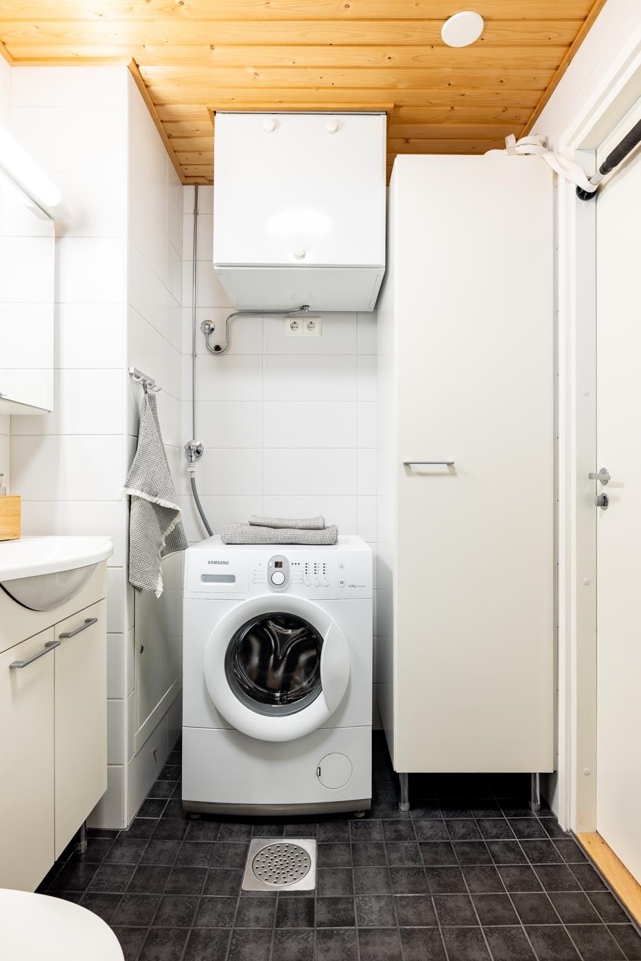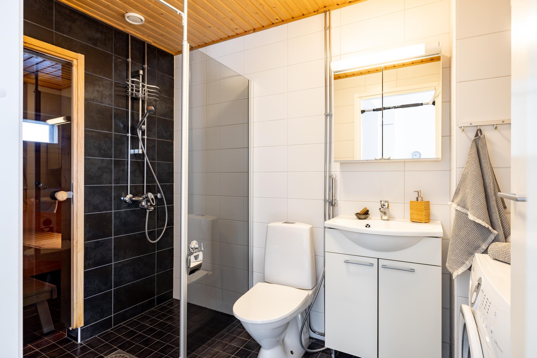 - Kylpyhuoneessa : WC, sauna sähkökiukaalla, suihku ja suihkuseinä, peilikaappi ja allaskaappi, kaapisto, pesukoneliitäntä, lattialämmitys ja kiinteät valaisimet.