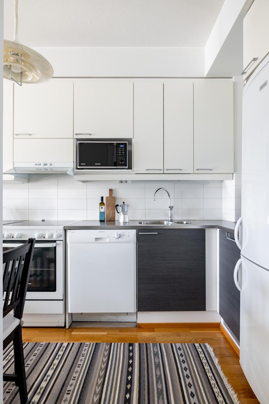 - Keittiössä : Jääkaappipakastin, lattialiesi ja liesikupu, astianpesukone, kaapistot ja kiinteät valaisimet.